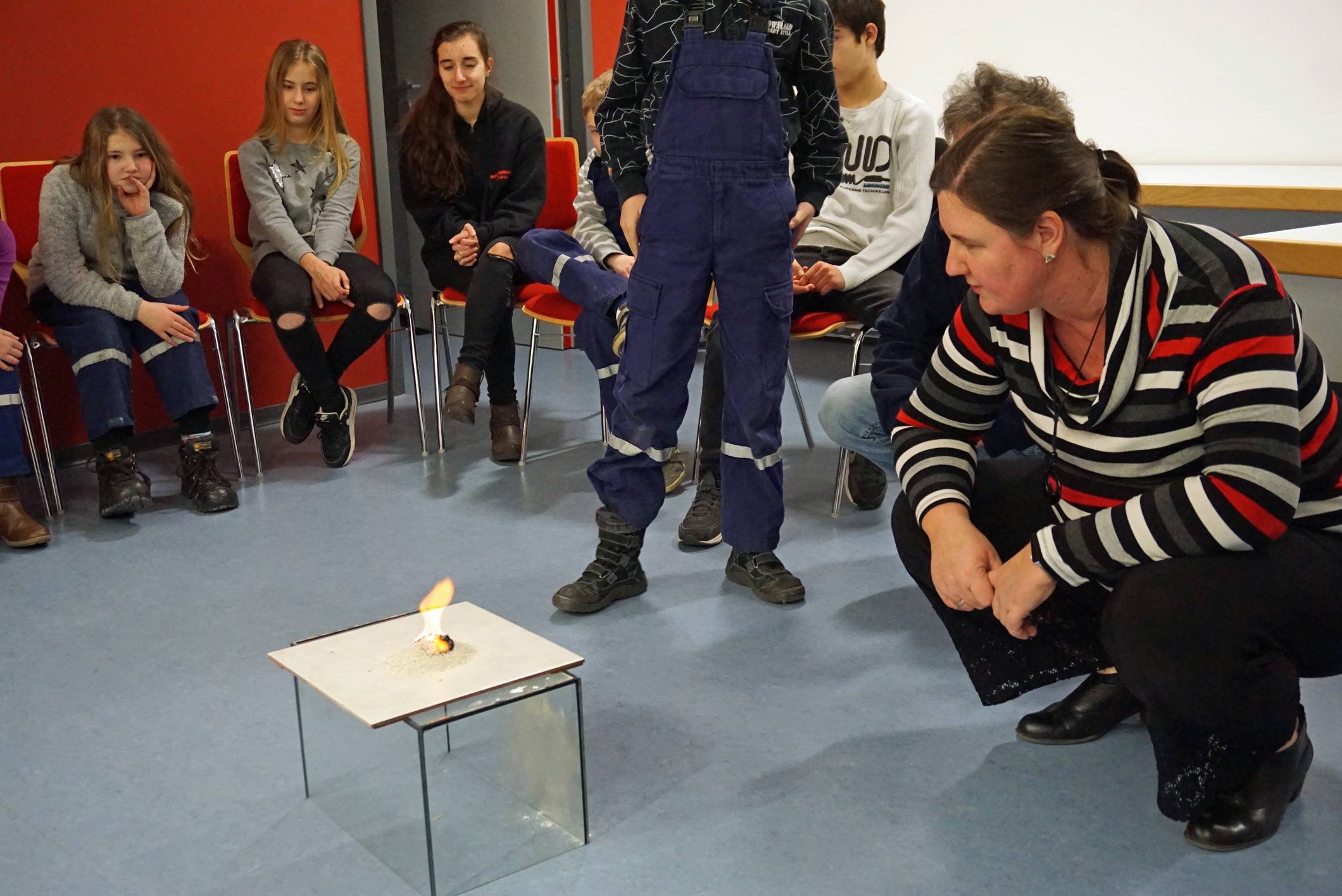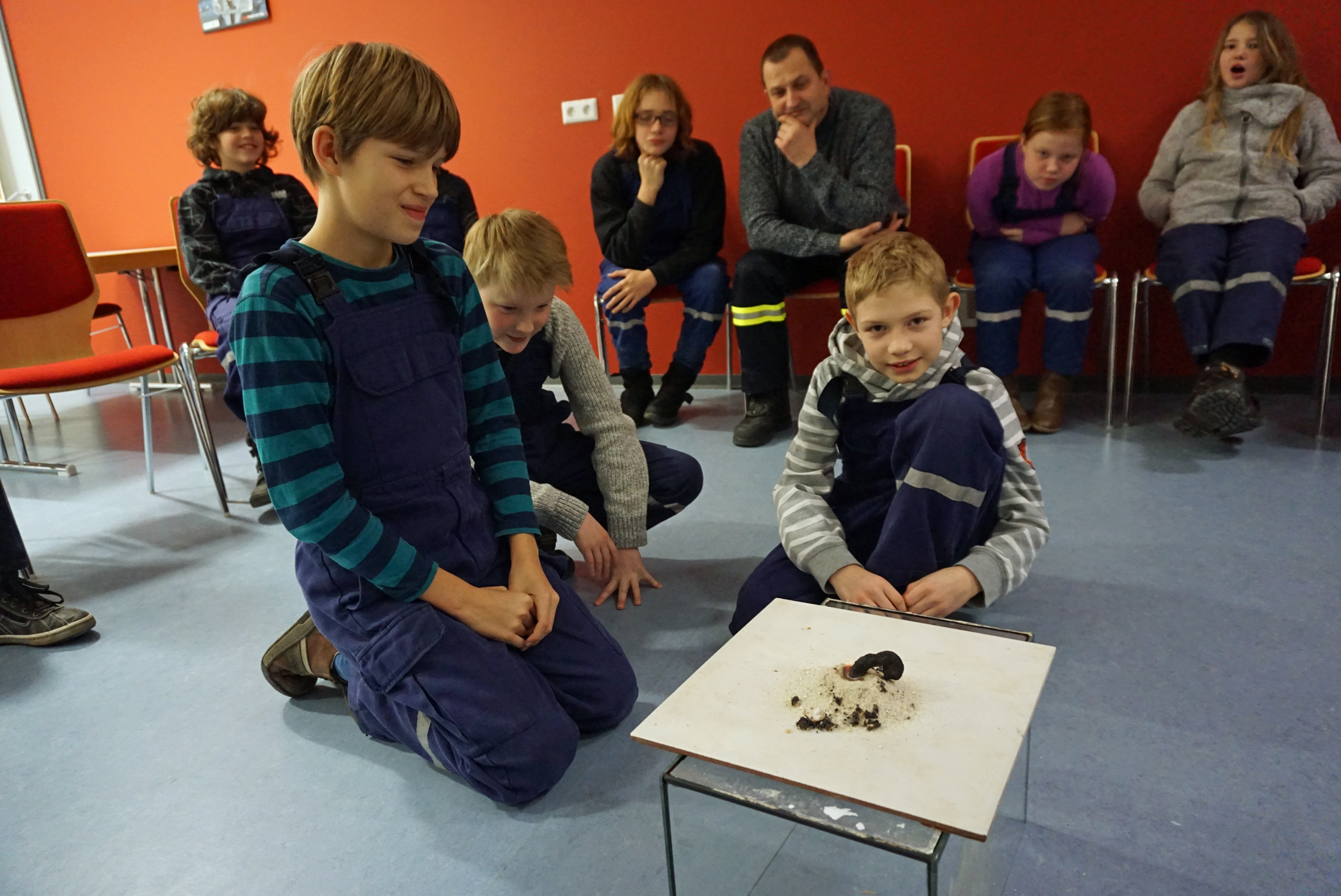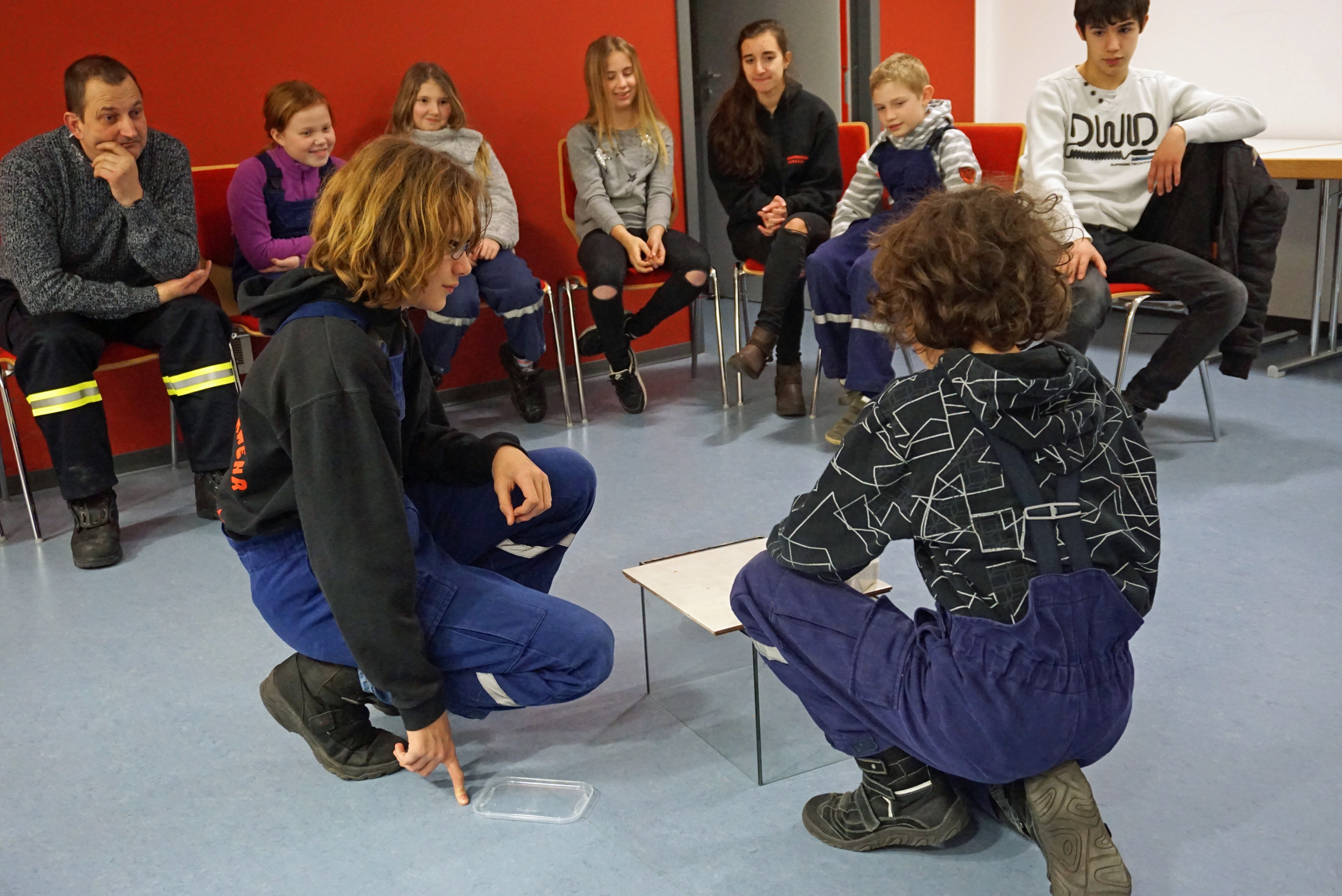 Die Jugendfeuerwehr widmete sich bei diesem Treffen ganz dem Experimentieren. Natürlich sollte alles irgendwie mit Feuer zu tun haben, und so wurden schnell verschiedenste Flammen und Feuerbälle gezaubert. Die Experimente um brennende Geldscheine, Wunderkerzen, Mehlstaub- und Fettexplosionen und CO2 waren aber auch immer lehrreich, denn schließlich muss man sich bei der Feuerwehr mit Feuer auskennen und auch wissen, mit welchen Löschmitteln man zum Erfolg kommen kann. Dass man mit Wunderkerzen vorsichtig sein muss, man in Backstuben keine Kerze anzünden sollte und die Friteuse bloß nicht mit Wasser gelöscht werden darf, ist auf jeden Fall klar geworden.