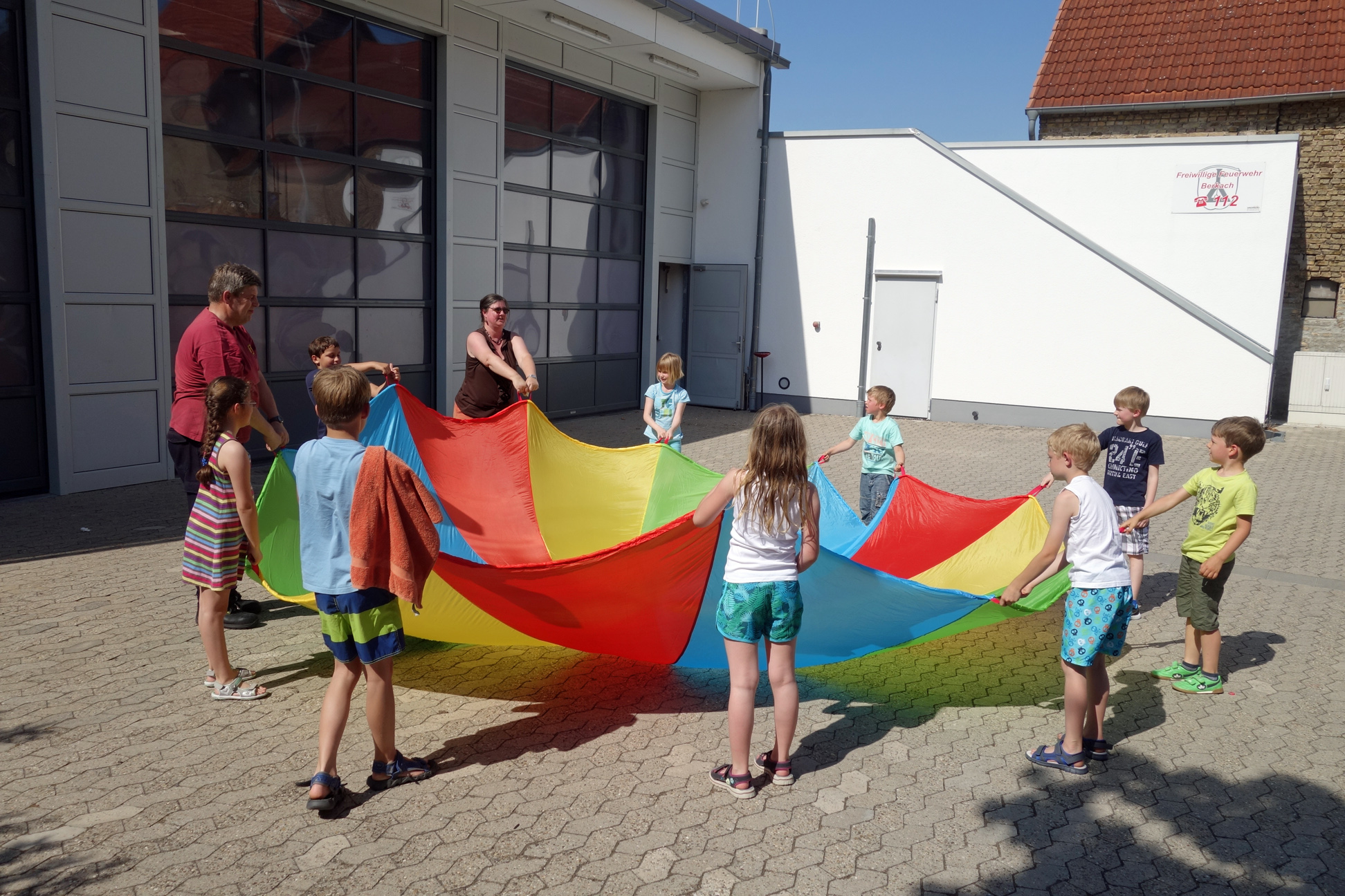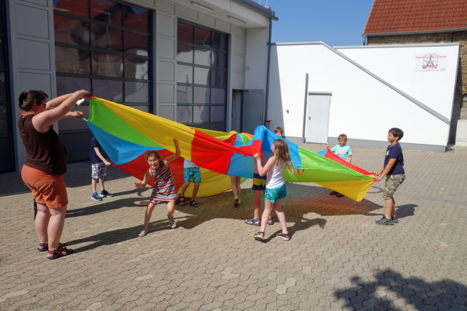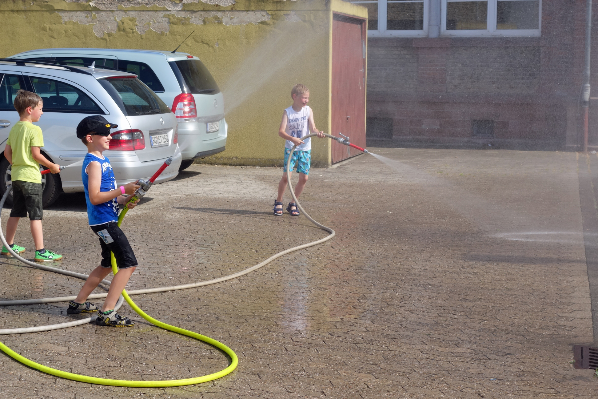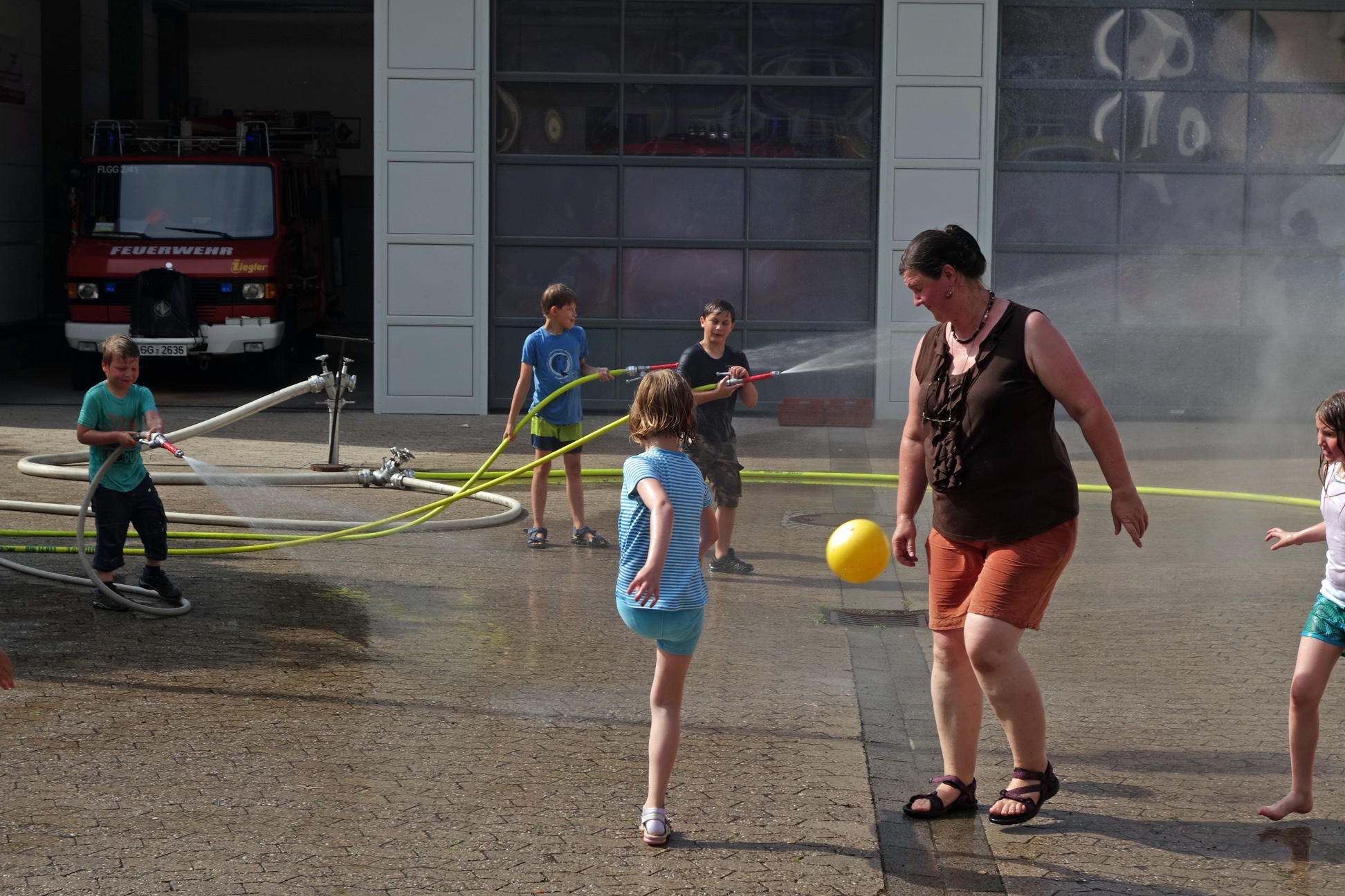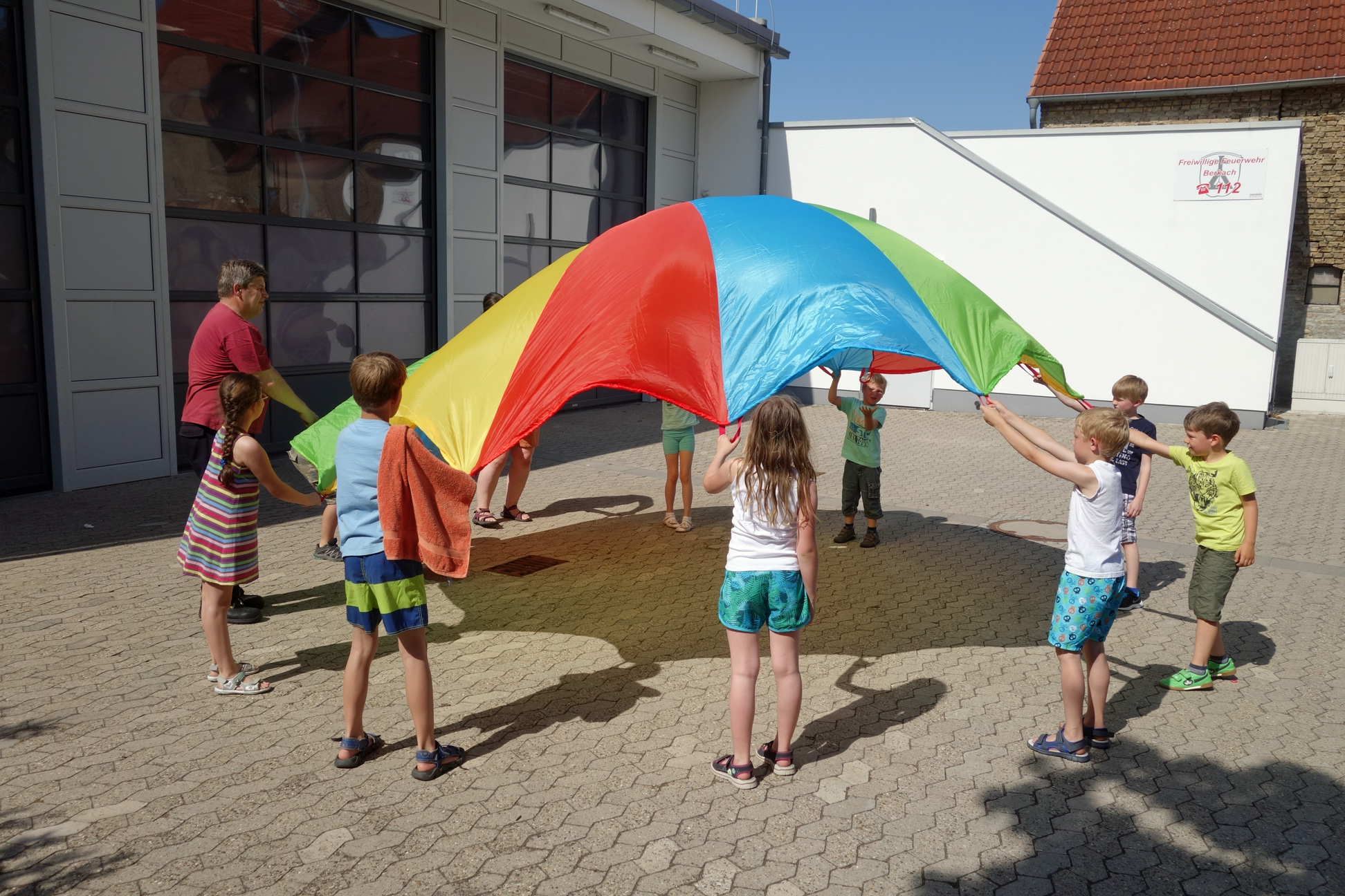 Nachdem die Feuervögel erfahren hatten, was ein Sprungtuch ist, nahmen sie selbst ein großes Tuch in die Hand. Das wurde allerdings nicht zum Springen verwendet sondern mit Elan geschwungen. Erstaunlich, welch ein Gewusel solch ein Tuch verursachen kann. Bei über 30°C gerieten wir dabei natürlich mächtig ins Schwitzen. Daher kamen wir um eine Abkühlung gar nicht herum. Schnell waren Schläuche angeschlossen und ein "Wasser marsch!" erklang. Es war eine Freude anzusehen, wie wenig wasserscheu die Feuervögel waren, wobei auch die Betreuer nicht so ganz trocken nach Hause gingen.