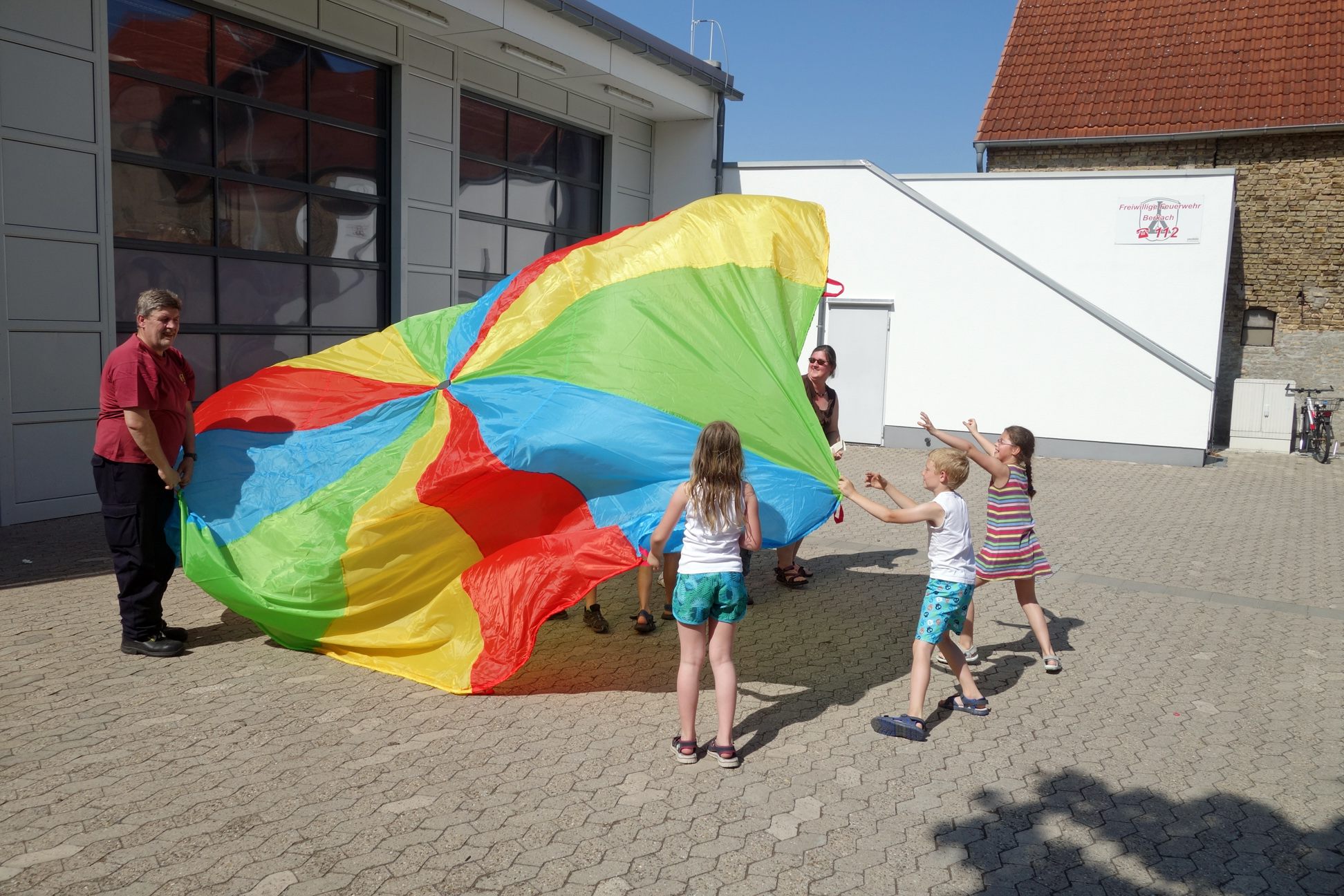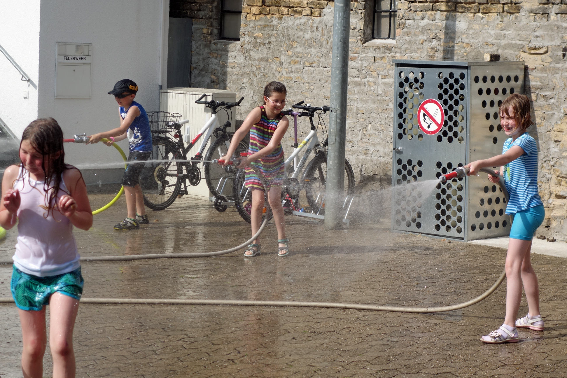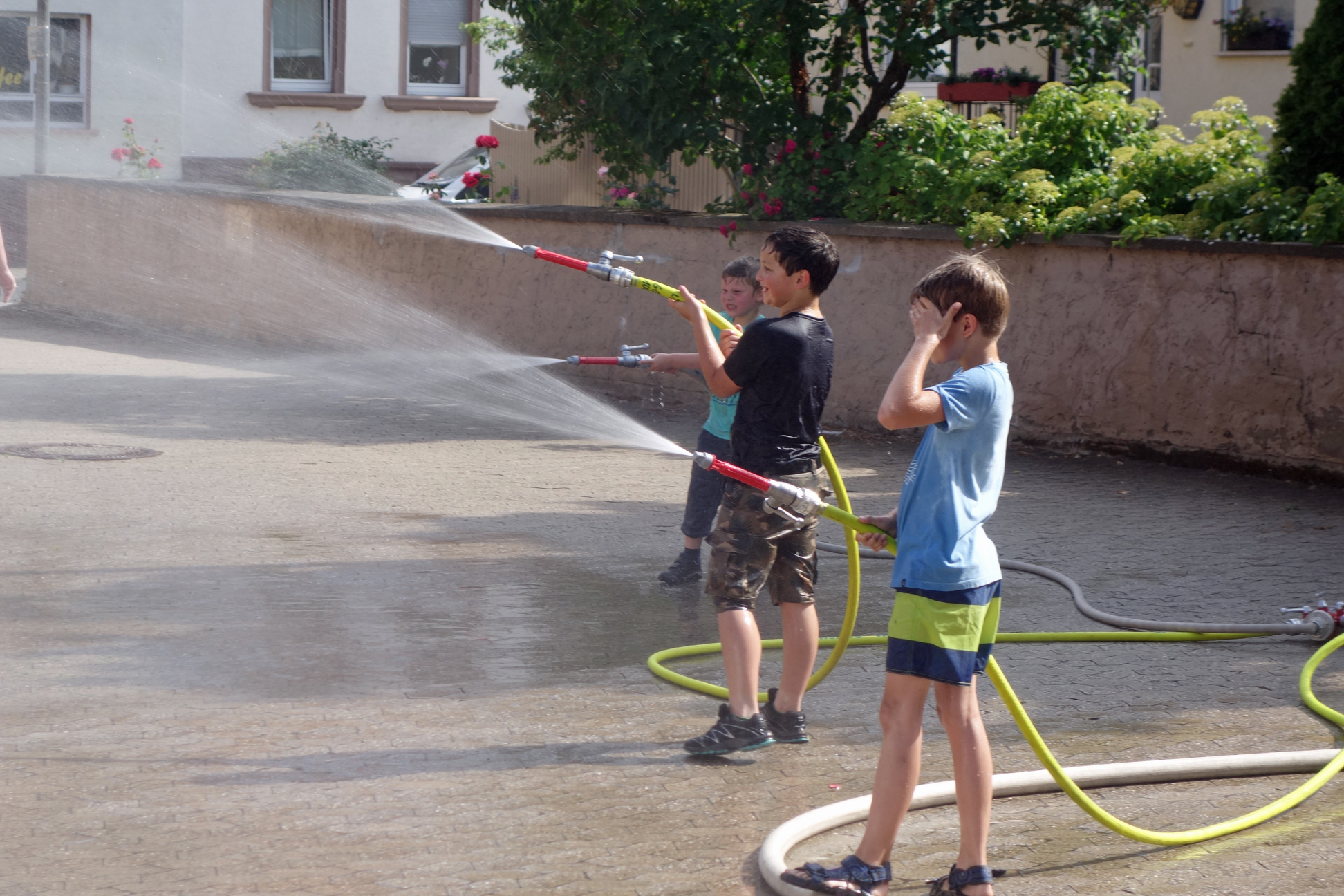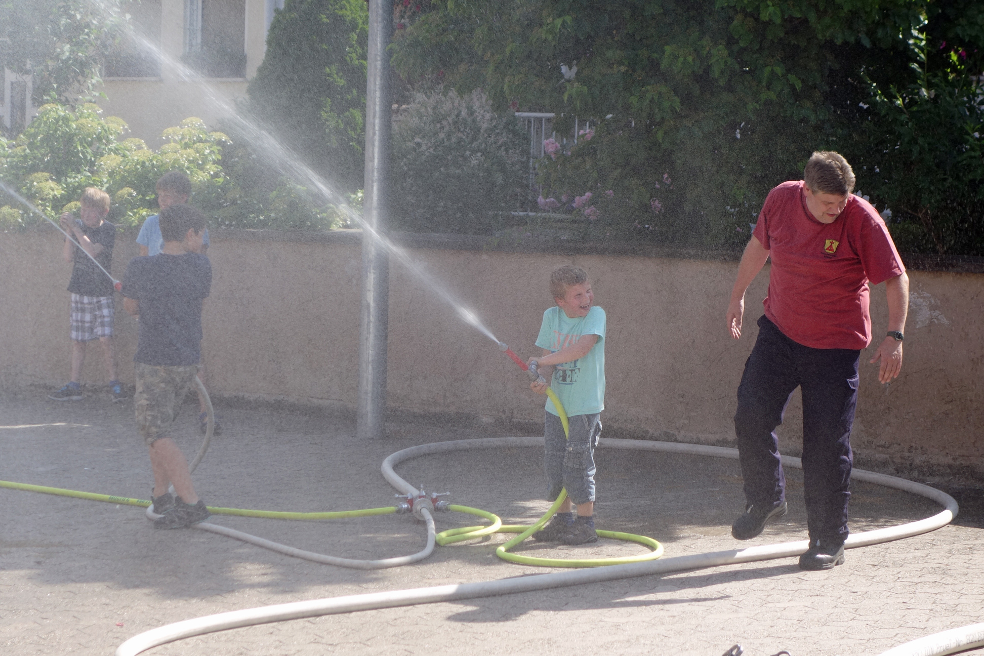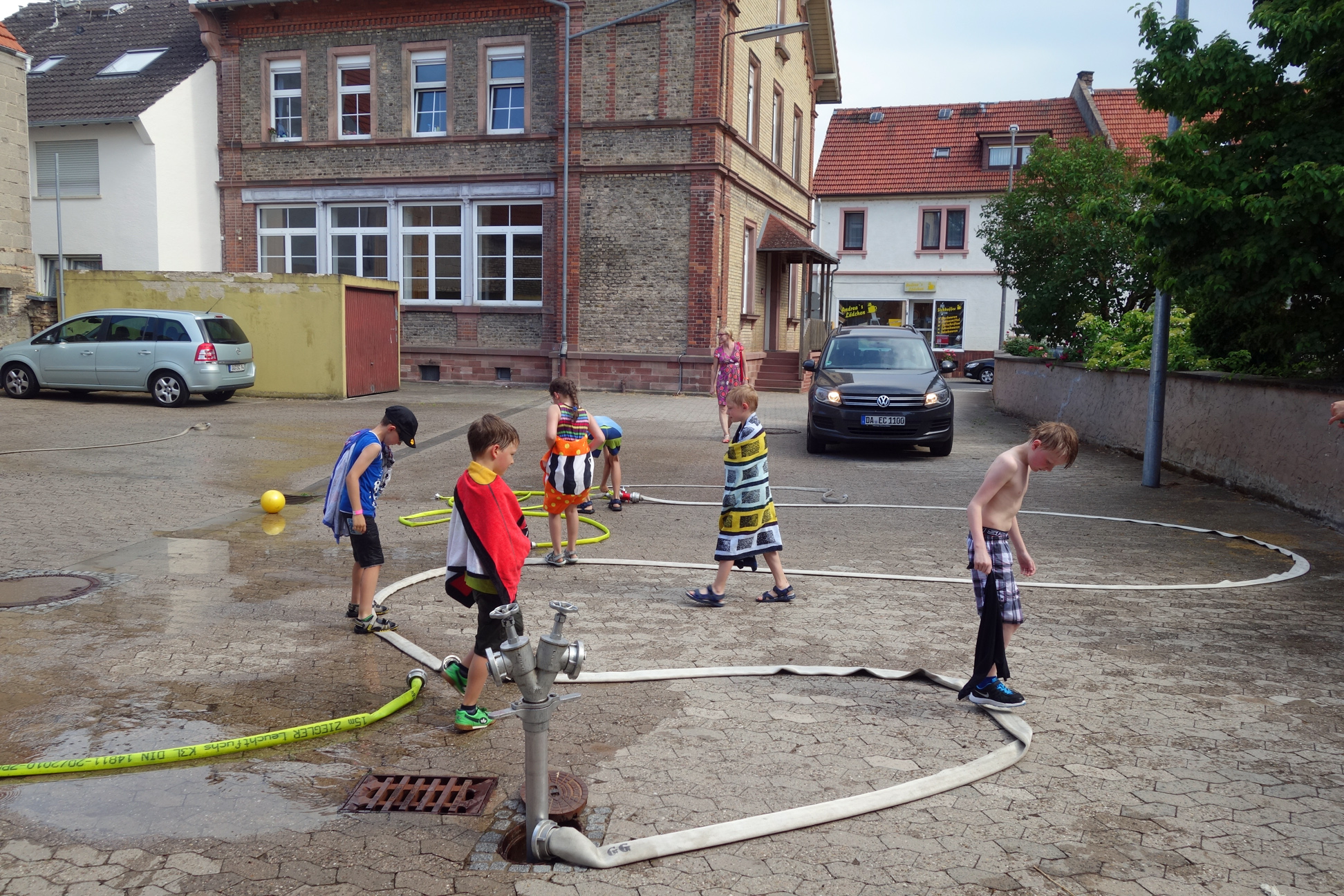 Nachdem die Feuervögel erfahren hatten, was ein Sprungtuch ist, nahmen sie selbst ein großes Tuch in die Hand. Das wurde allerdings nicht zum Springen verwendet sondern mit Elan geschwungen. Erstaunlich, welch ein Gewusel solch ein Tuch verursachen kann. Bei über 30°C gerieten wir dabei natürlich mächtig ins Schwitzen. Daher kamen wir um eine Abkühlung gar nicht herum. Schnell waren Schläuche angeschlossen und ein "Wasser marsch!" erklang. Es war eine Freude anzusehen, wie wenig wasserscheu die Feuervögel waren, wobei auch die Betreuer nicht so ganz trocken nach Hause gingen.