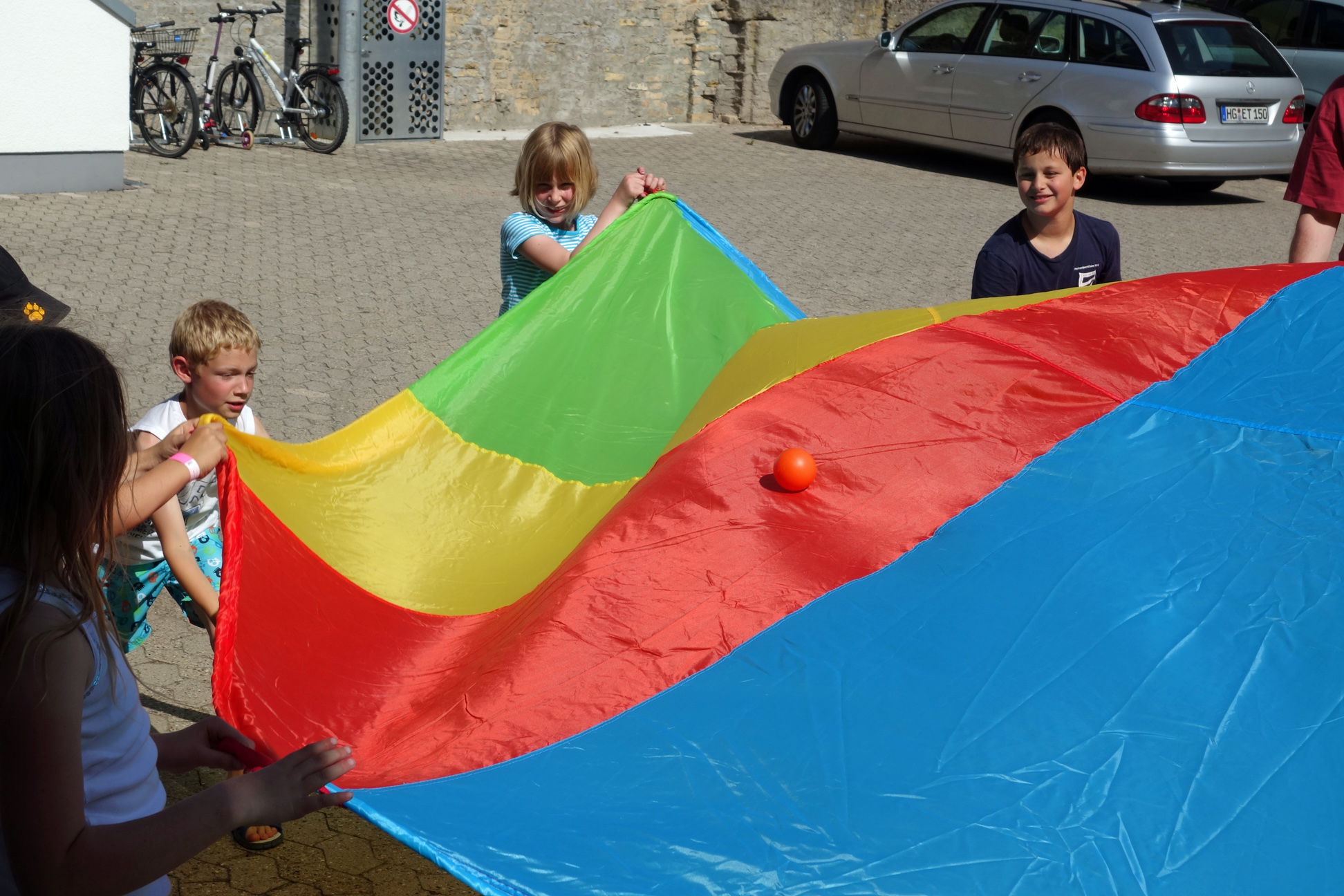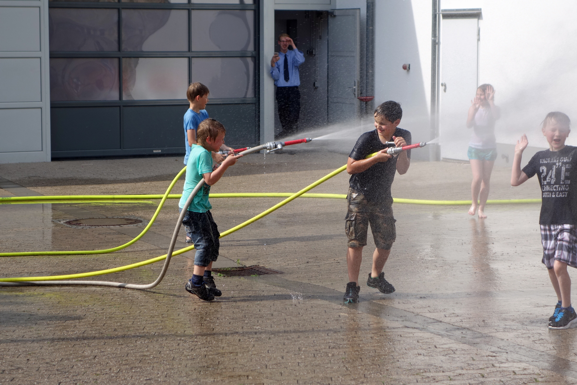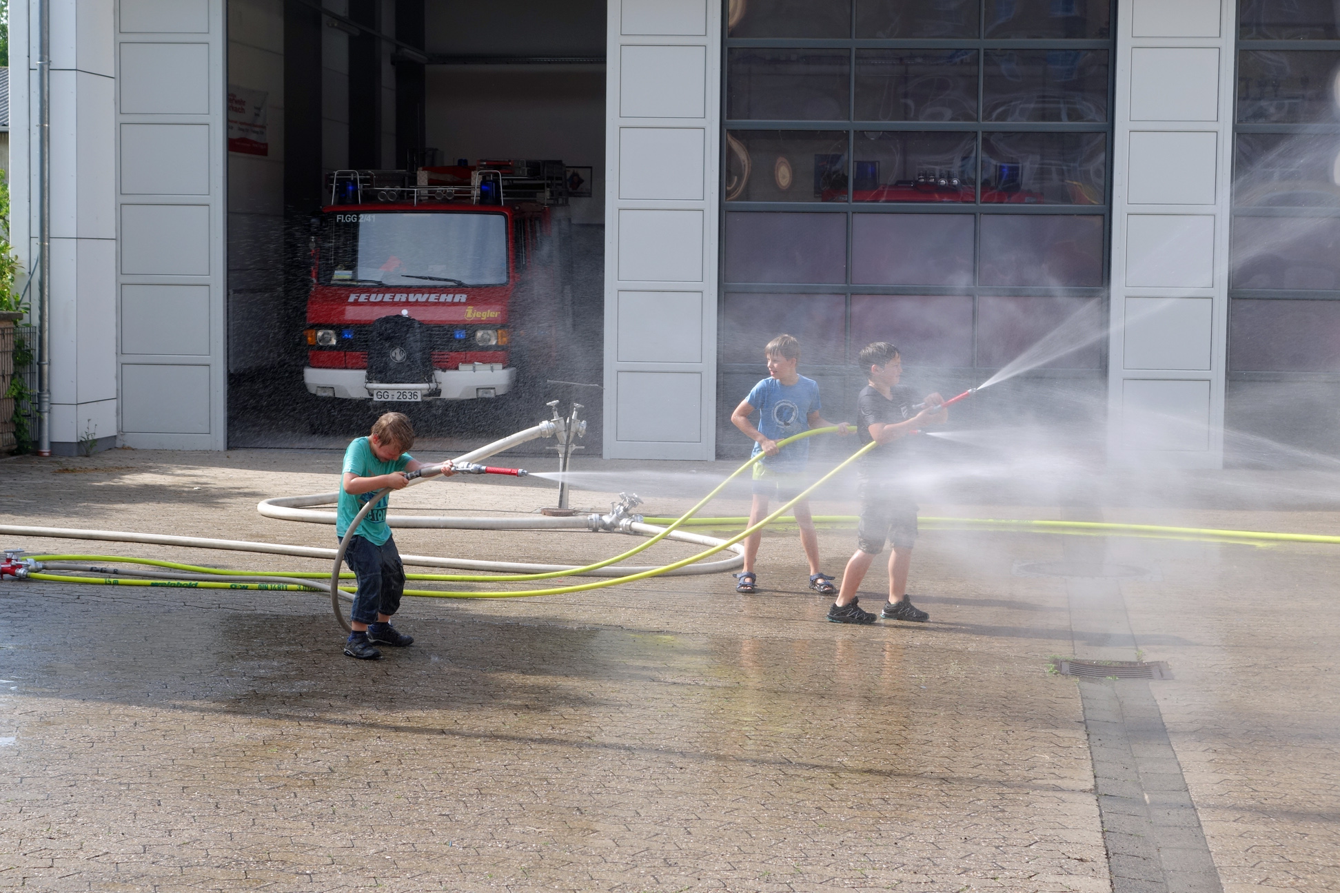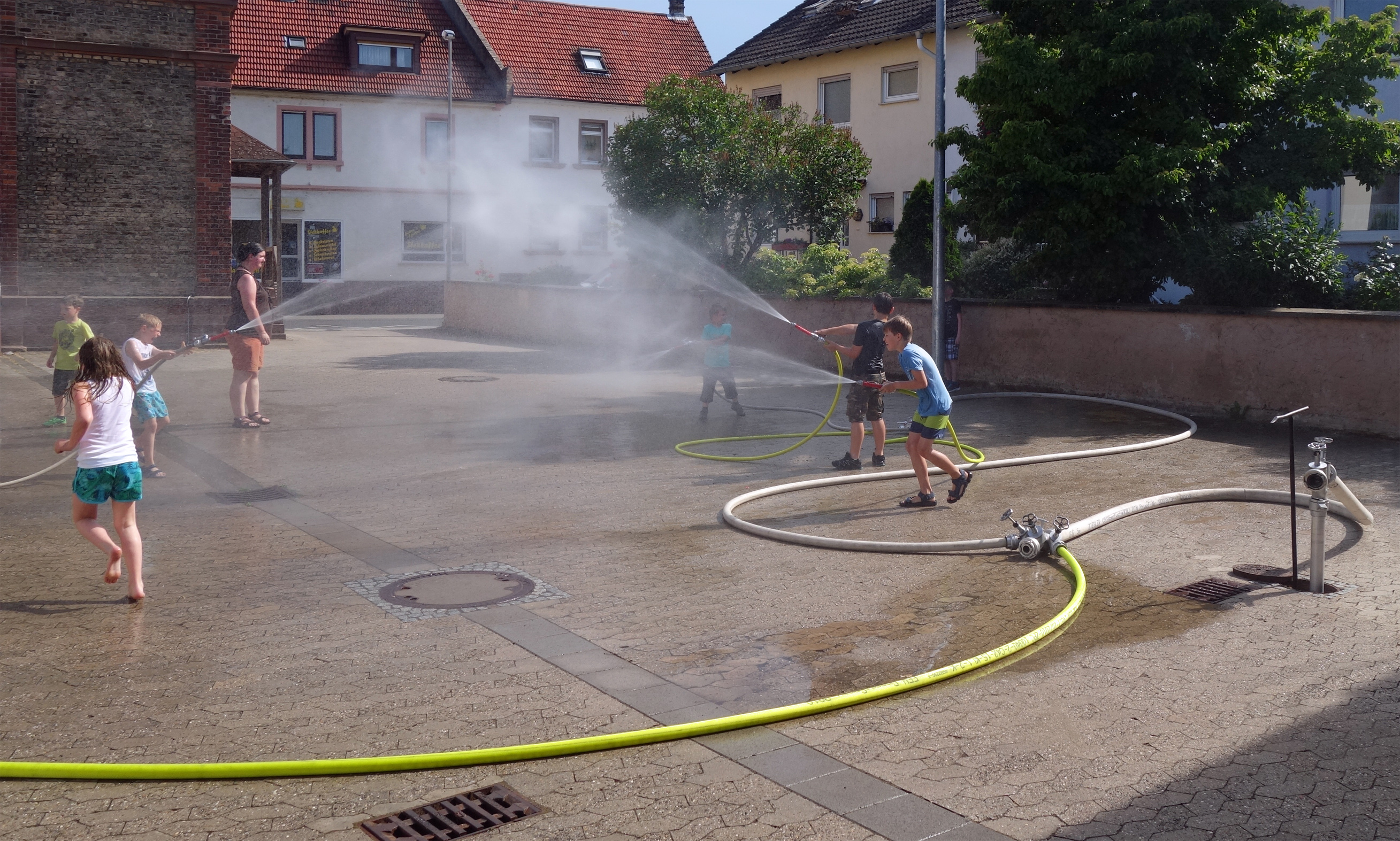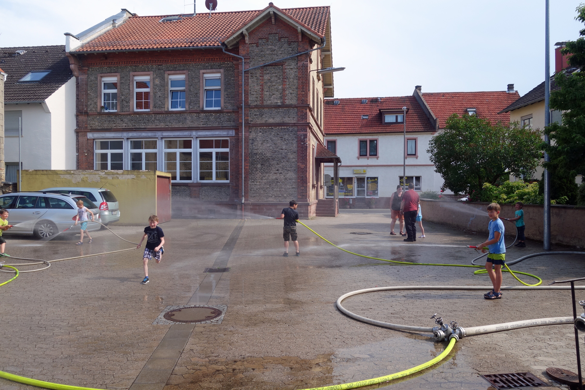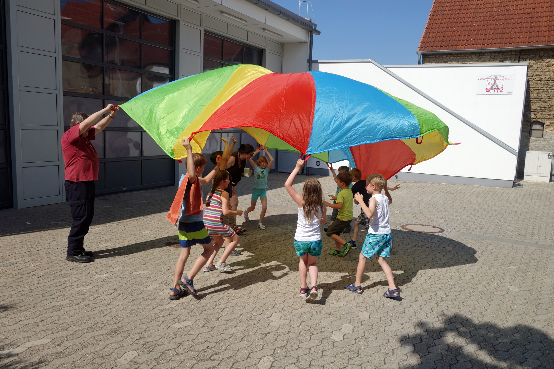 Nachdem die Feuervögel erfahren hatten, was ein Sprungtuch ist, nahmen sie selbst ein großes Tuch in die Hand. Das wurde allerdings nicht zum Springen verwendet sondern mit Elan geschwungen. Erstaunlich, welch ein Gewusel solch ein Tuch verursachen kann. Bei über 30°C gerieten wir dabei natürlich mächtig ins Schwitzen. Daher kamen wir um eine Abkühlung gar nicht herum. Schnell waren Schläuche angeschlossen und ein "Wasser marsch!" erklang. Es war eine Freude anzusehen, wie wenig wasserscheu die Feuervögel waren, wobei auch die Betreuer nicht so ganz trocken nach Hause gingen.