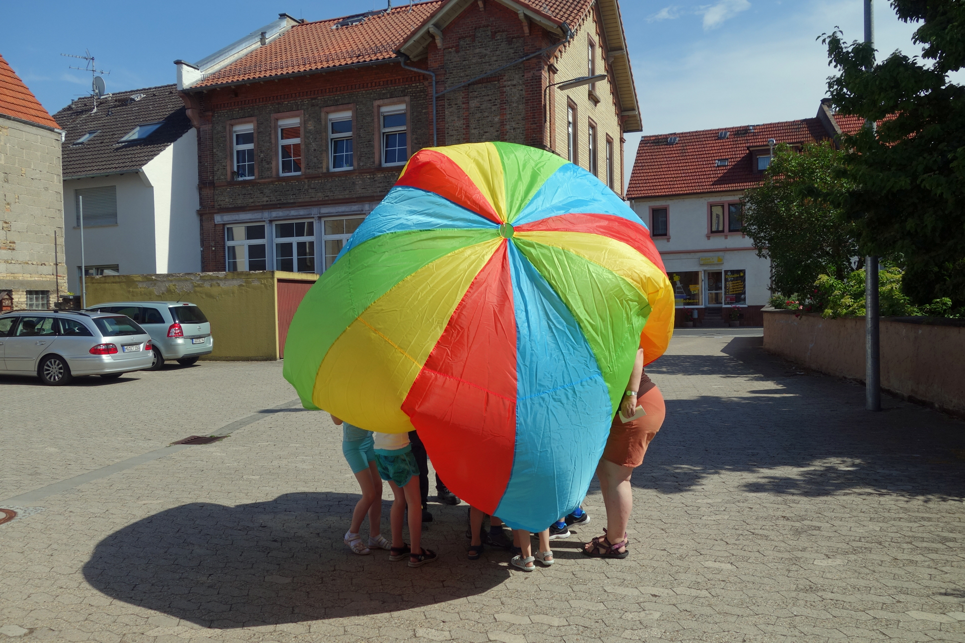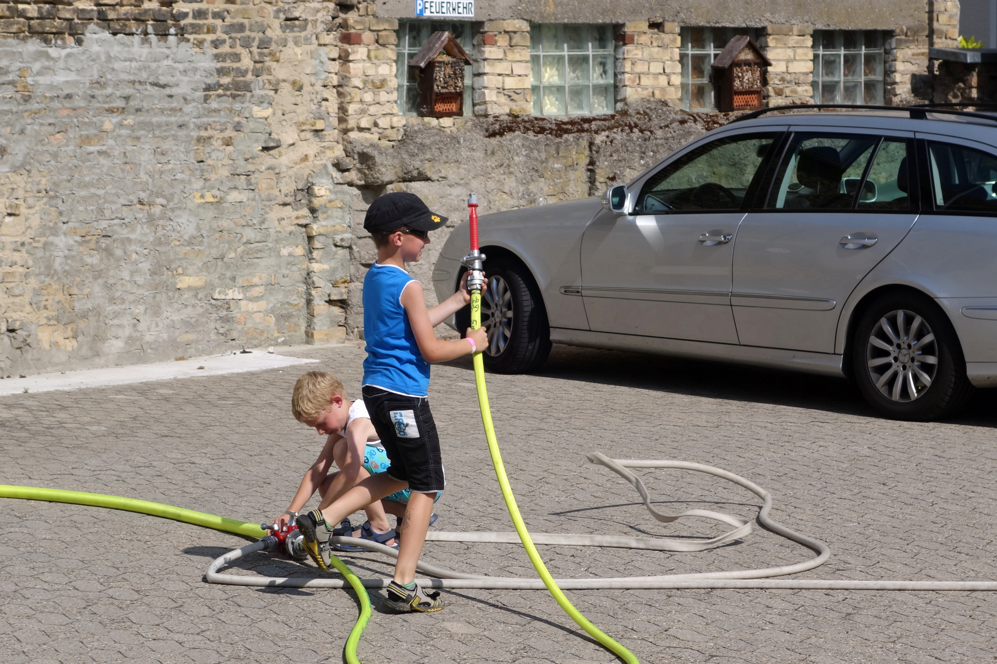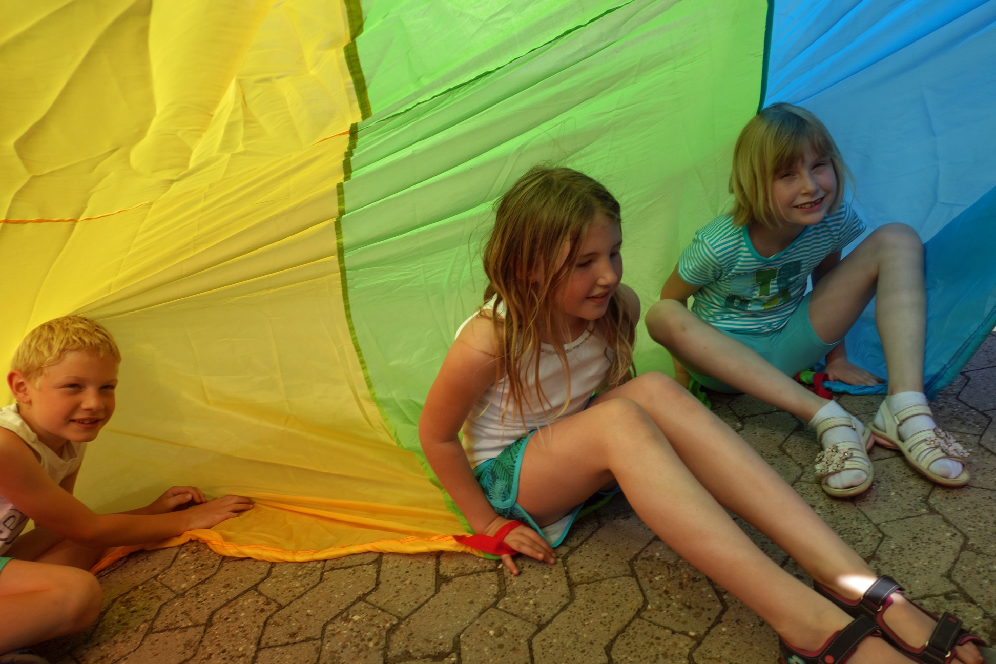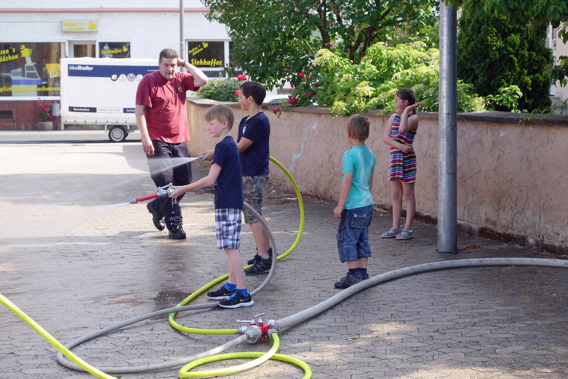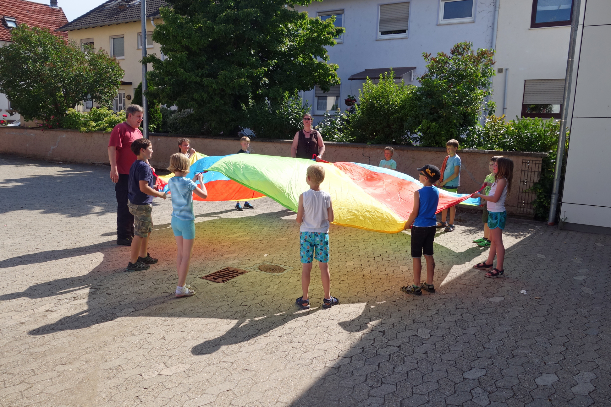 Nachdem die Feuervögel erfahren hatten, was ein Sprungtuch ist, nahmen sie selbst ein großes Tuch in die Hand. Das wurde allerdings nicht zum Springen verwendet sondern mit Elan geschwungen. Erstaunlich, welch ein Gewusel solch ein Tuch verursachen kann. Bei über 30°C gerieten wir dabei natürlich mächtig ins Schwitzen. Daher kamen wir um eine Abkühlung gar nicht herum. Schnell waren Schläuche angeschlossen und ein "Wasser marsch!" erklang. Es war eine Freude anzusehen, wie wenig wasserscheu die Feuervögel waren, wobei auch die Betreuer nicht so ganz trocken nach Hause gingen.