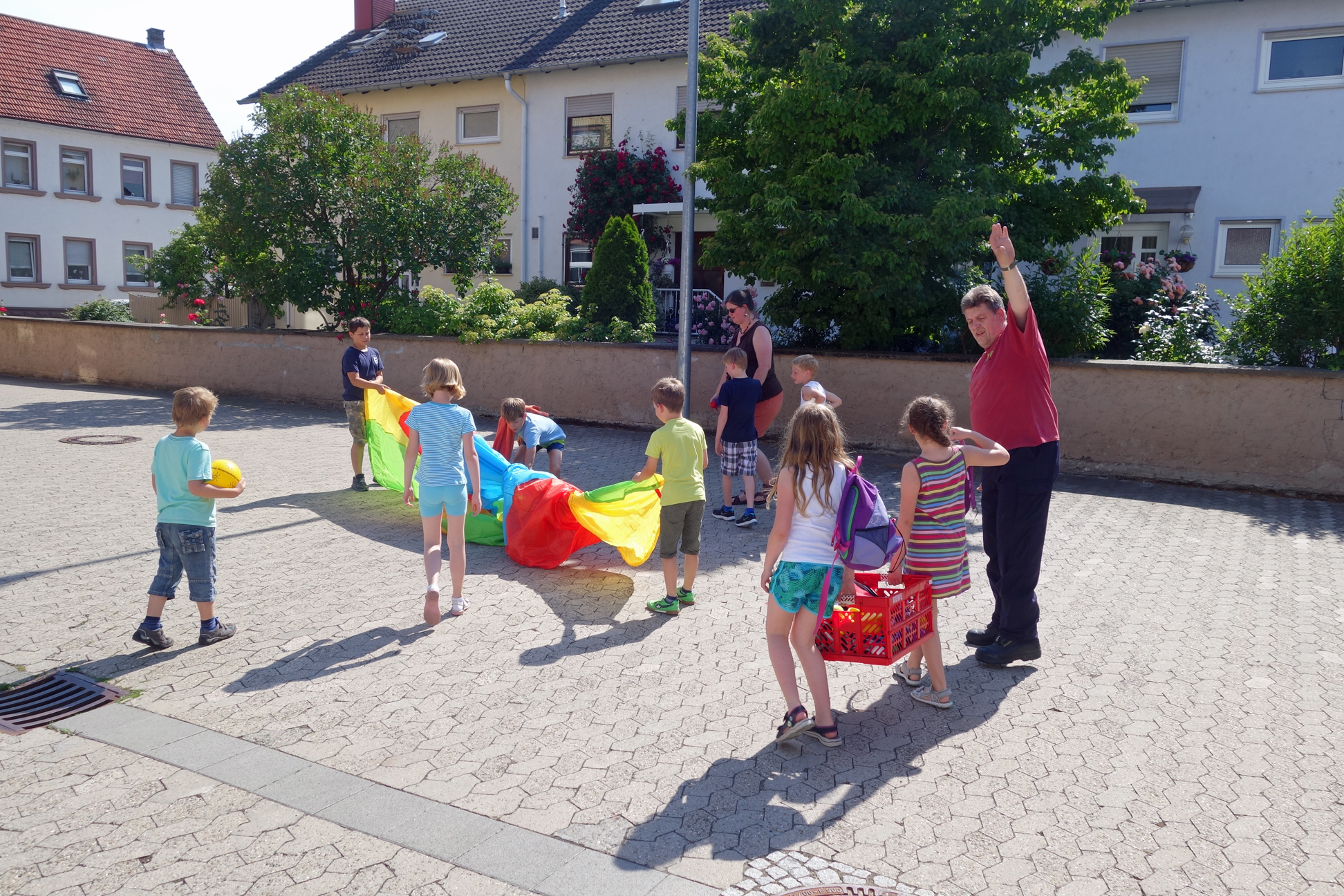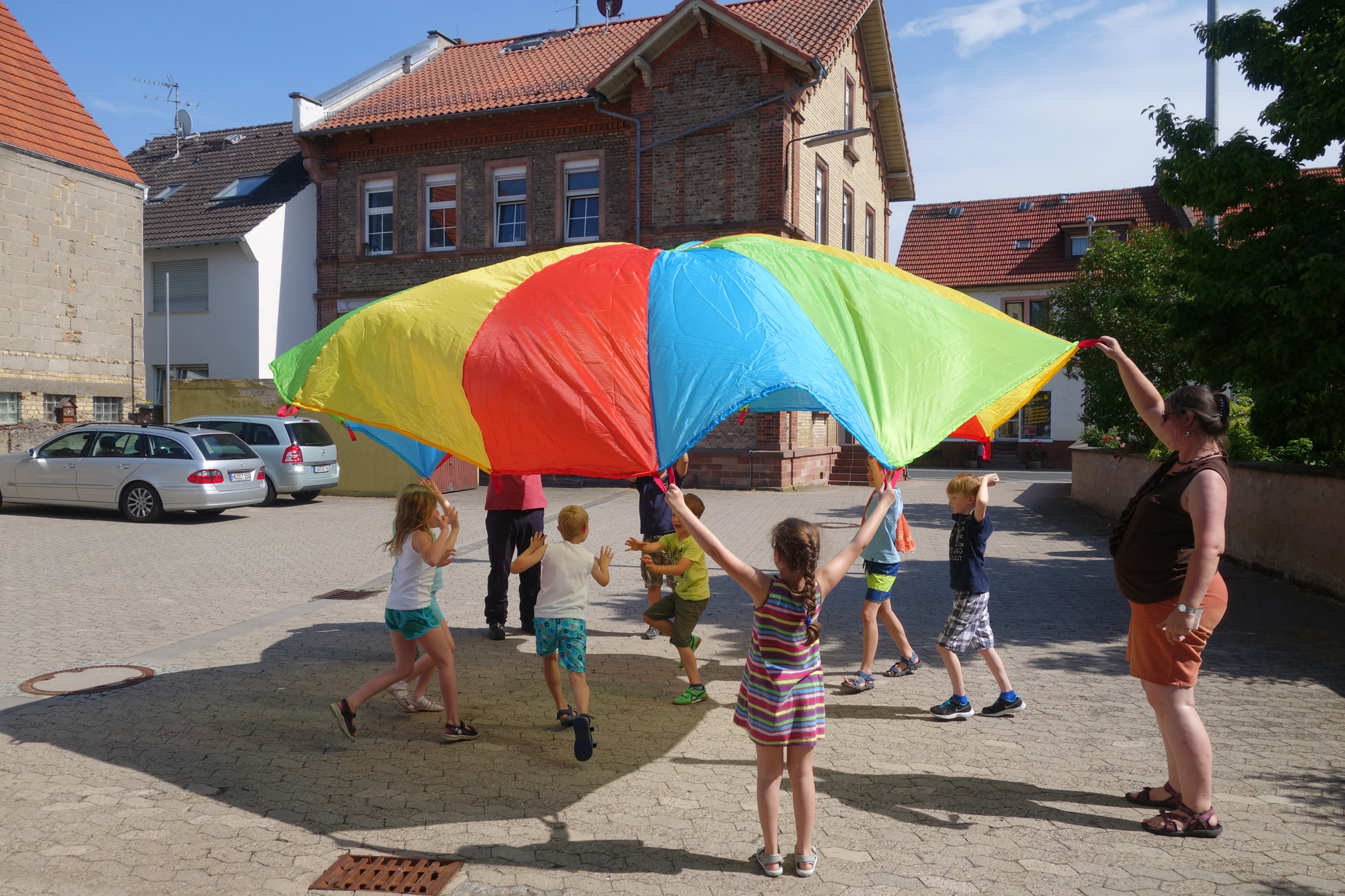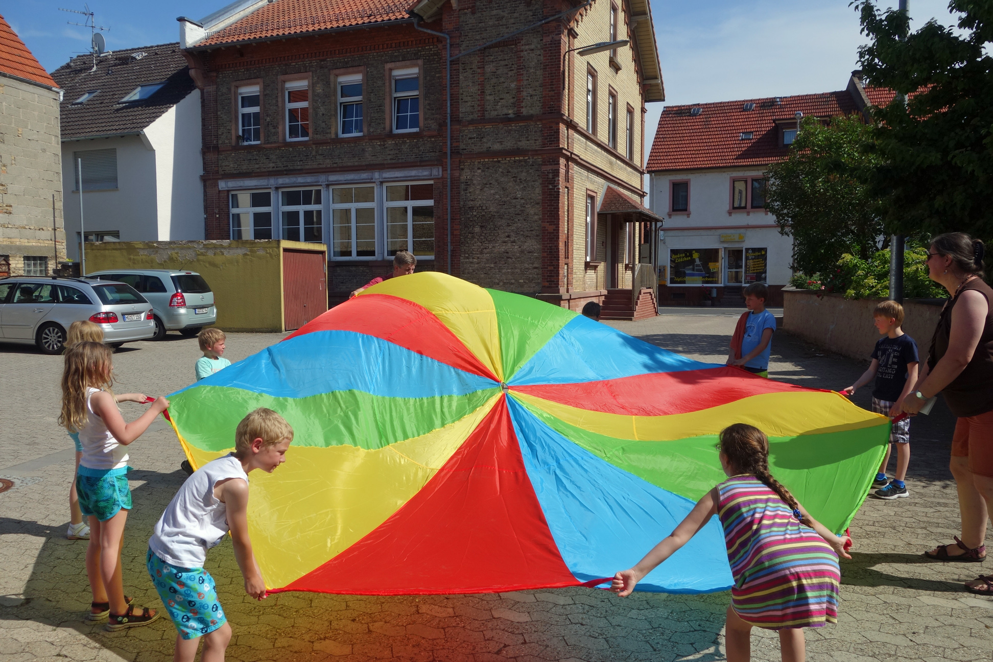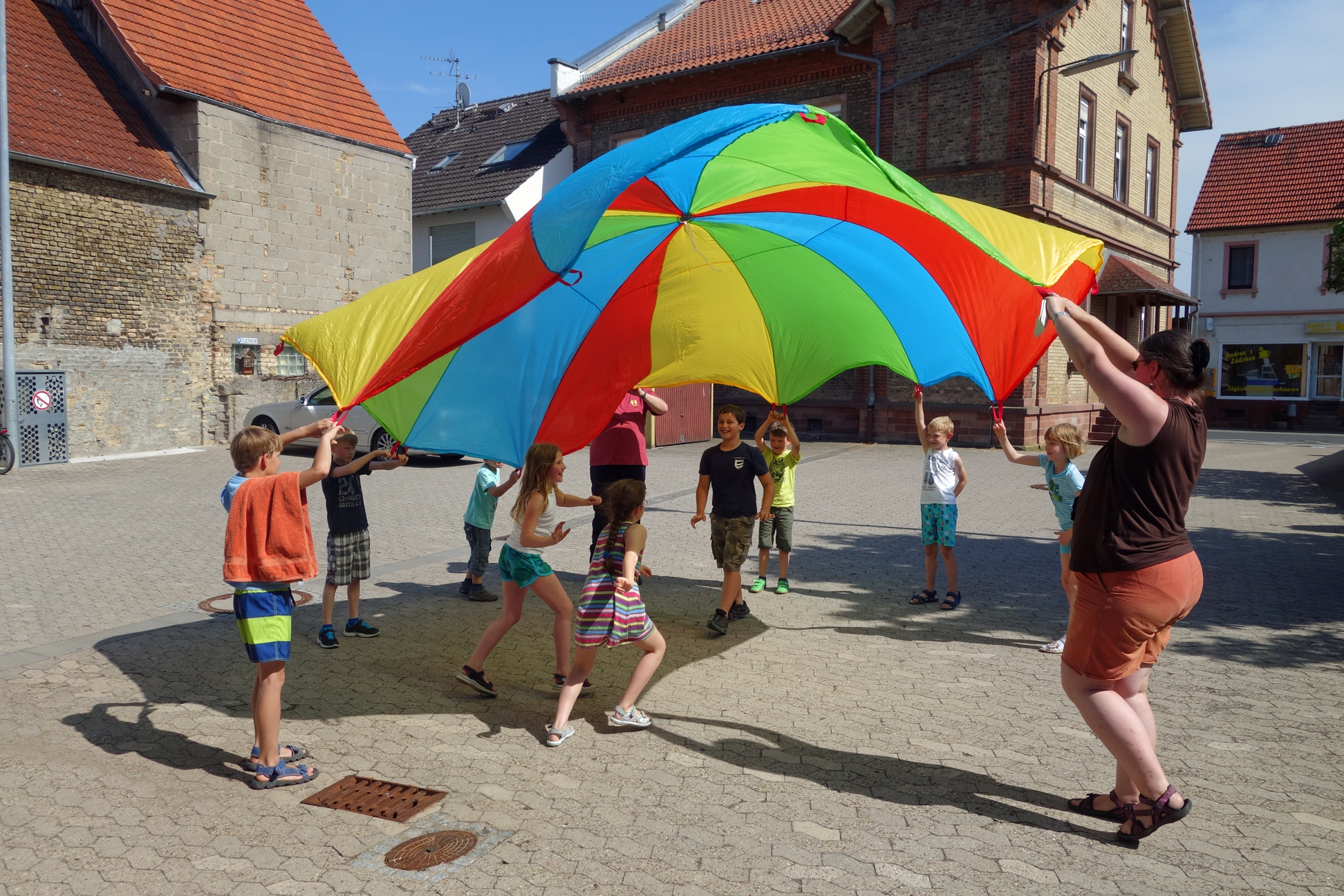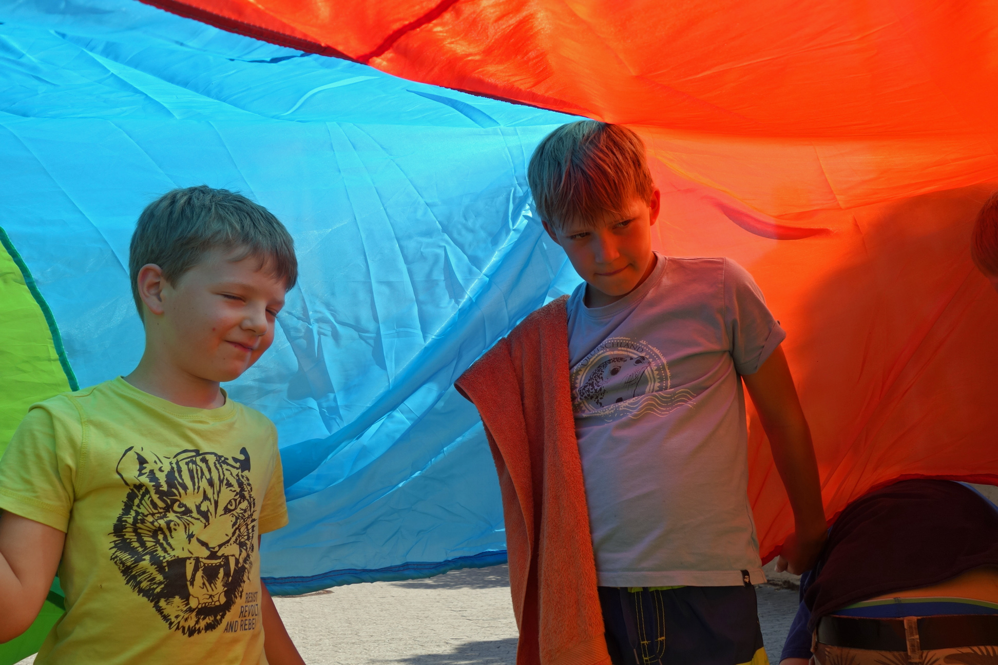 Nachdem die Feuervögel erfahren hatten, was ein Sprungtuch ist, nahmen sie selbst ein großes Tuch in die Hand. Das wurde allerdings nicht zum Springen verwendet sondern mit Elan geschwungen. Erstaunlich, welch ein Gewusel solch ein Tuch verursachen kann. Bei über 30°C gerieten wir dabei natürlich mächtig ins Schwitzen. Daher kamen wir um eine Abkühlung gar nicht herum. Schnell waren Schläuche angeschlossen und ein "Wasser marsch!" erklang. Es war eine Freude anzusehen, wie wenig wasserscheu die Feuervögel waren, wobei auch die Betreuer nicht so ganz trocken nach Hause gingen.