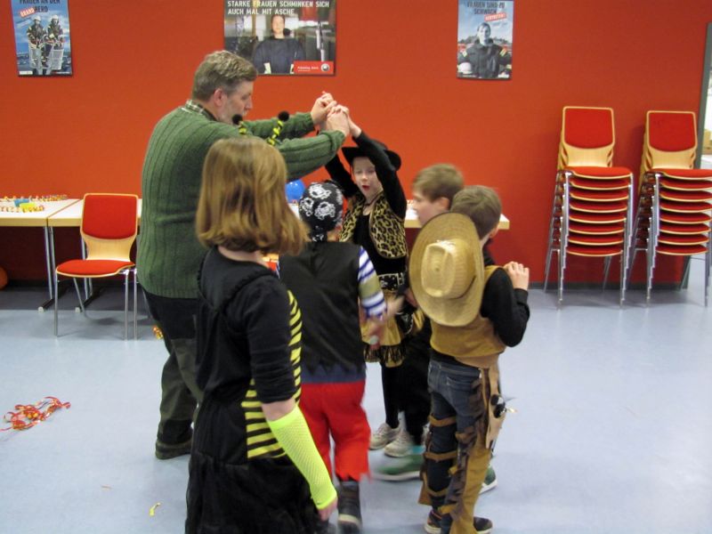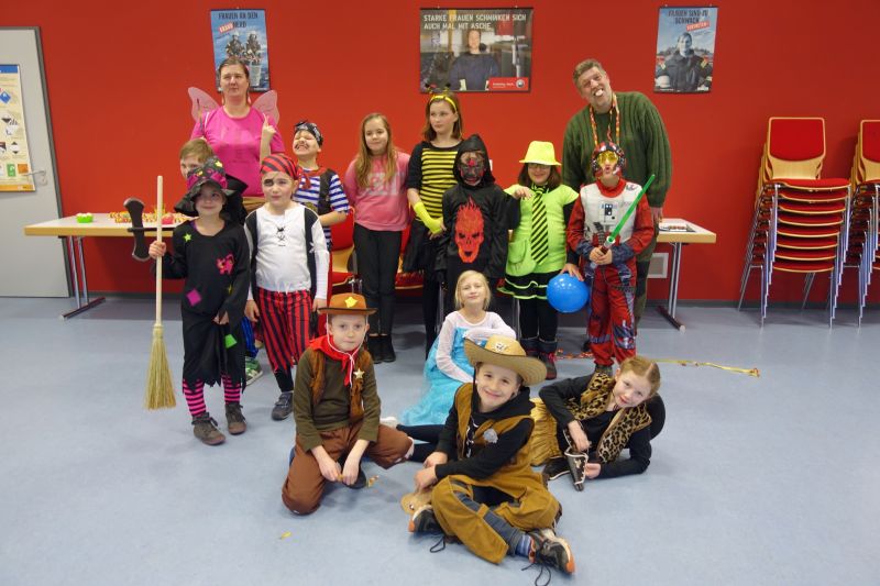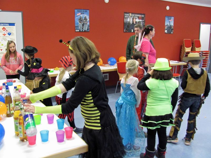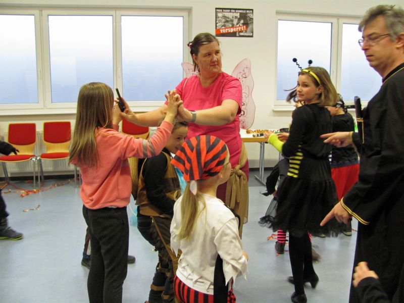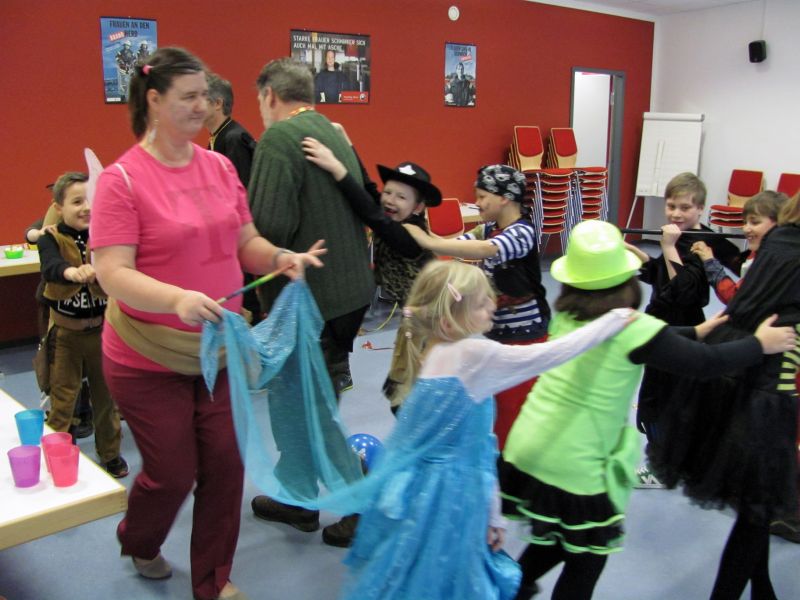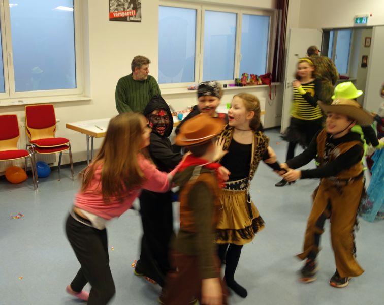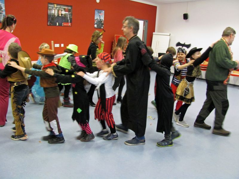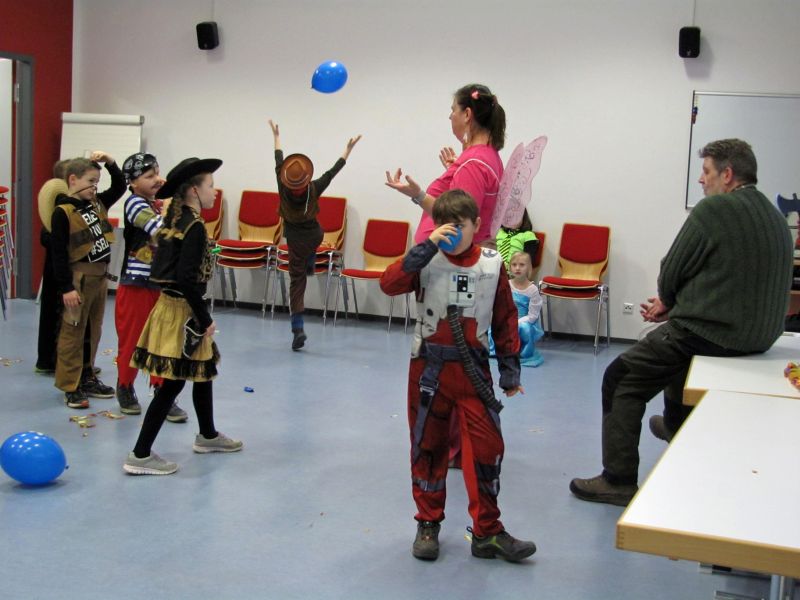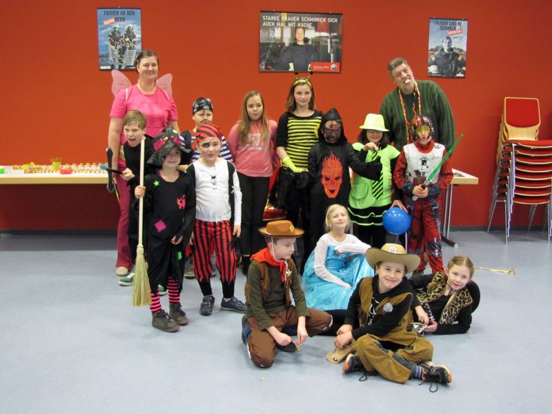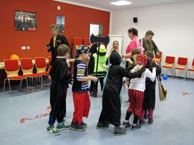 Am Faschingsfreitag versammelten sich schießwütige Cowboys, gefährliche Piraten, furchteinflössende Dämonen, eine fesche Hexe, eine feine Dame, eine vornehme Biene, ein Laserschwert-Kämpfer und eine Eisprinzessin um die Feuervögel-Betreuer, die diesmal auch ein wenig anders aussahen als sonst. Die wilde Meute stürzte sich mit Feuereifer auf die Süßigkeiten und Knabbersachen und in fröhliche Spiele mit viel Bewegung. Im Nu war die Stunde um, und vom wilden Treiben zeugten nur noch ein paar leere Schüsselchen und zerfetzte Luftschlangenreste.