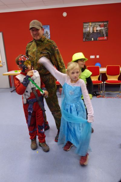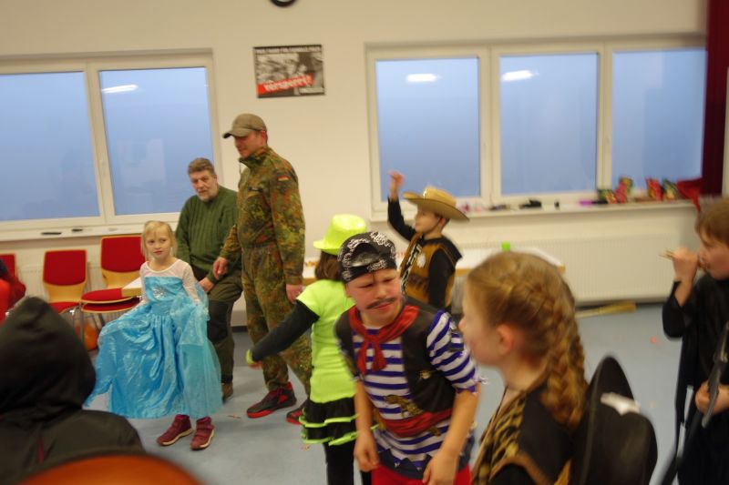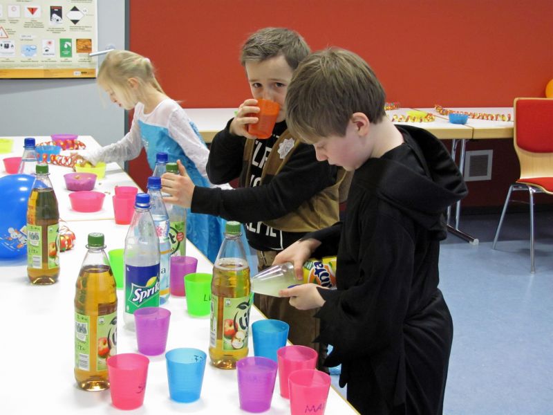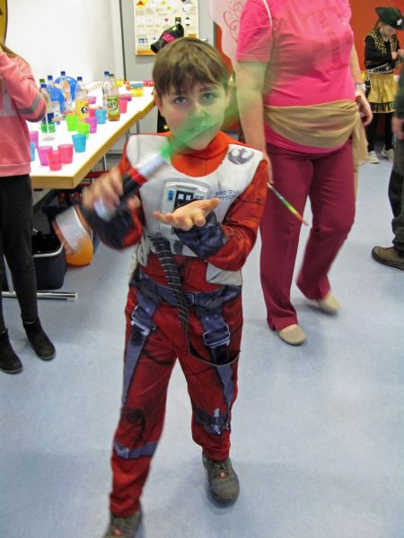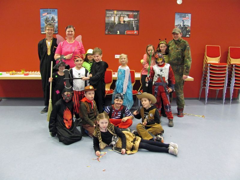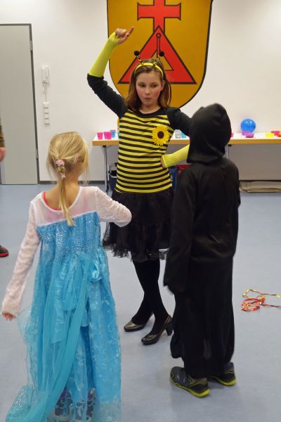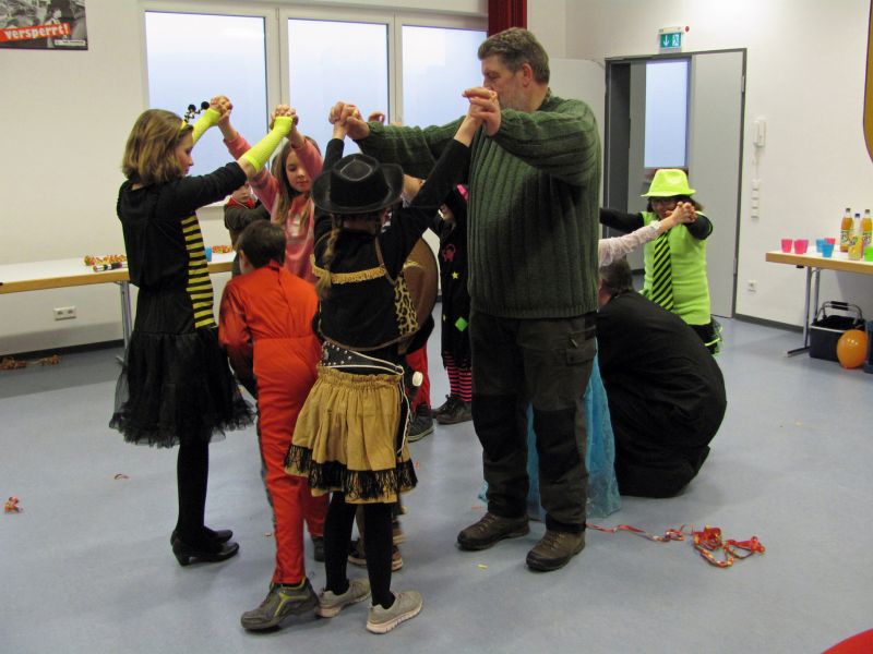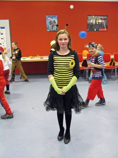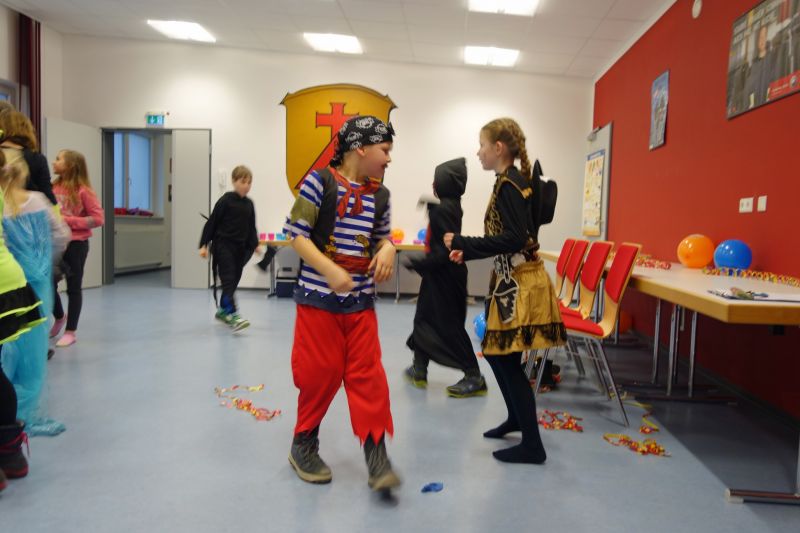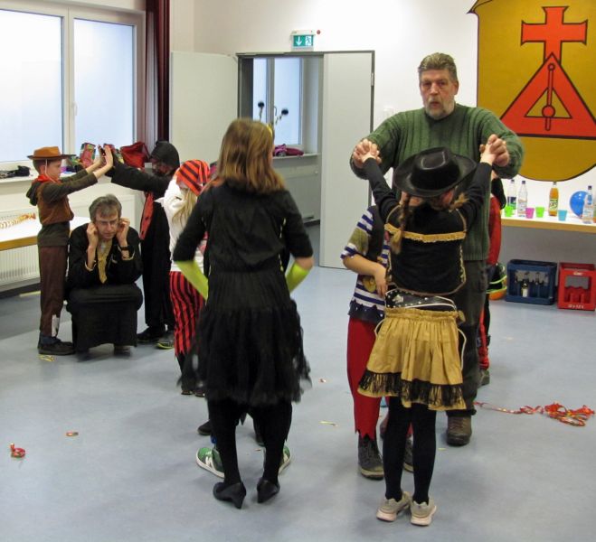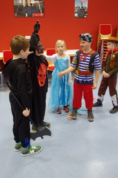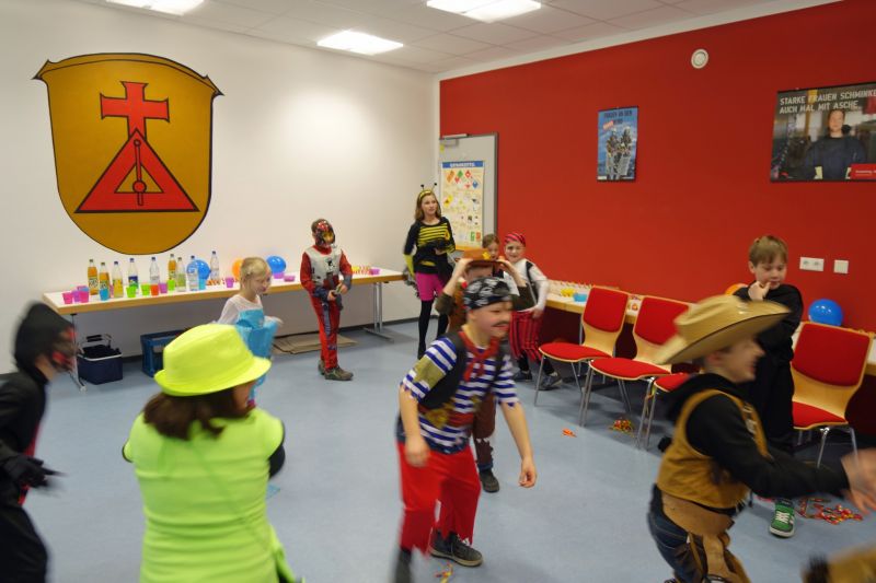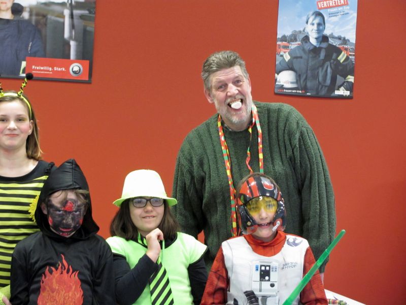 Am Faschingsfreitag versammelten sich schießwütige Cowboys, gefährliche Piraten, furchteinflössende Dämonen, eine fesche Hexe, eine feine Dame, eine vornehme Biene, ein Laserschwert-Kämpfer und eine Eisprinzessin um die Feuervögel-Betreuer, die diesmal auch ein wenig anders aussahen als sonst. Die wilde Meute stürzte sich mit Feuereifer auf die Süßigkeiten und Knabbersachen und in fröhliche Spiele mit viel Bewegung. Im Nu war die Stunde um, und vom wilden Treiben zeugten nur noch ein paar leere Schüsselchen und zerfetzte Luftschlangenreste.