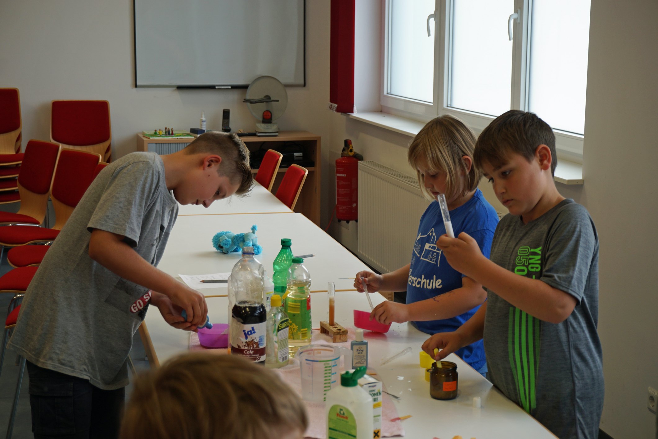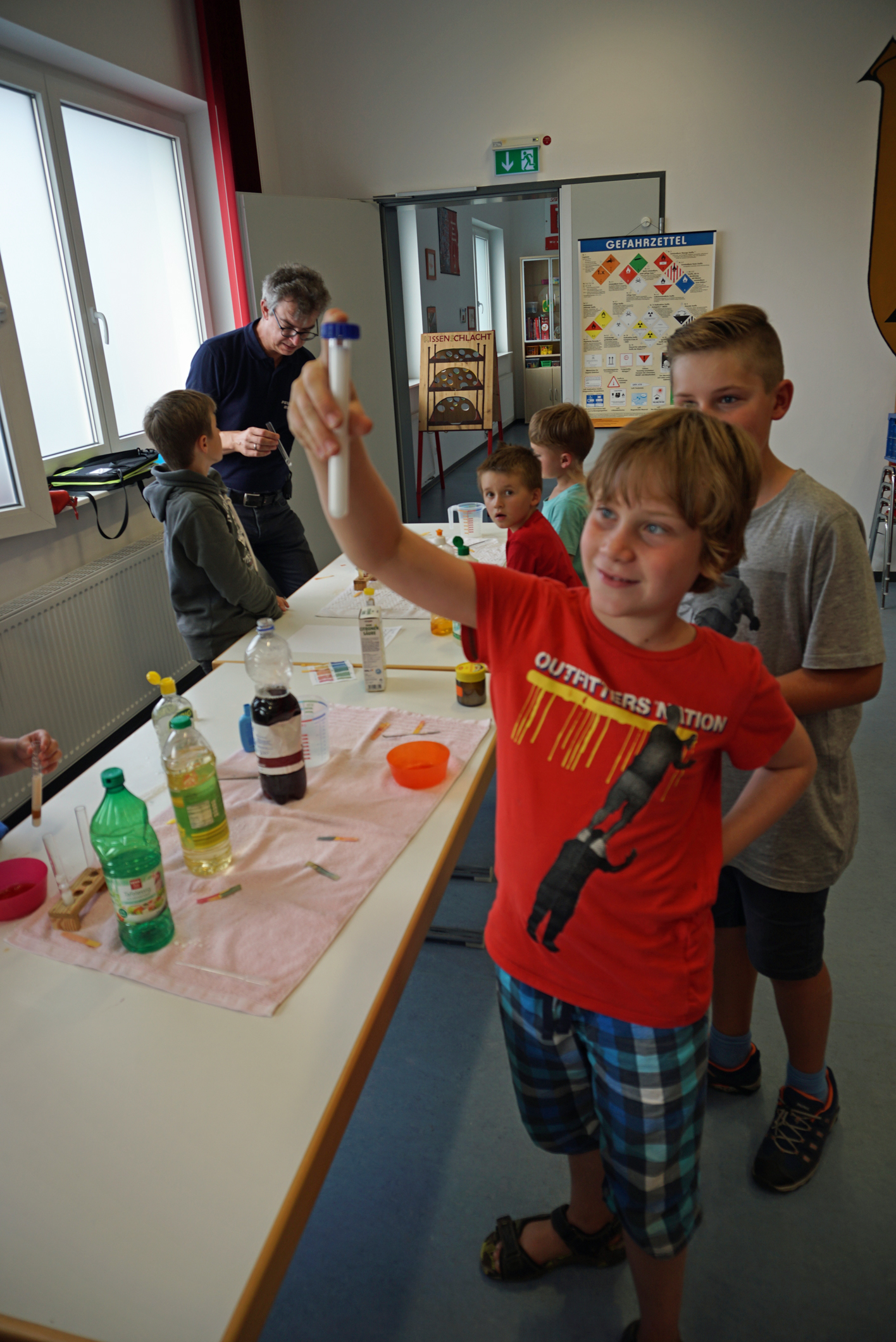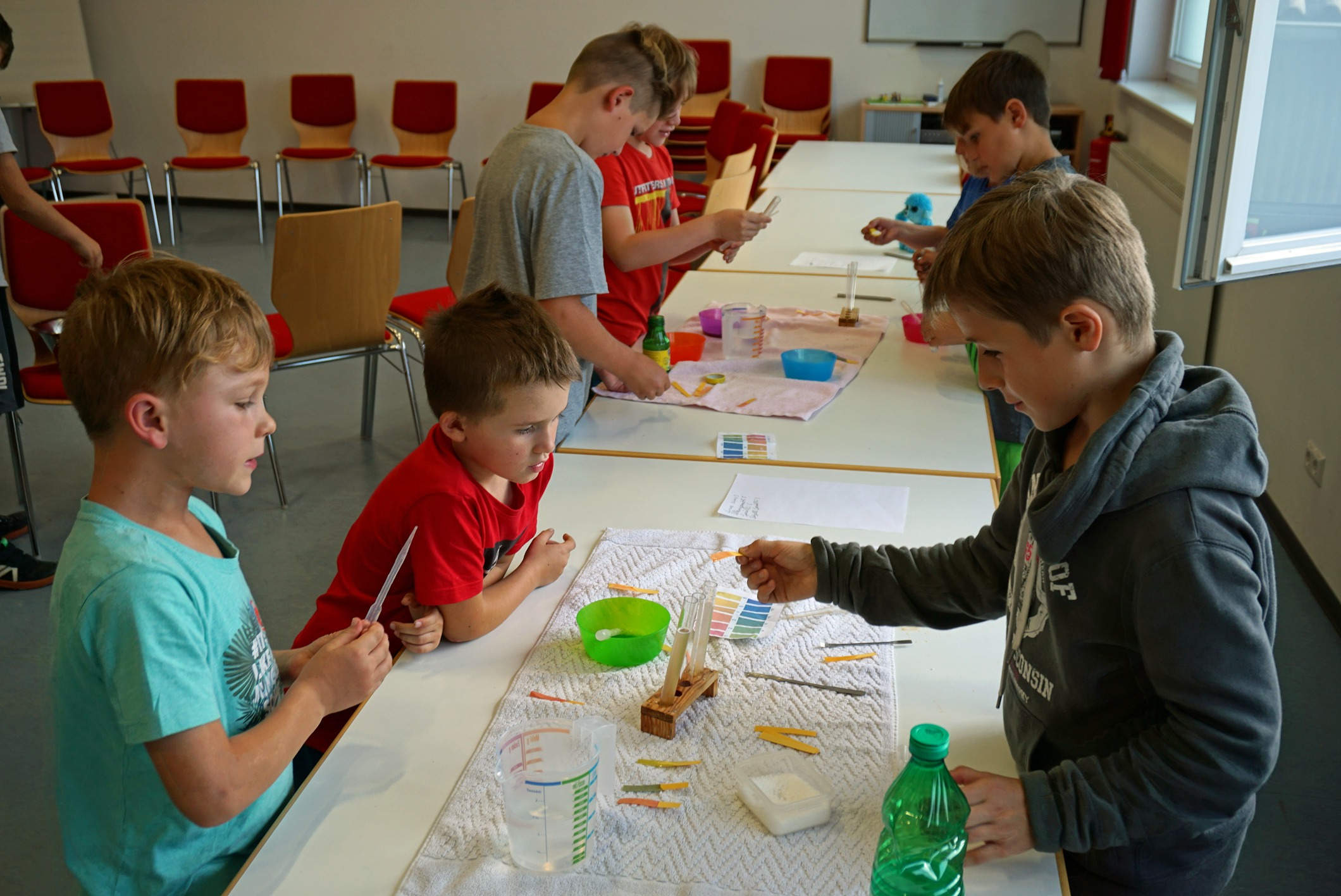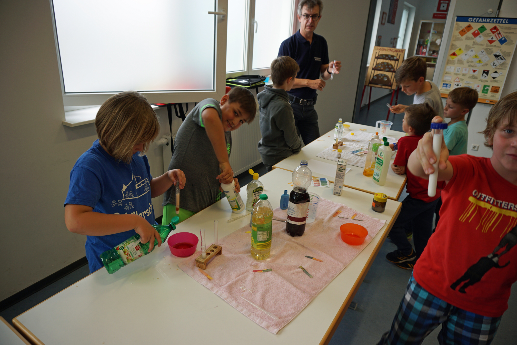 Als die Feuervögel in den Schulungsraum kamen, fanden sie dort eine bunte Ansammlung von Flaschen, Dosen und Schachteln. Sie stellten fest, dass auf einigen Flaschen merkwürdige Zeichen abgedruckt waren. Wir schauten uns das an und fanden heraus, dass viele Flüssigkeiten sehr ungesund, ätzend, giftig oder umweltschädlich sein können. Nachdem die Feuervögel von diesen Gefahren wussten, durften sie die nicht ganz so ungesunden Flüssigkeiten näher untersuchen. So wuselten die Kinder schnell mit Pipetten, Reagenzgläsern, ph-Papier, Trichtern und Spateln herum und fanden Säuren, Laugen, Seifen und vieles mehr. Am schönsten war aber natürlich die Puddelphase, bei der alles mögliche zusammengeschüttet werden durfte, das manchmal recht unerwartet zu schäumen begann.