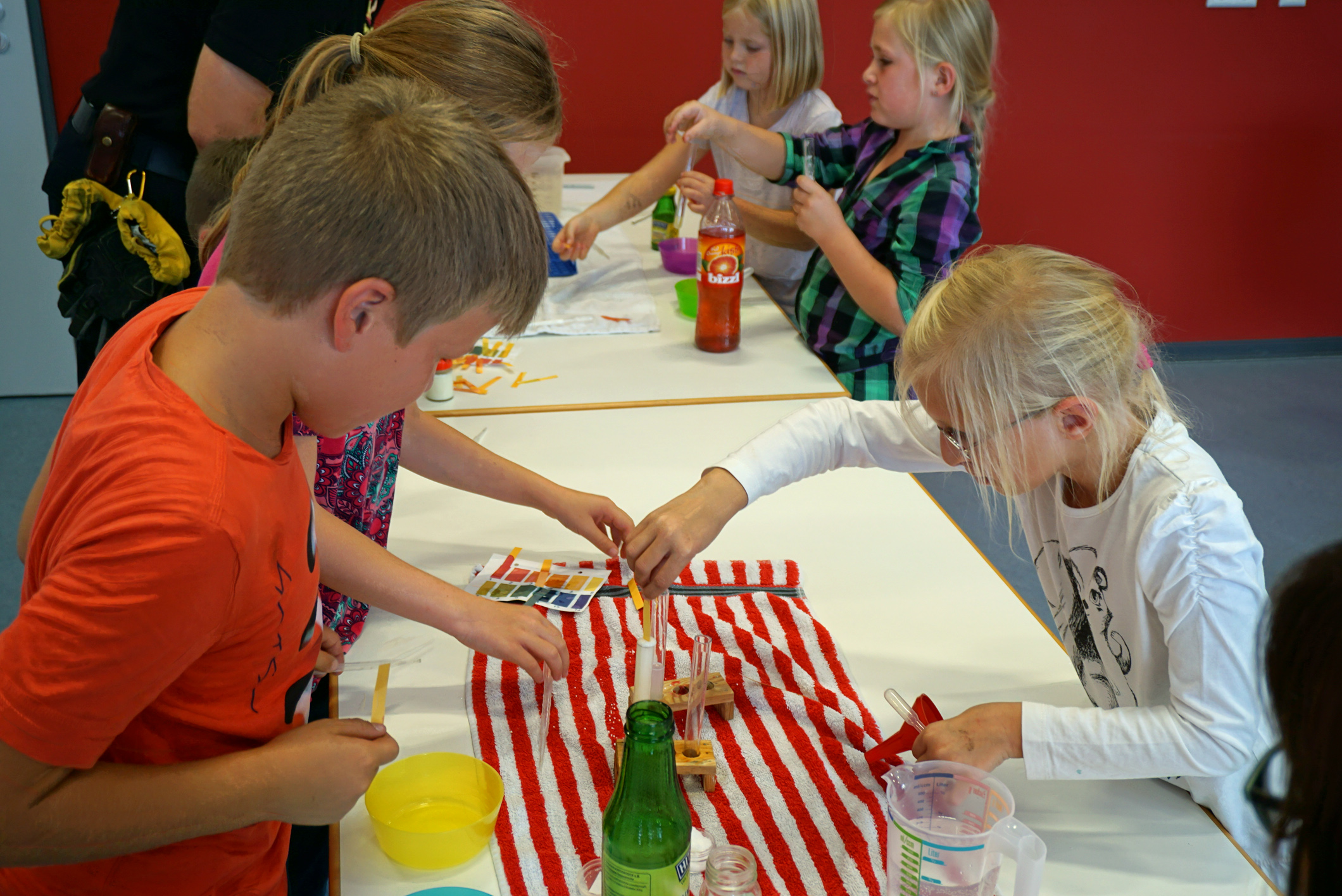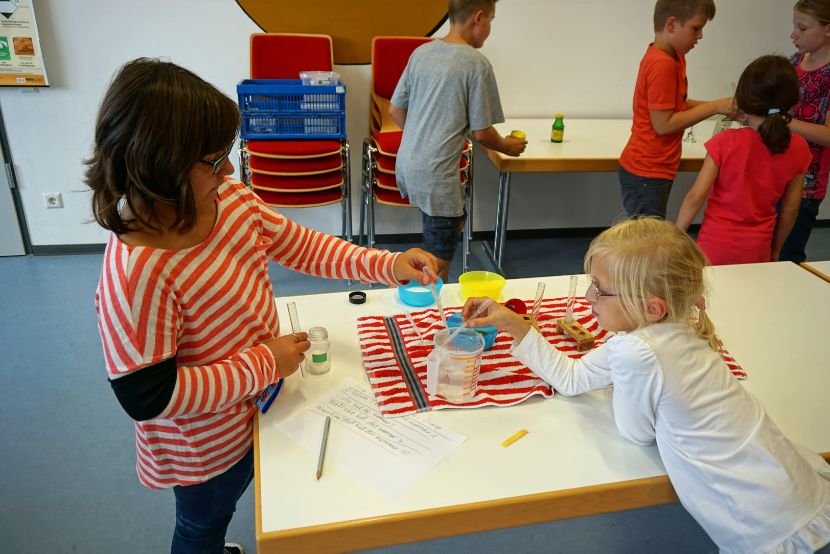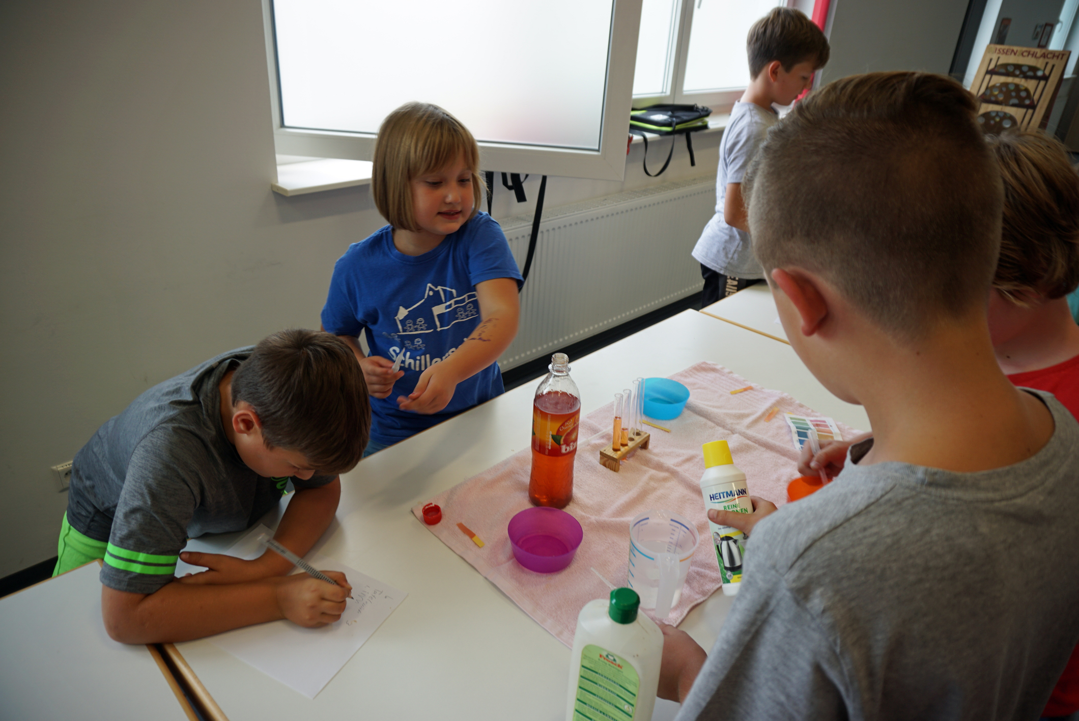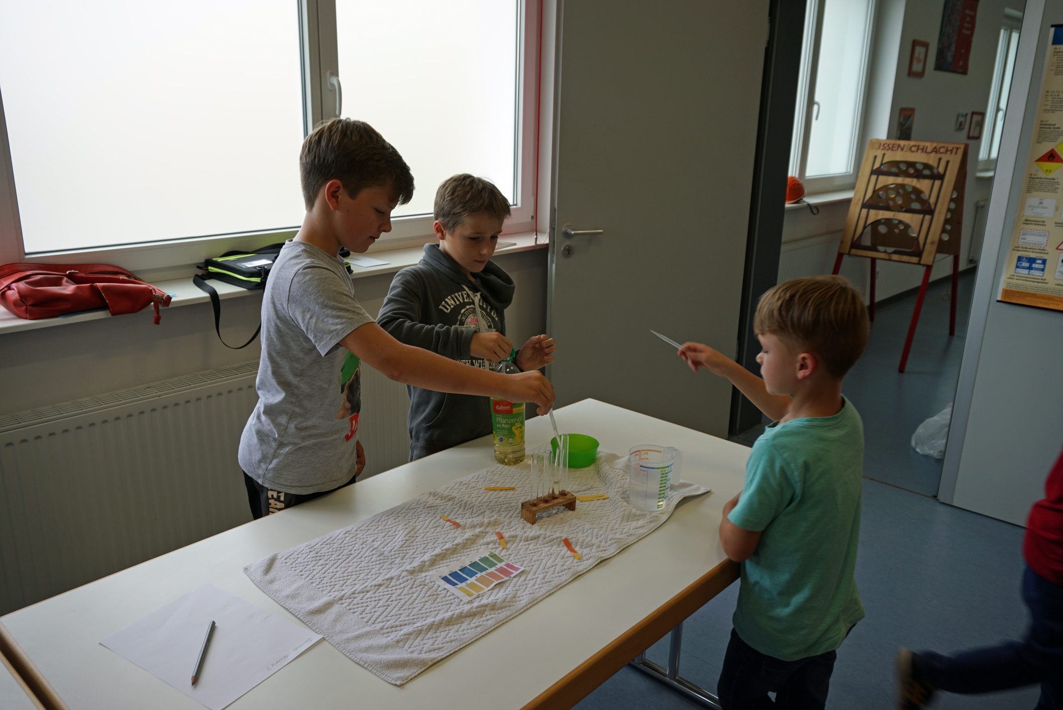 Als die Feuervögel in den Schulungsraum kamen, fanden sie dort eine bunte Ansammlung von Flaschen, Dosen und Schachteln. Sie stellten fest, dass auf einigen Flaschen merkwürdige Zeichen abgedruckt waren. Wir schauten uns das an und fanden heraus, dass viele Flüssigkeiten sehr ungesund, ätzend, giftig oder umweltschädlich sein können. Nachdem die Feuervögel von diesen Gefahren wussten, durften sie die nicht ganz so ungesunden Flüssigkeiten näher untersuchen. So wuselten die Kinder schnell mit Pipetten, Reagenzgläsern, ph-Papier, Trichtern und Spateln herum und fanden Säuren, Laugen, Seifen und vieles mehr. Am schönsten war aber natürlich die Puddelphase, bei der alles mögliche zusammengeschüttet werden durfte, das manchmal recht unerwartet zu schäumen begann.