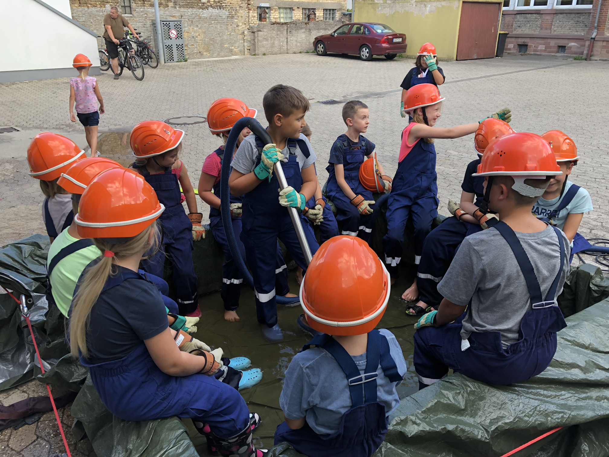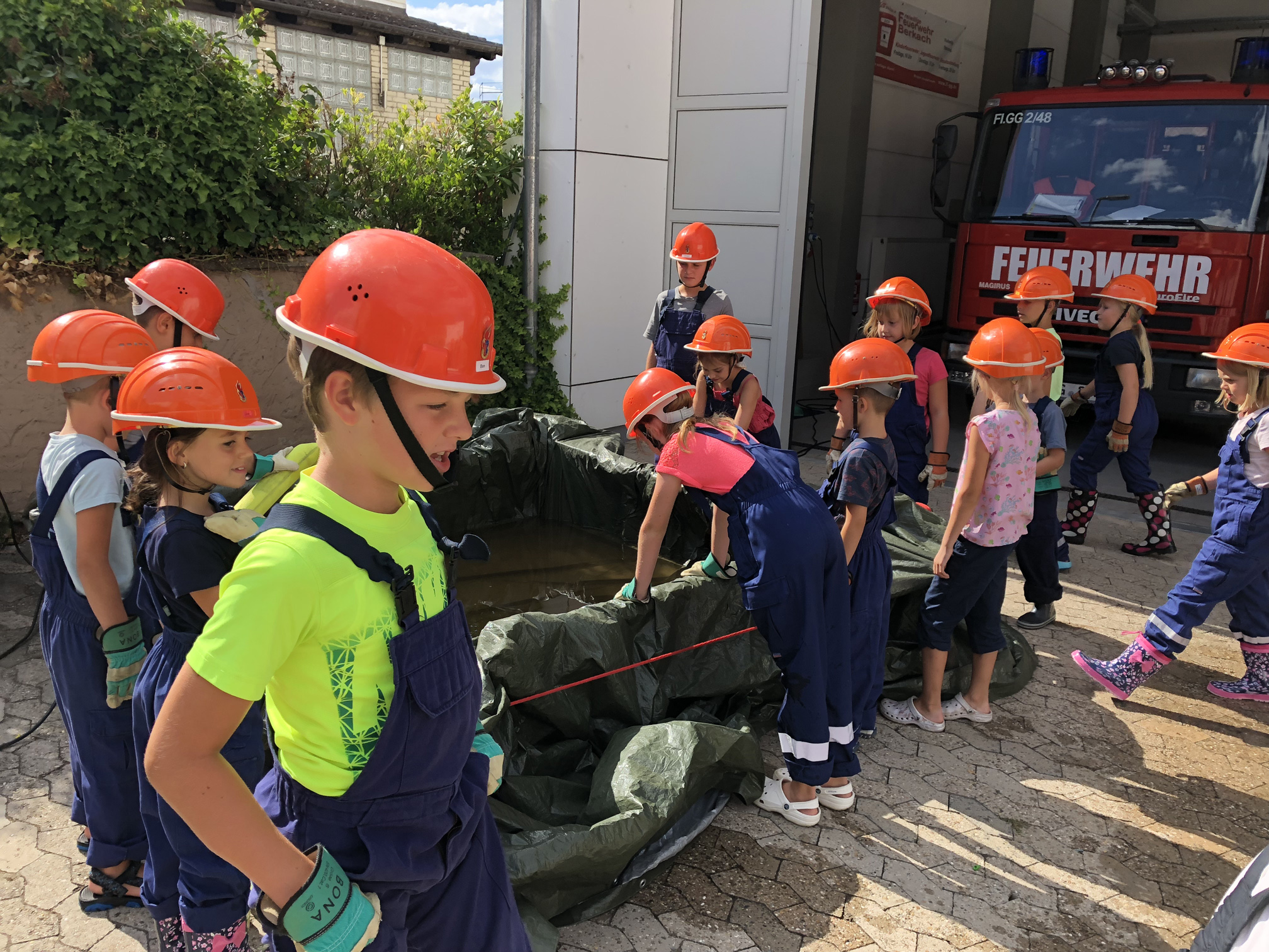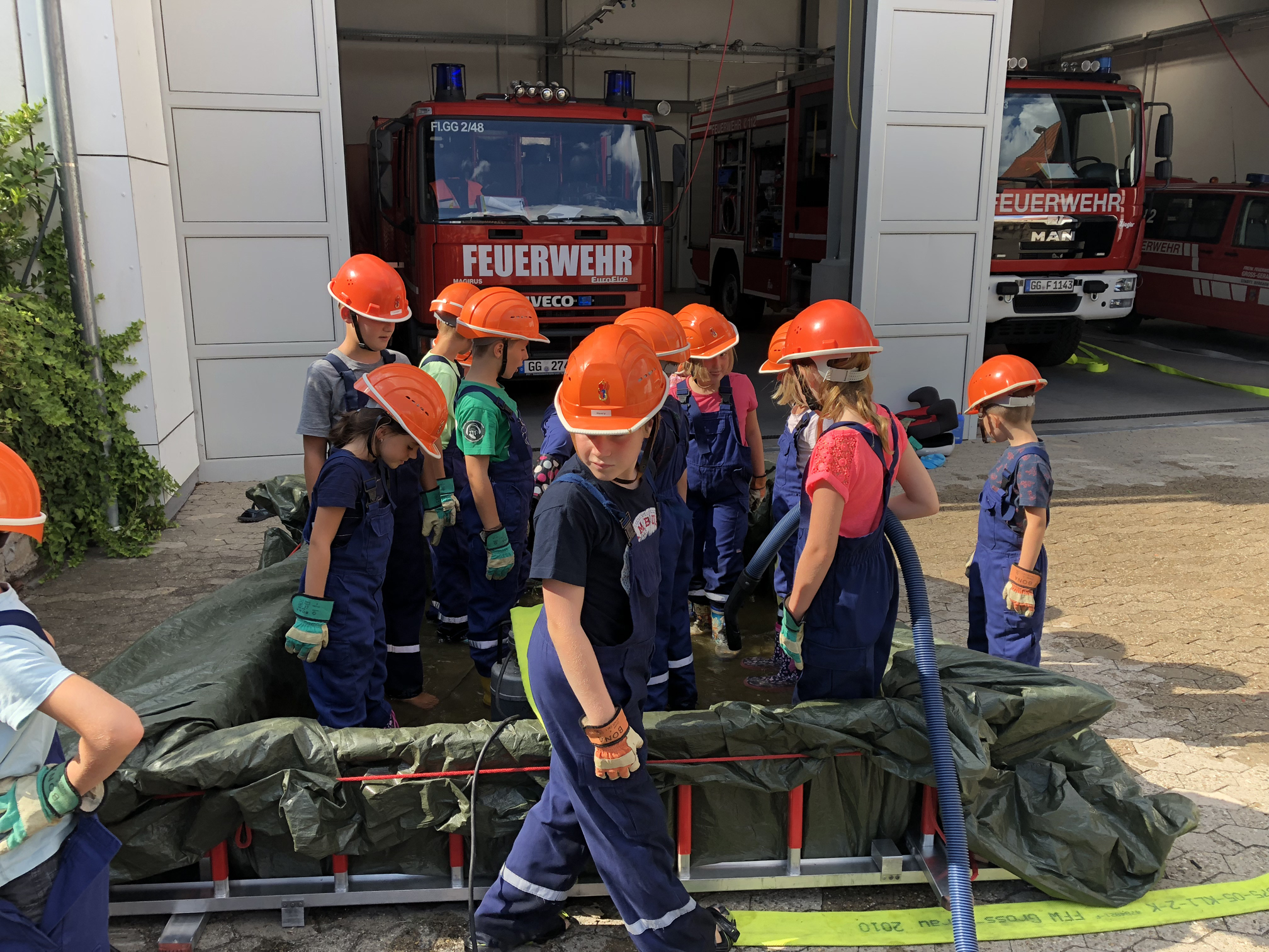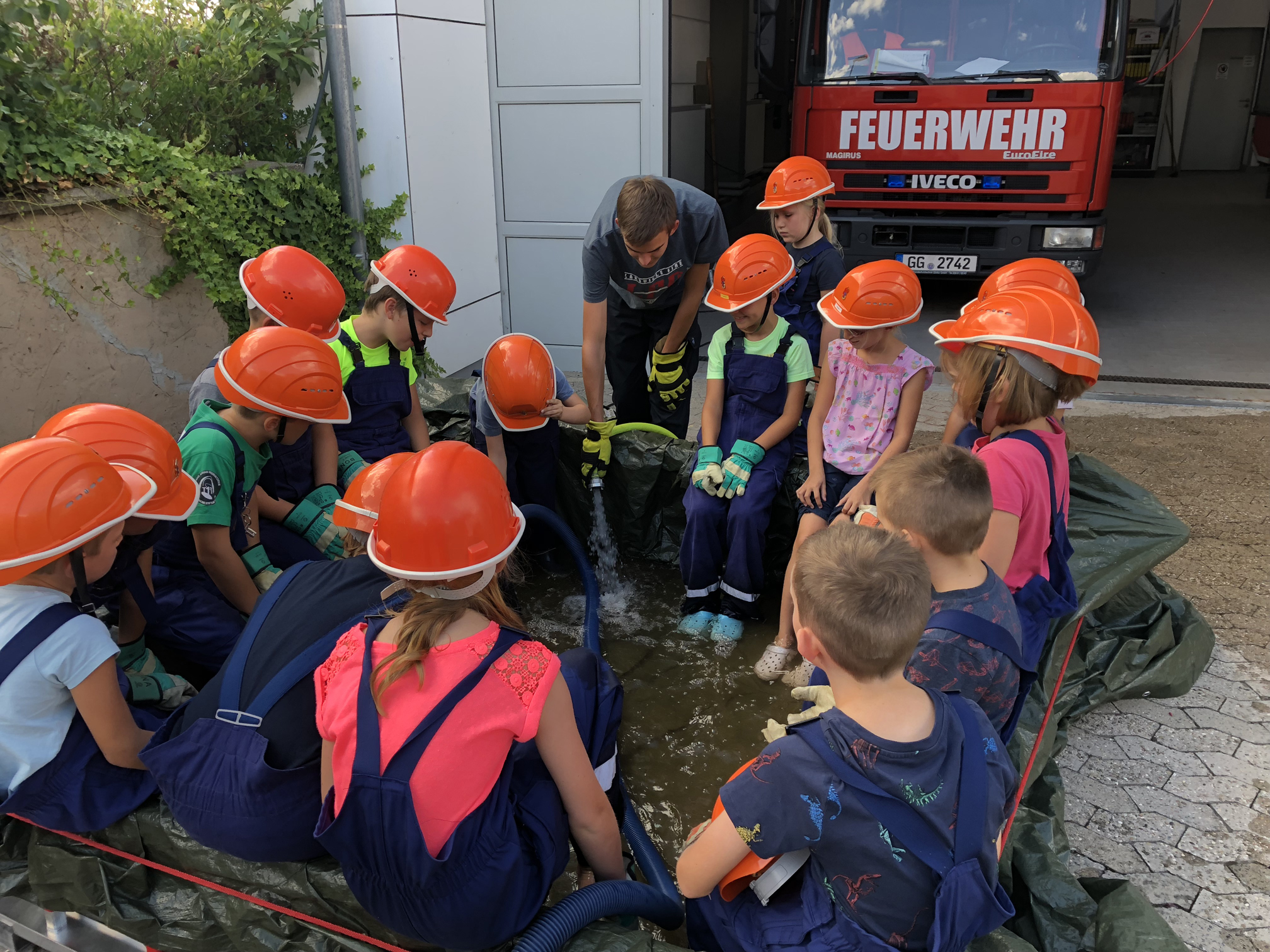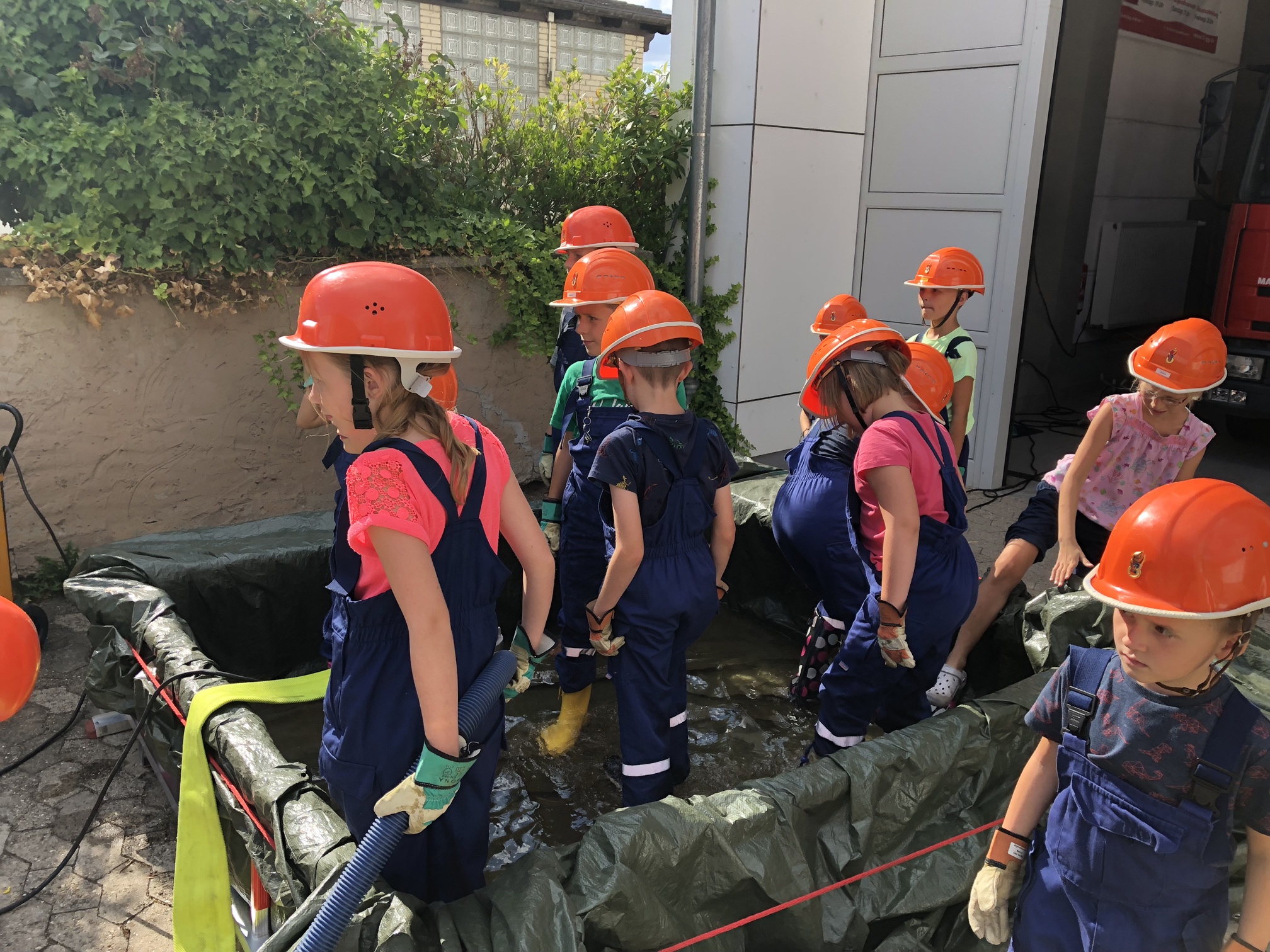 Nach der langen Trockenperiode sind die Flüsse nicht gerade im Begriff, über die Ufer zu treten. Aber auch ein kurzes Gewitter kann dafür sorgen, dass ein Keller vollläuft. Daher beschäftigten sich die Kinder mit dem Thema Hochwasser. Wir überlegten zunächst, wo es Wasser gibt und was die Feuerwehr wohl unternehmen könnte, wenn ein Keller voller Wasser gelaufen ist. Danach wollten wir das Besprochene in die Praxis umsetzen. Zum Glück entdeckten wir auf dem Hof ein Leiterbecken voller Wasser, das nur darauf wartete, leergepumpt zu werden. Die Feuervögel stellten dafür zunächst eine Pumpe in das Becken. Als diese irgendwann nicht weiterkam, wurde mit einem Wassersauger gesaugt. Nachdem die Kinder sich anfangs gewundert hatten, dass es Staubsauger für Wasser gibt, waren sie schon nach kurzer Zeit eifrig am saugen. So war also am Schluss das Becken leer und die Kinder hatten nasse Füße und viel Spaß.