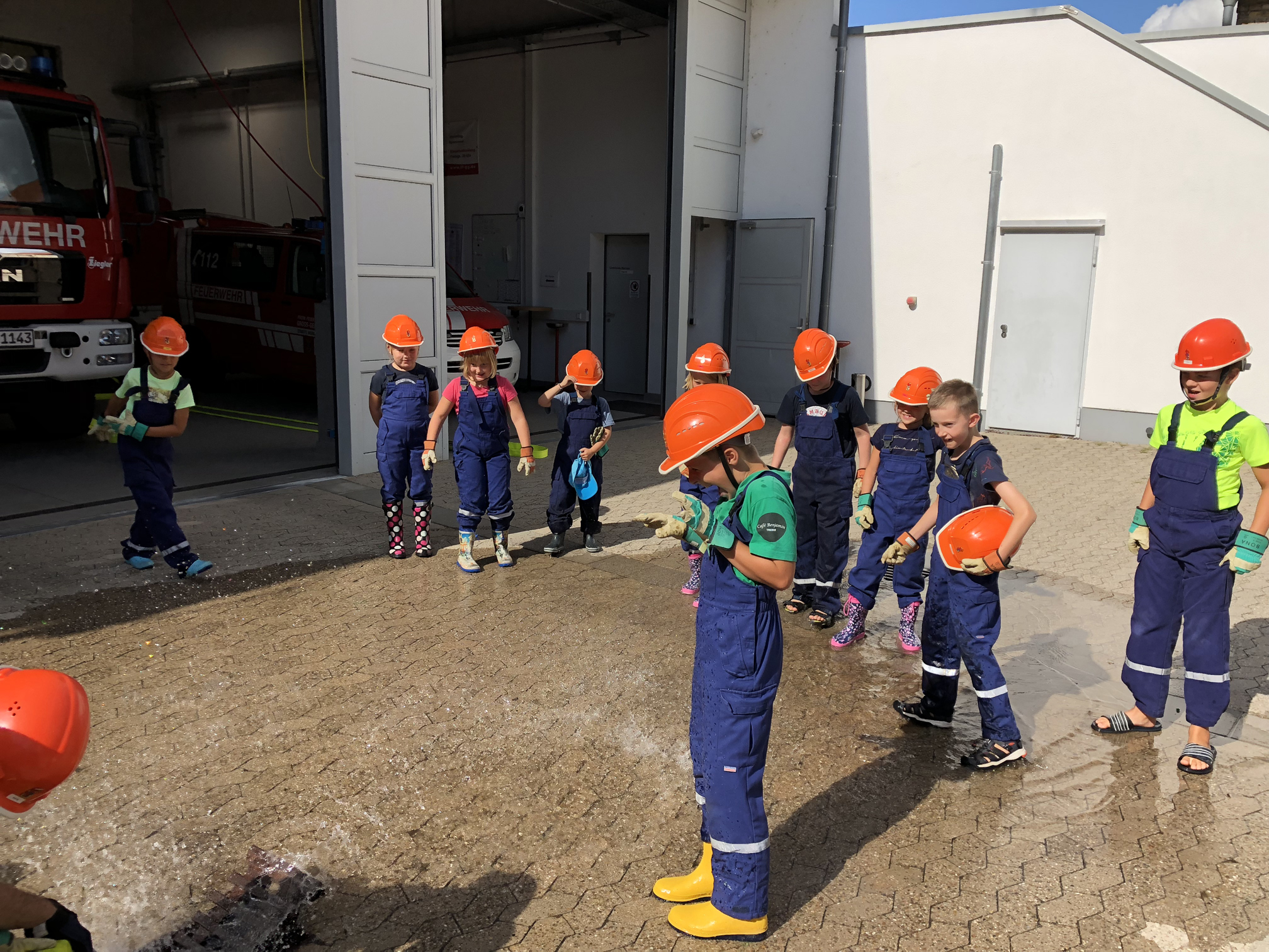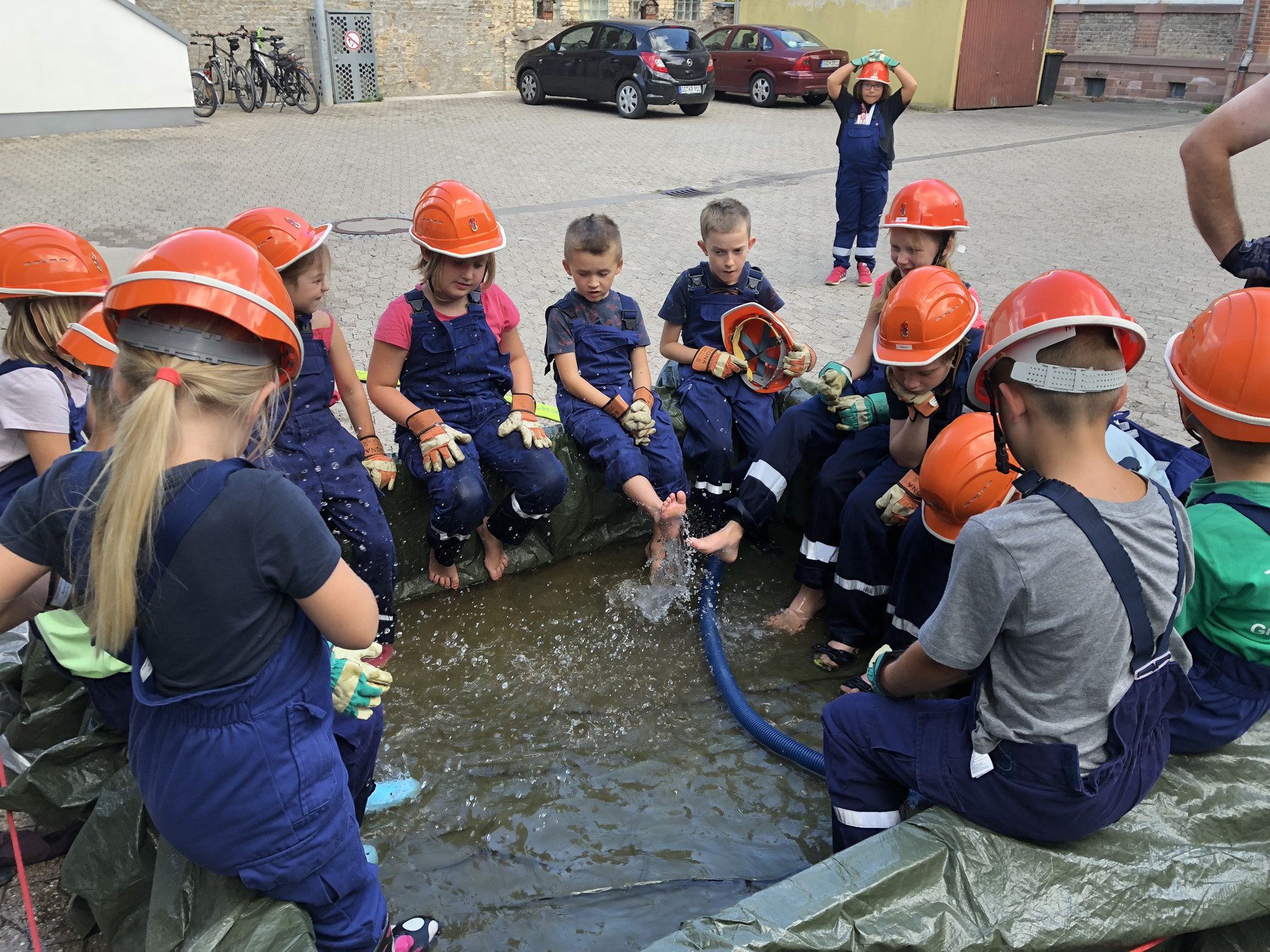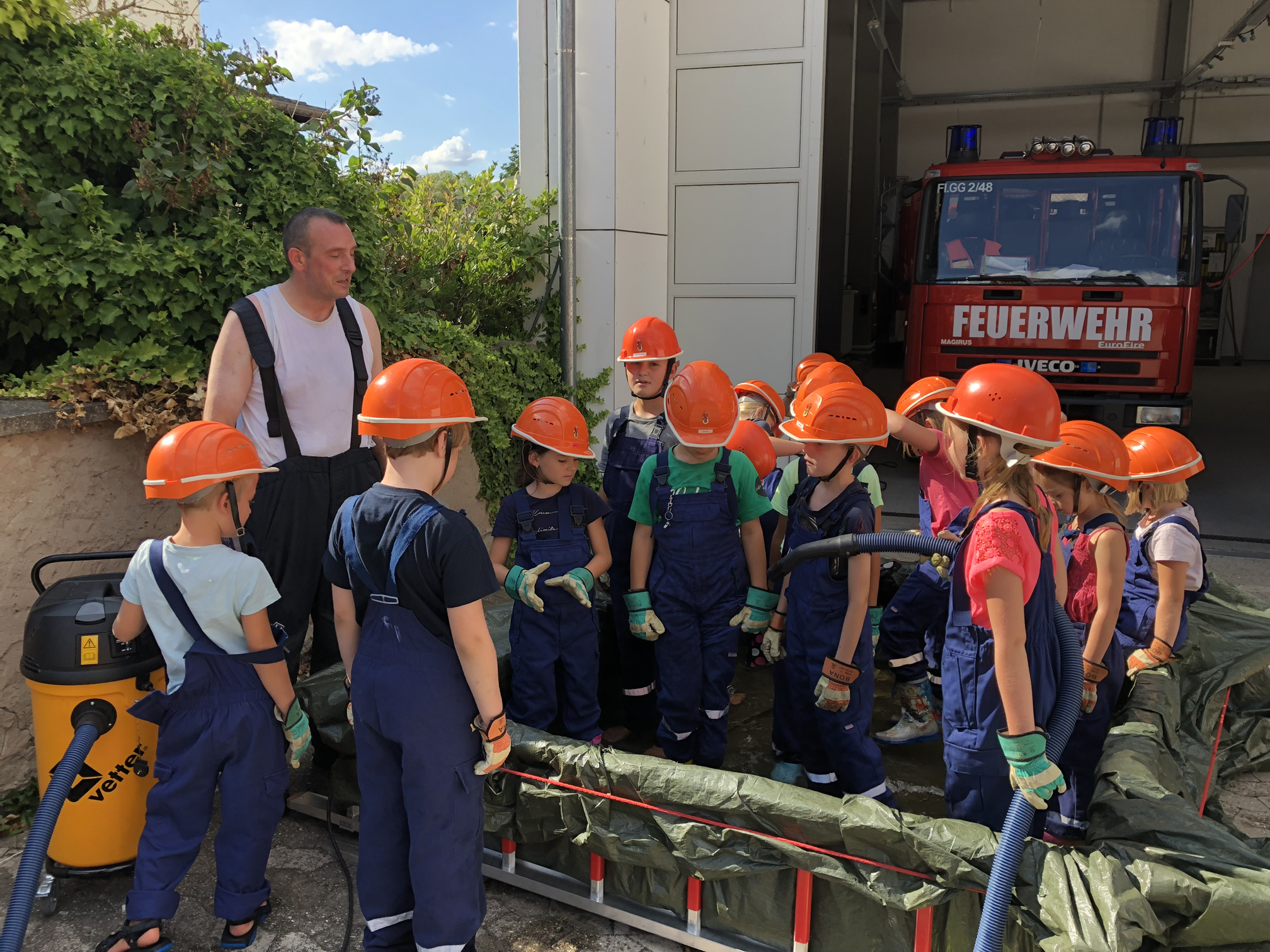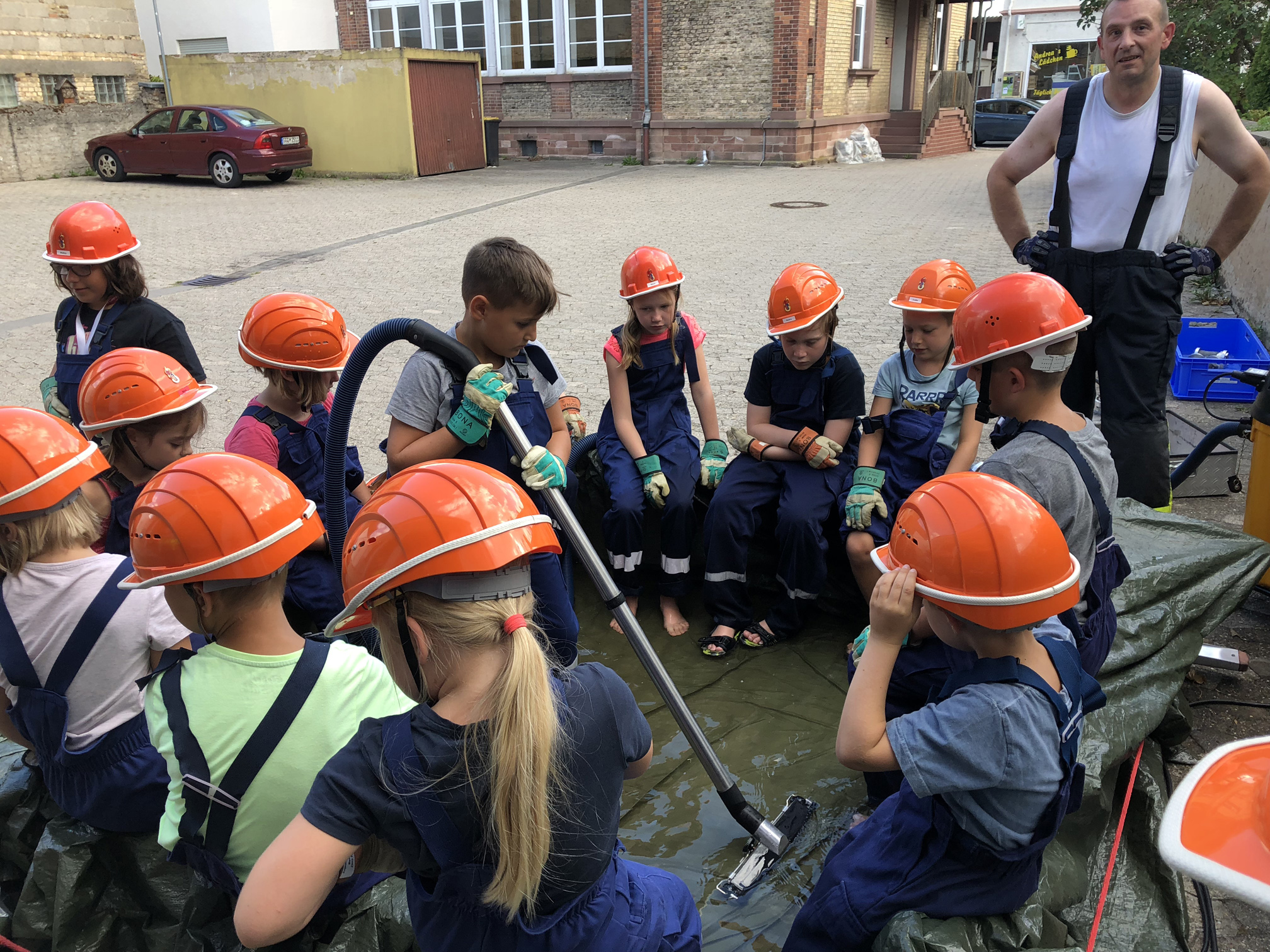 Nach der langen Trockenperiode sind die Flüsse nicht gerade im Begriff, über die Ufer zu treten. Aber auch ein kurzes Gewitter kann dafür sorgen, dass ein Keller vollläuft. Daher beschäftigten sich die Kinder mit dem Thema Hochwasser. Wir überlegten zunächst, wo es Wasser gibt und was die Feuerwehr wohl unternehmen könnte, wenn ein Keller voller Wasser gelaufen ist. Danach wollten wir das Besprochene in die Praxis umsetzen. Zum Glück entdeckten wir auf dem Hof ein Leiterbecken voller Wasser, das nur darauf wartete, leergepumpt zu werden. Die Feuervögel stellten dafür zunächst eine Pumpe in das Becken. Als diese irgendwann nicht weiterkam, wurde mit einem Wassersauger gesaugt. Nachdem die Kinder sich anfangs gewundert hatten, dass es Staubsauger für Wasser gibt, waren sie schon nach kurzer Zeit eifrig am saugen. So war also am Schluss das Becken leer und die Kinder hatten nasse Füße und viel Spaß.