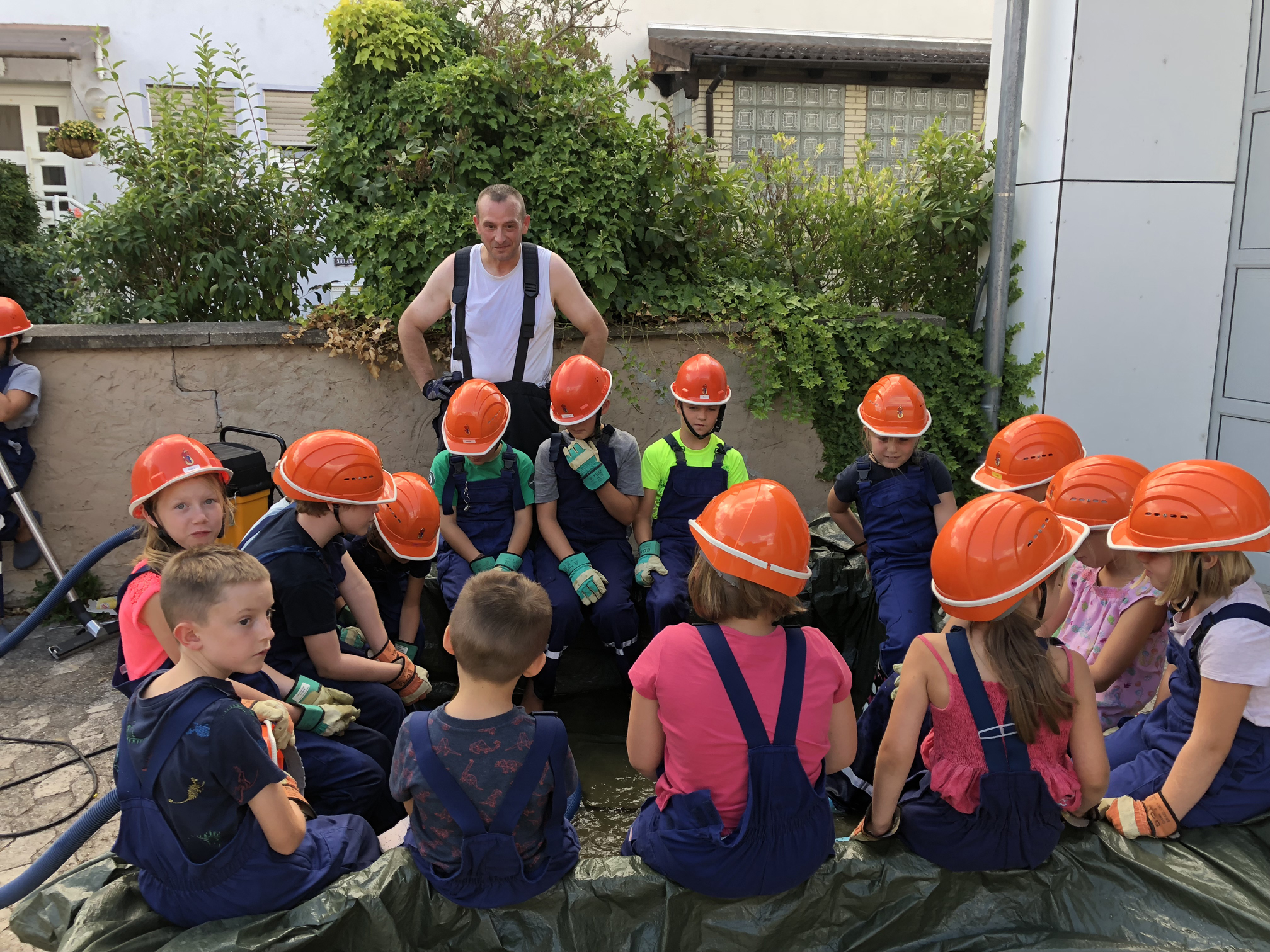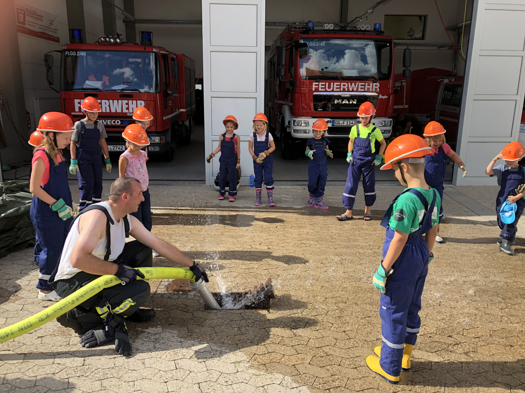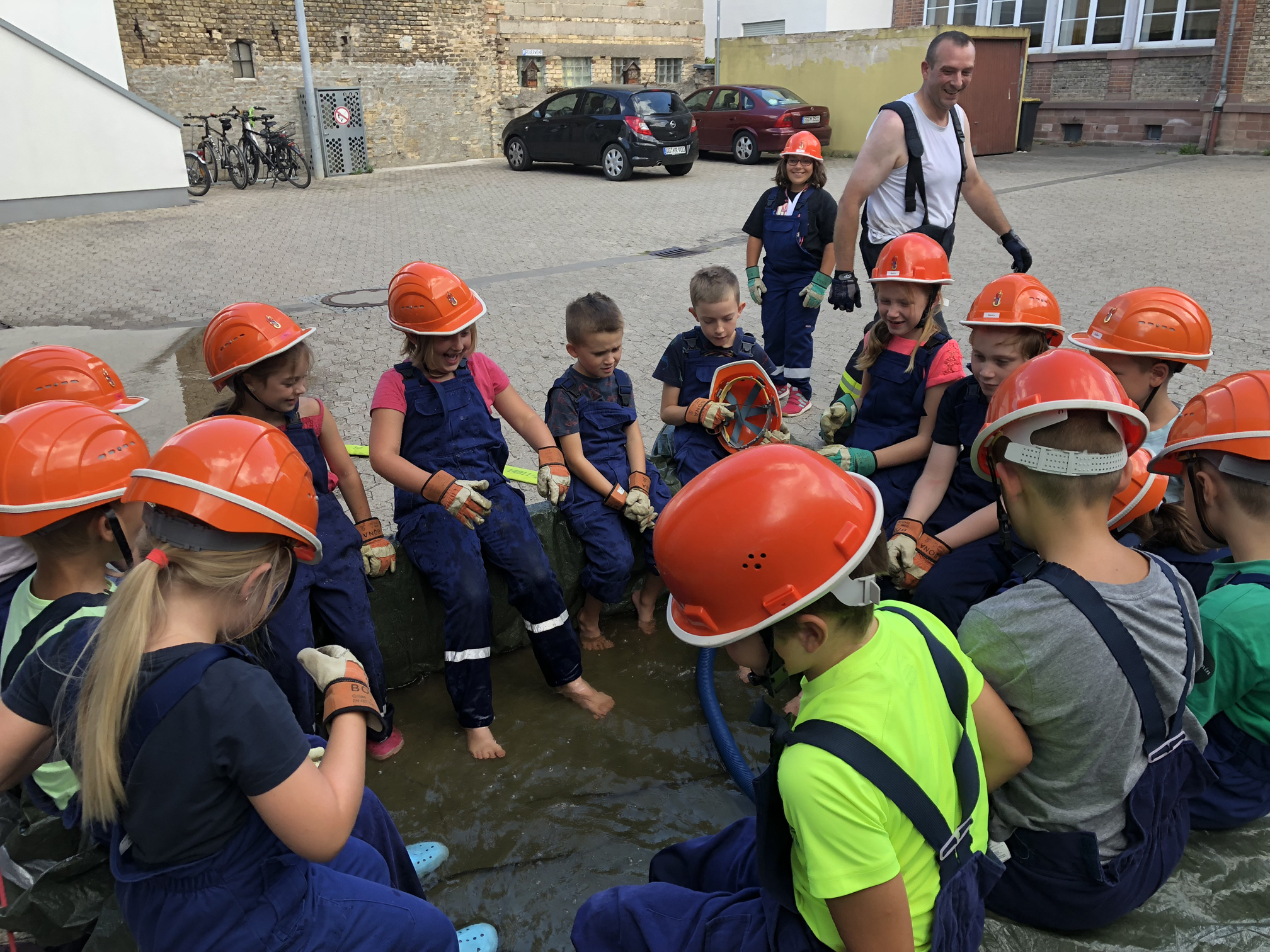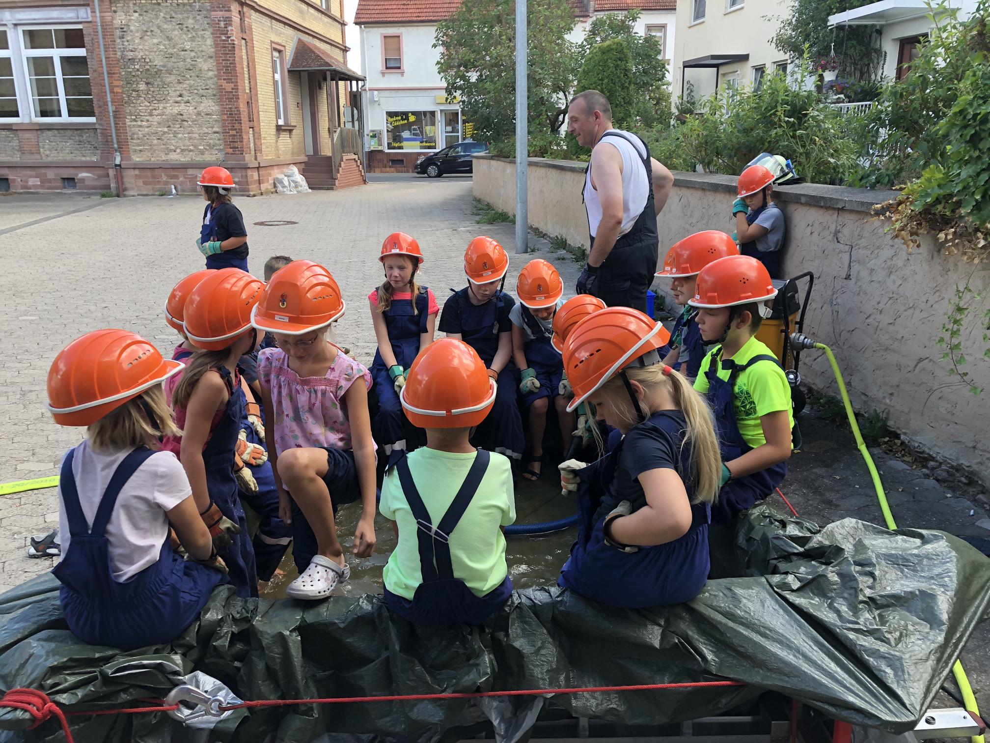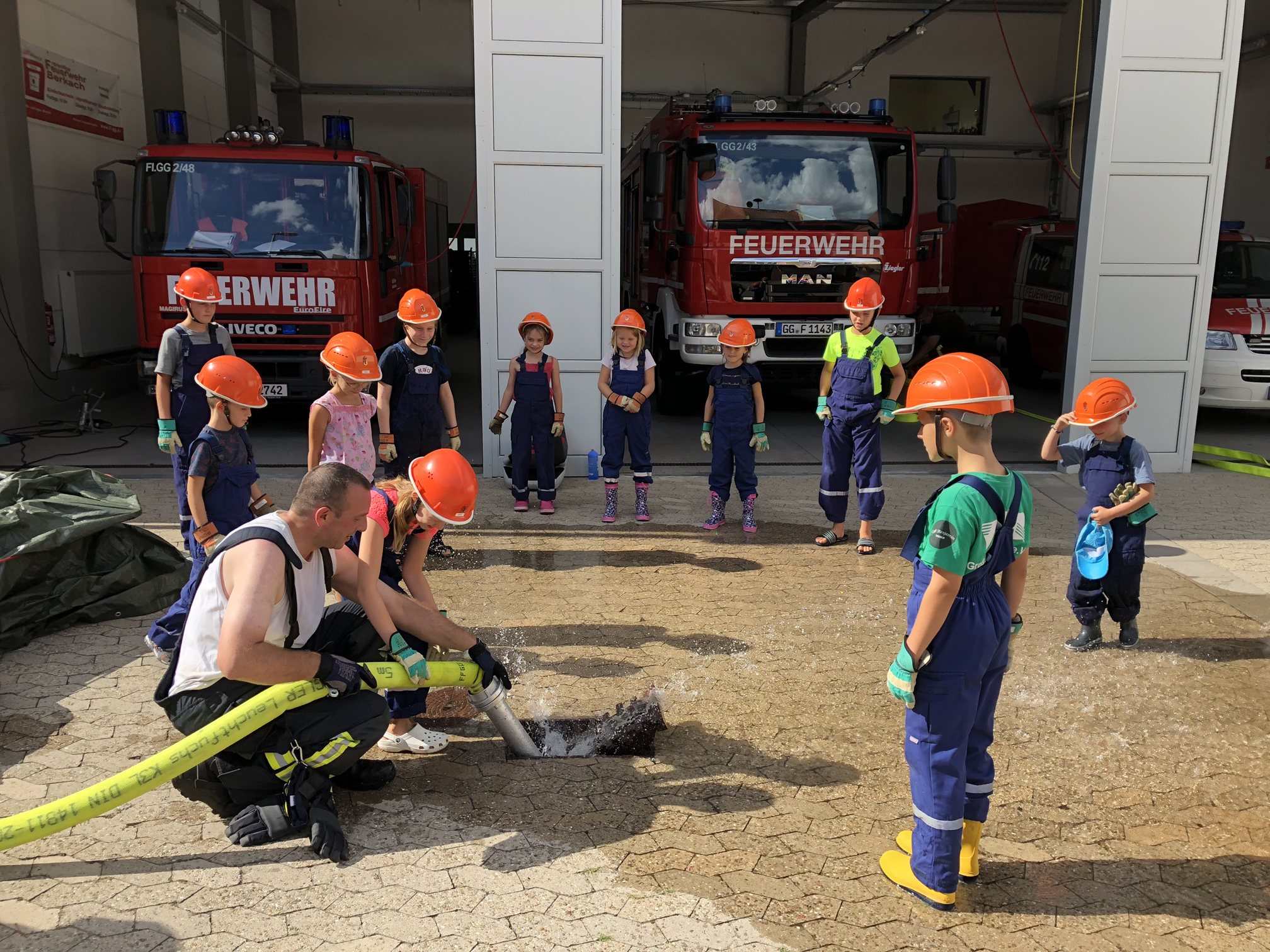 Nach der langen Trockenperiode sind die Flüsse nicht gerade im Begriff, über die Ufer zu treten. Aber auch ein kurzes Gewitter kann dafür sorgen, dass ein Keller vollläuft. Daher beschäftigten sich die Kinder mit dem Thema Hochwasser. Wir überlegten zunächst, wo es Wasser gibt und was die Feuerwehr wohl unternehmen könnte, wenn ein Keller voller Wasser gelaufen ist. Danach wollten wir das Besprochene in die Praxis umsetzen. Zum Glück entdeckten wir auf dem Hof ein Leiterbecken voller Wasser, das nur darauf wartete, leergepumpt zu werden. Die Feuervögel stellten dafür zunächst eine Pumpe in das Becken. Als diese irgendwann nicht weiterkam, wurde mit einem Wassersauger gesaugt. Nachdem die Kinder sich anfangs gewundert hatten, dass es Staubsauger für Wasser gibt, waren sie schon nach kurzer Zeit eifrig am saugen. So war also am Schluss das Becken leer und die Kinder hatten nasse Füße und viel Spaß.