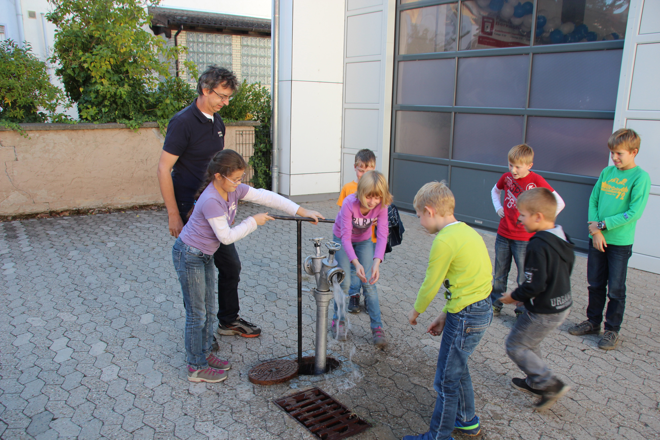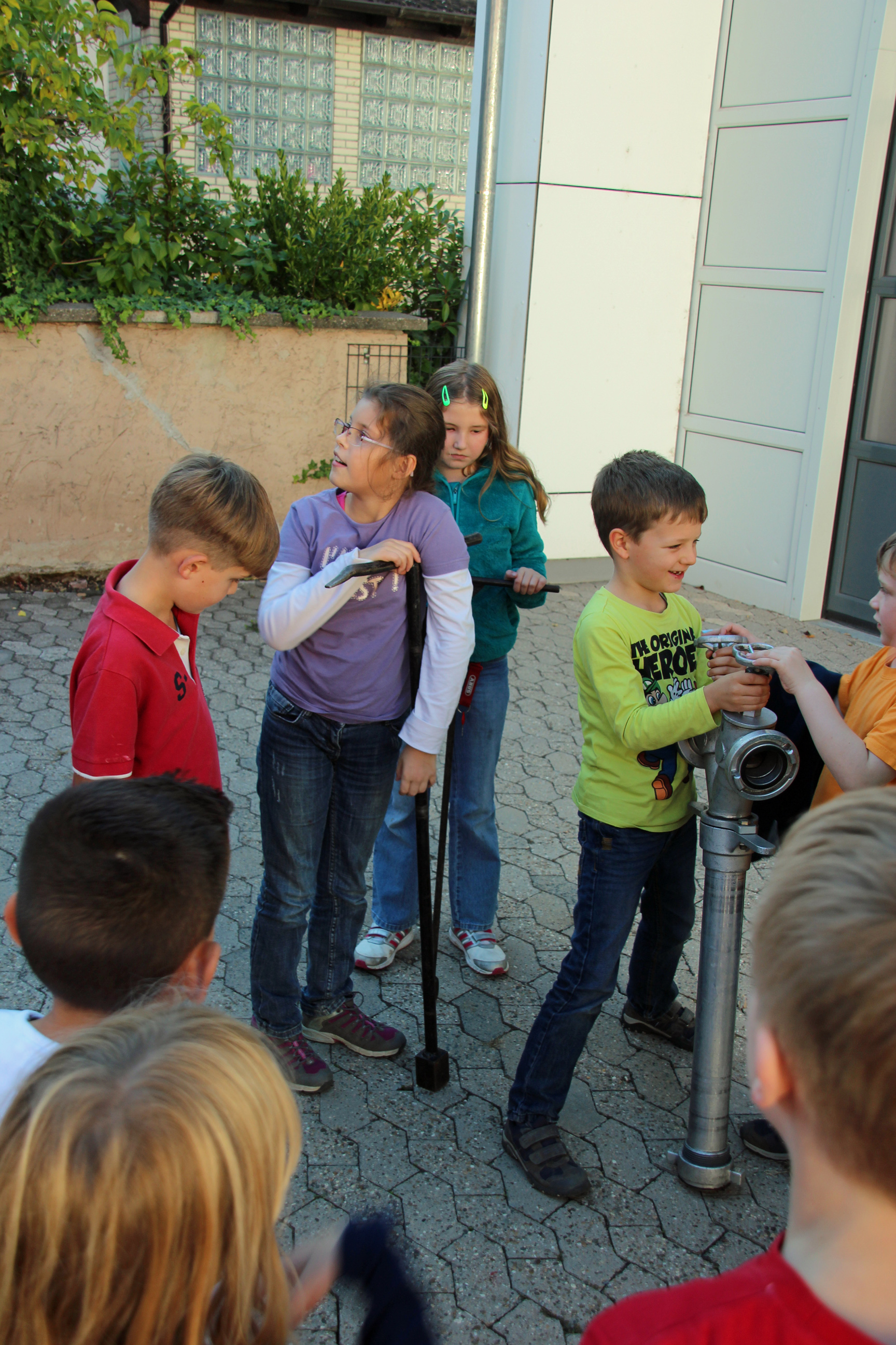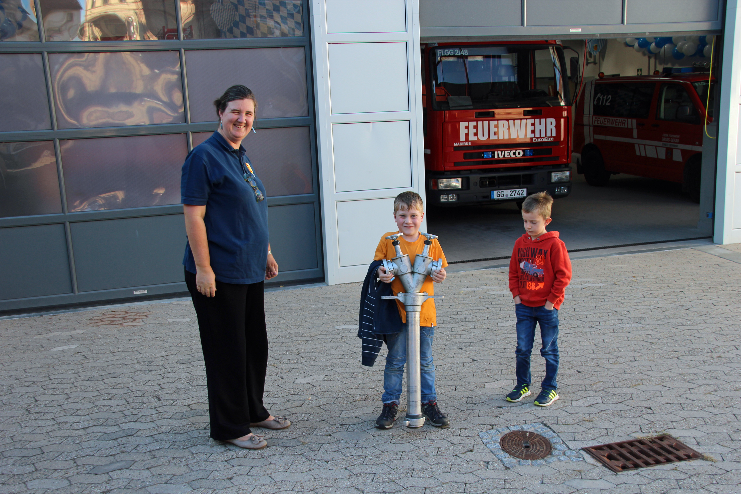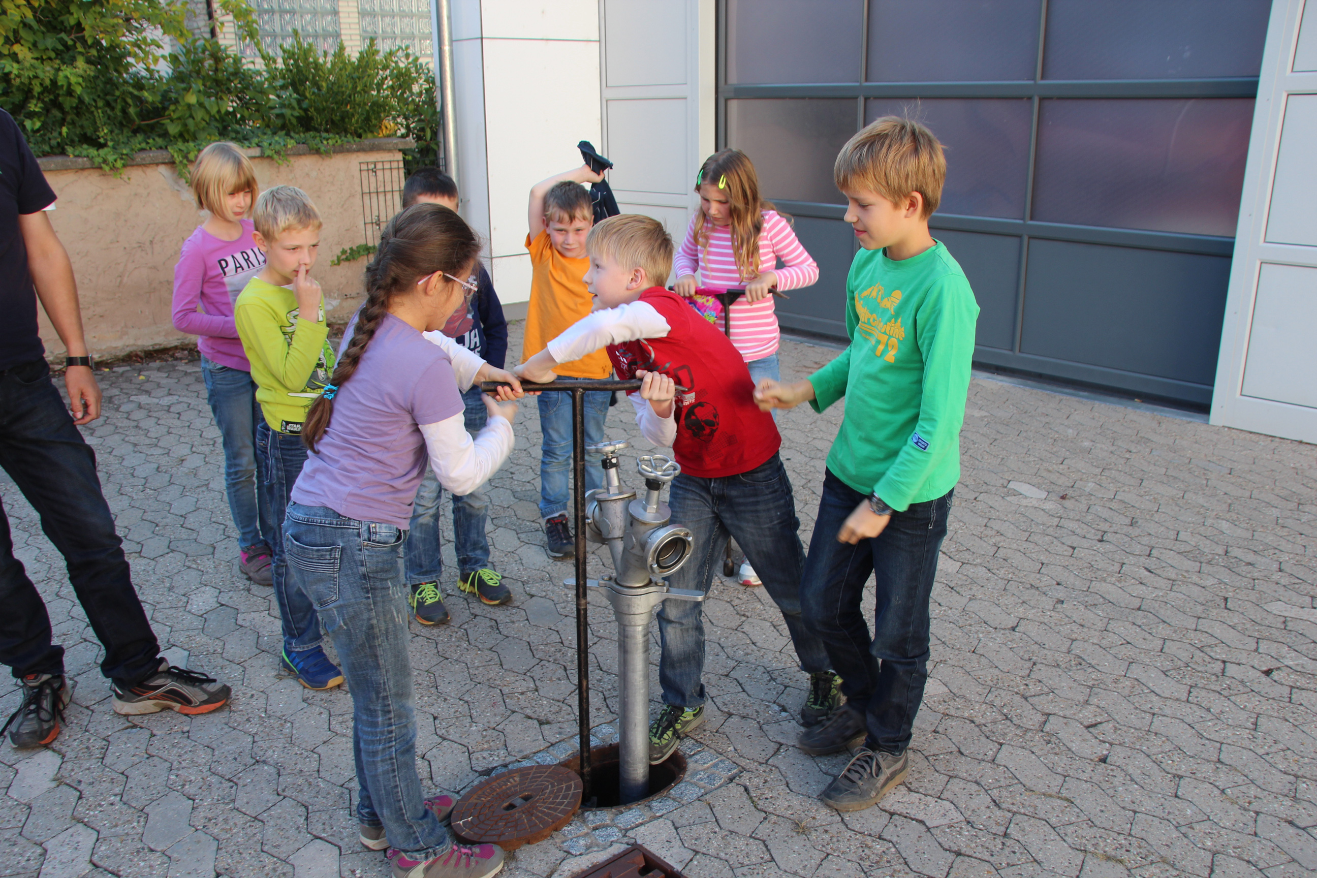 Im Schulungsraum fanden die Feuervögel viele Schilder, die man am Straßenrand sehen kann. Aber nur einige haben mit der Feuerwehr zu tun und noch weniger davon waren Hydrantenschilder. Als das herausgefunden war, durften die Kinder mit großen und kleinen Schritten die Hydrantenschilder lesen und auswerten. Das klappte prima, und so rückten wir am Schluss im Hof auch noch einem echten Hydranten auf die Pelle und schauten ihn uns außen und innen genau an.