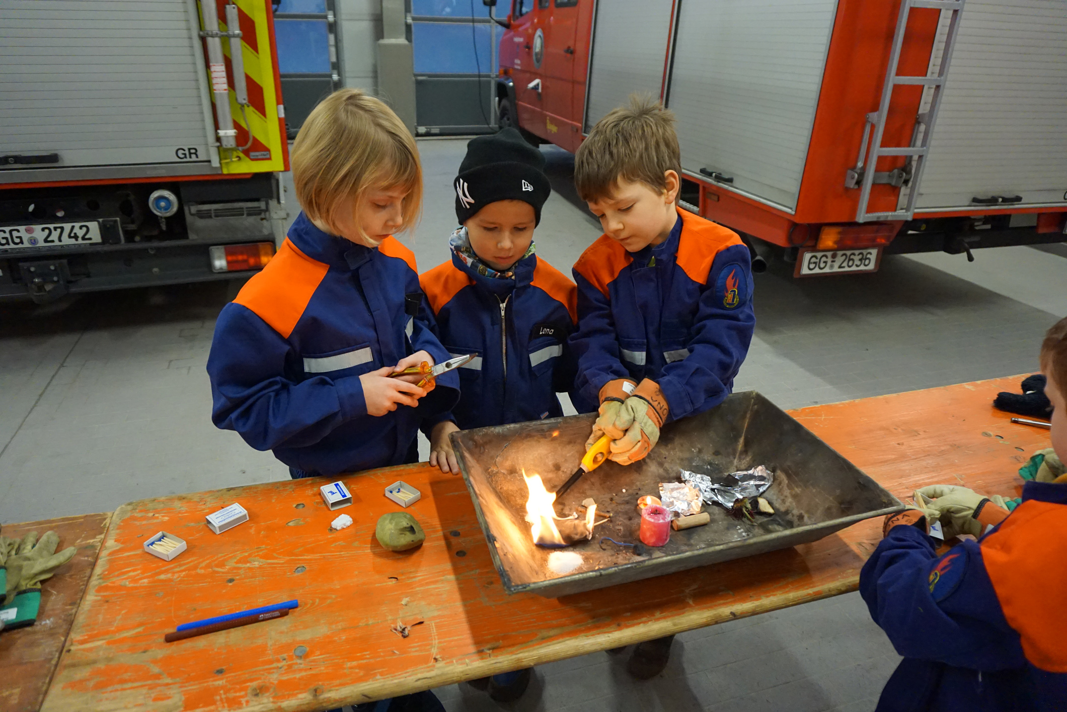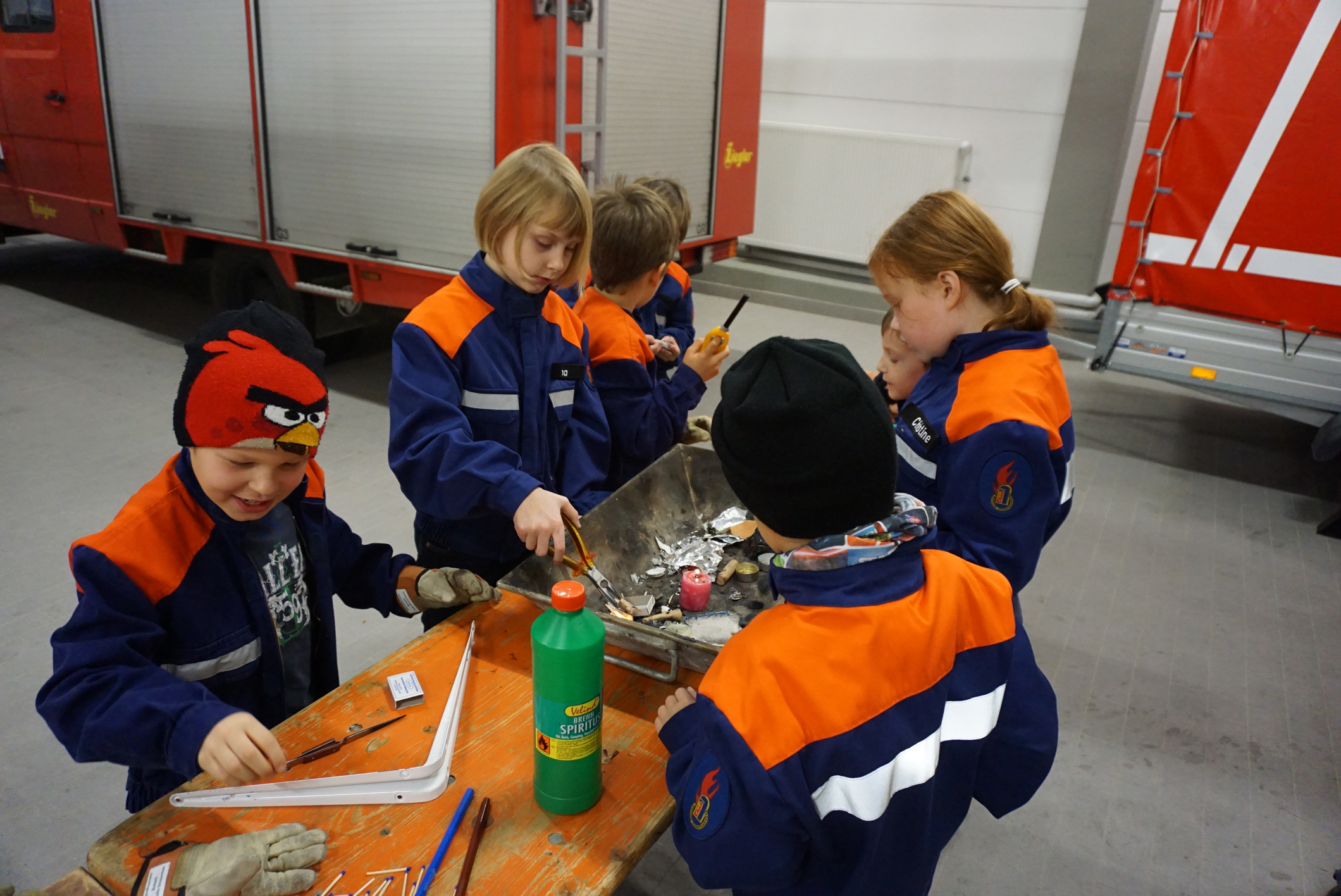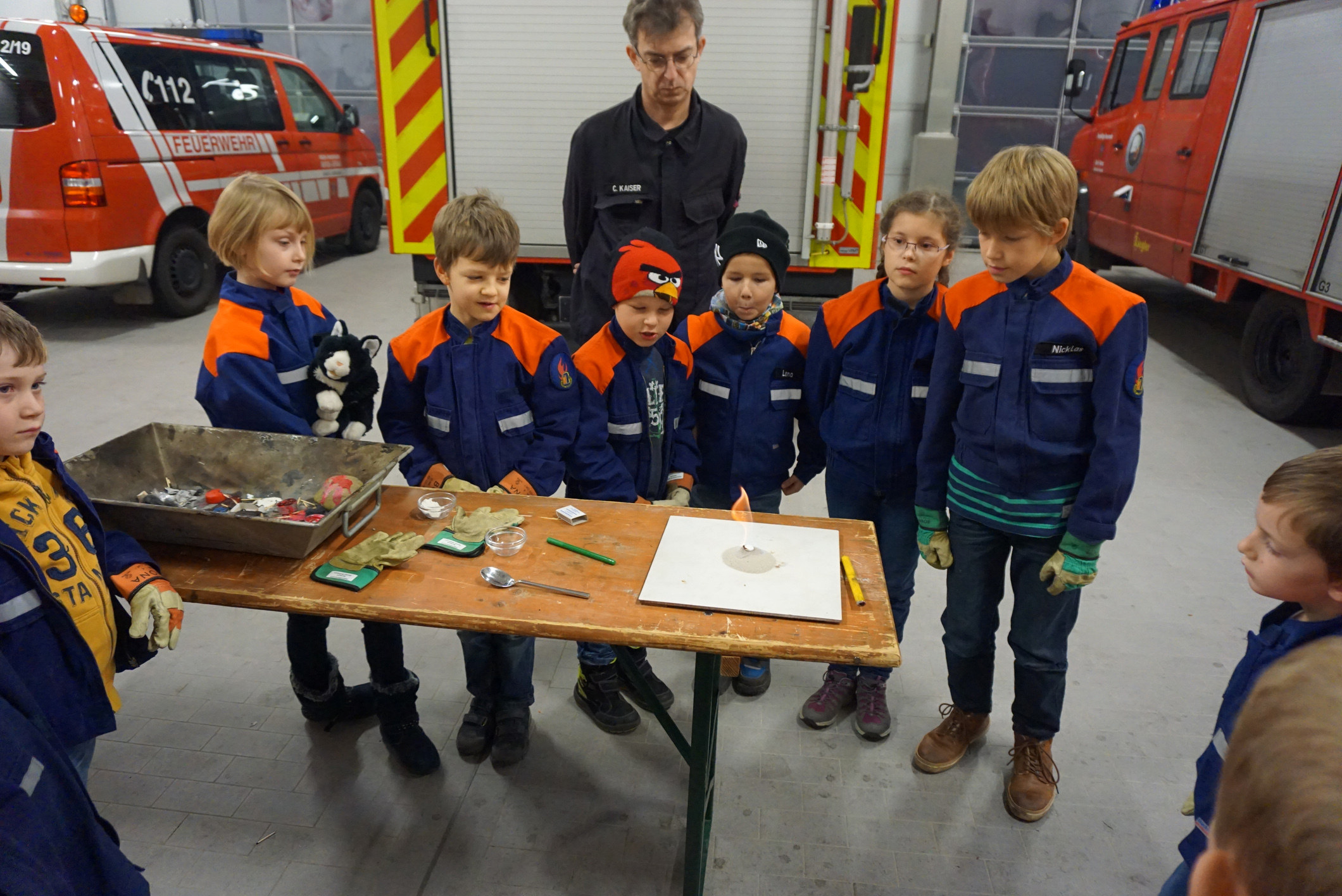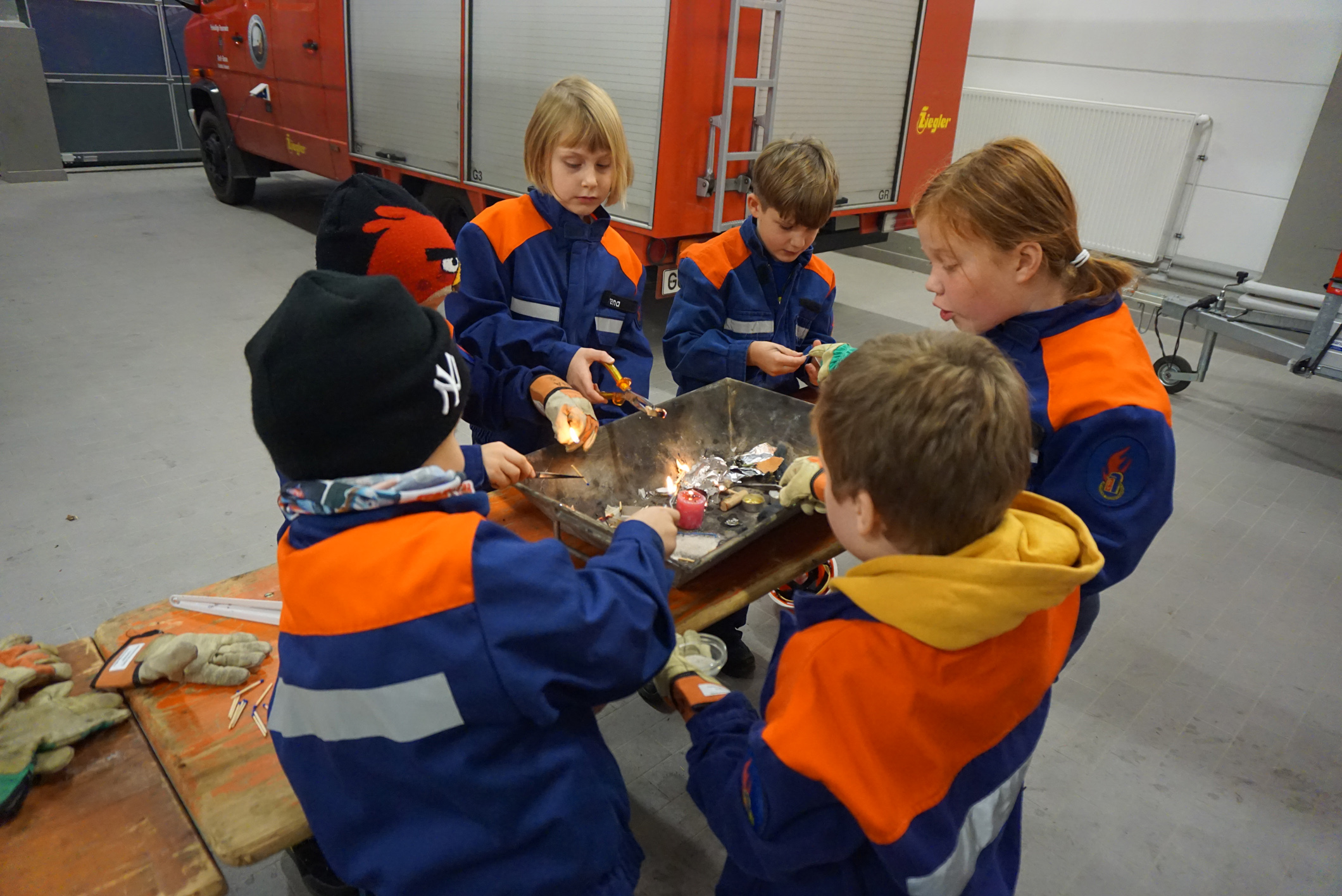 Heute wollten es die Feuervögel genau wissen: Welche Materialien brennen und welche nicht? Das mussten wir natürlich in der Praxis ausprobieren, und so roch es in der Fahrzeughalle recht schnell etwas angekokelt. Aber die Feuervögel können natürlich gut mit Feuer umgehen und zeigten sich mit Pinzette und Handschuhen sehr umsichtig.
