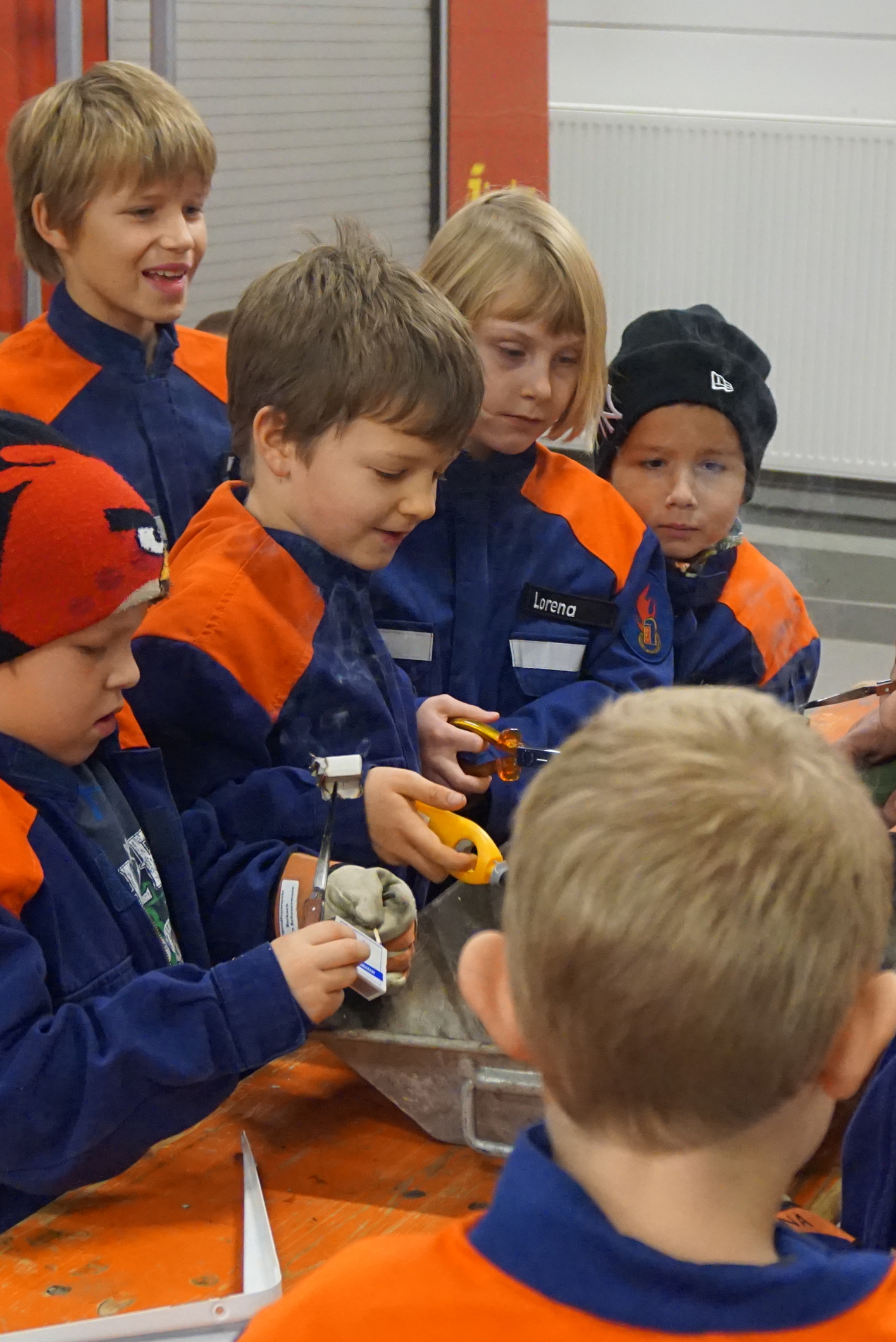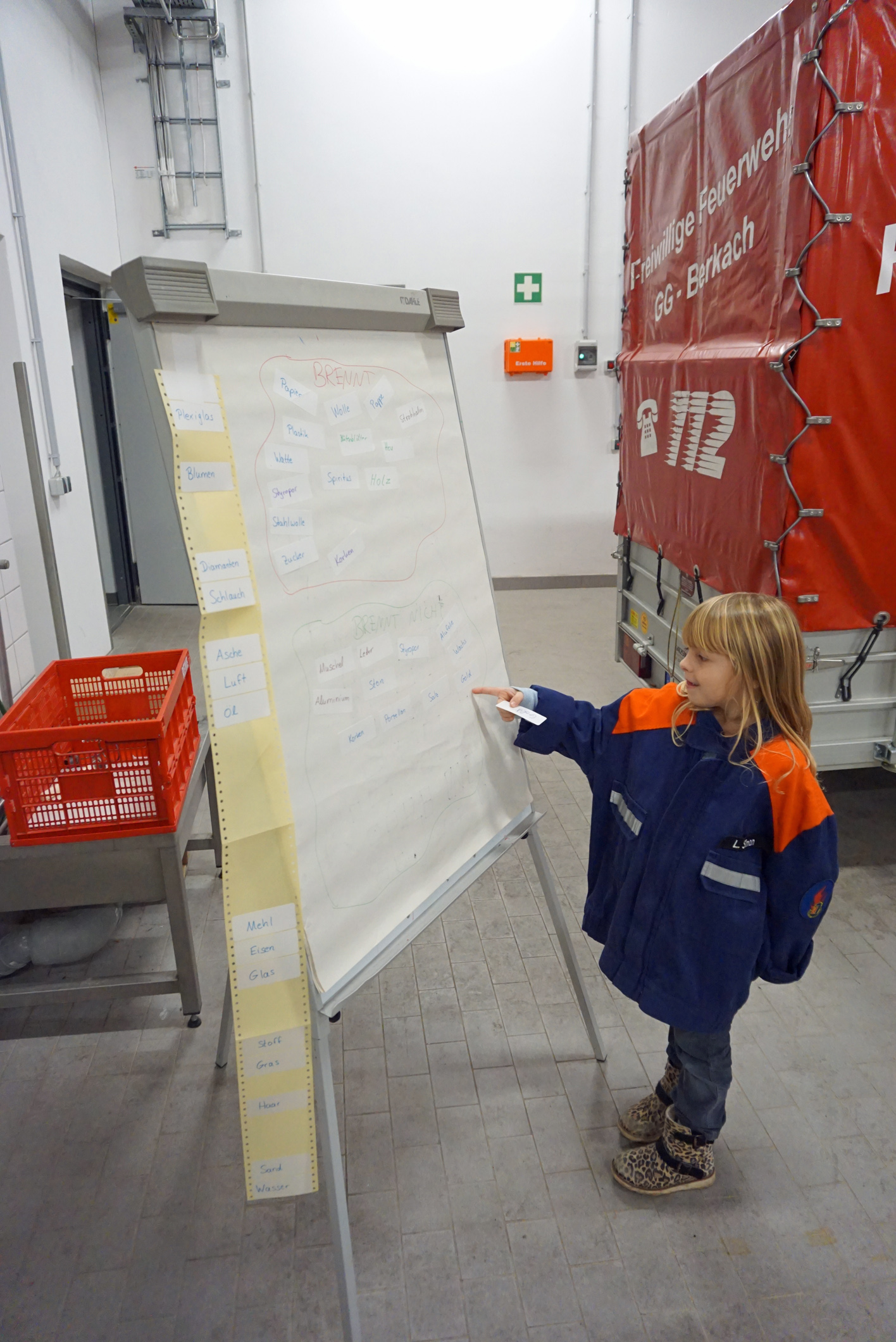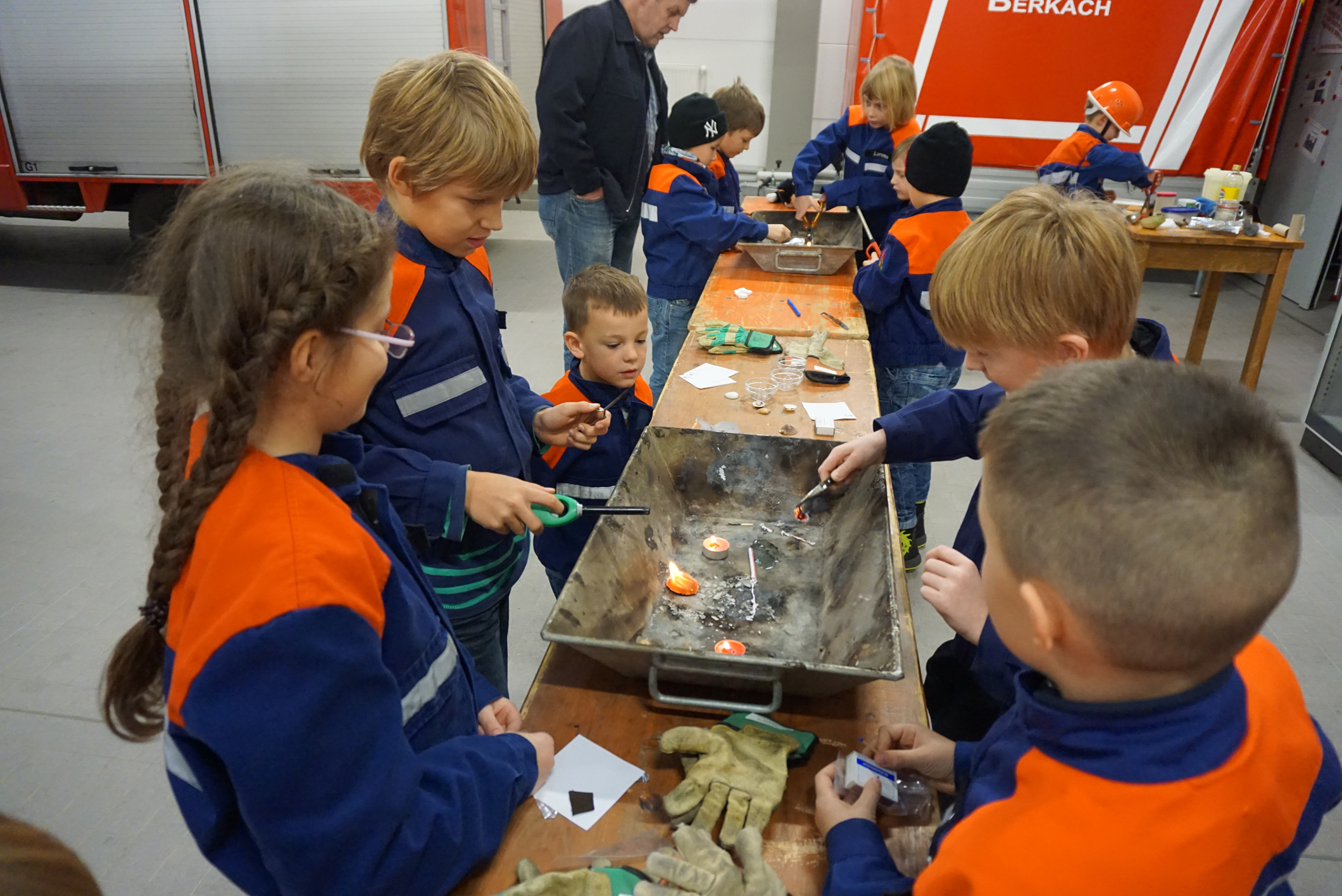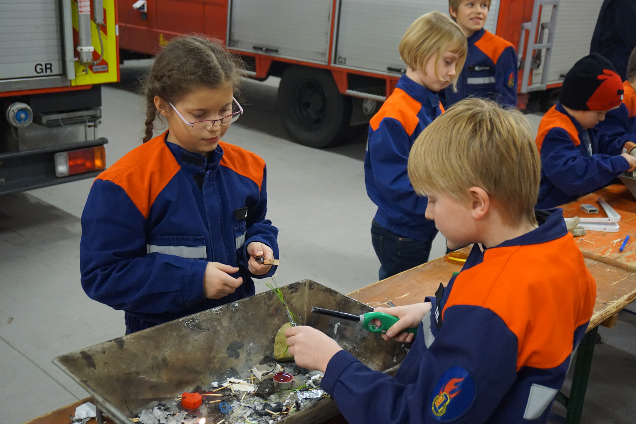 Heute wollten es die Feuervögel genau wissen: Welche Materialien brennen und welche nicht? Das mussten wir natürlich in der Praxis ausprobieren, und so roch es in der Fahrzeughalle recht schnell etwas angekokelt. Aber die Feuervögel können natürlich gut mit Feuer umgehen und zeigten sich mit Pinzette und Handschuhen sehr umsichtig.
