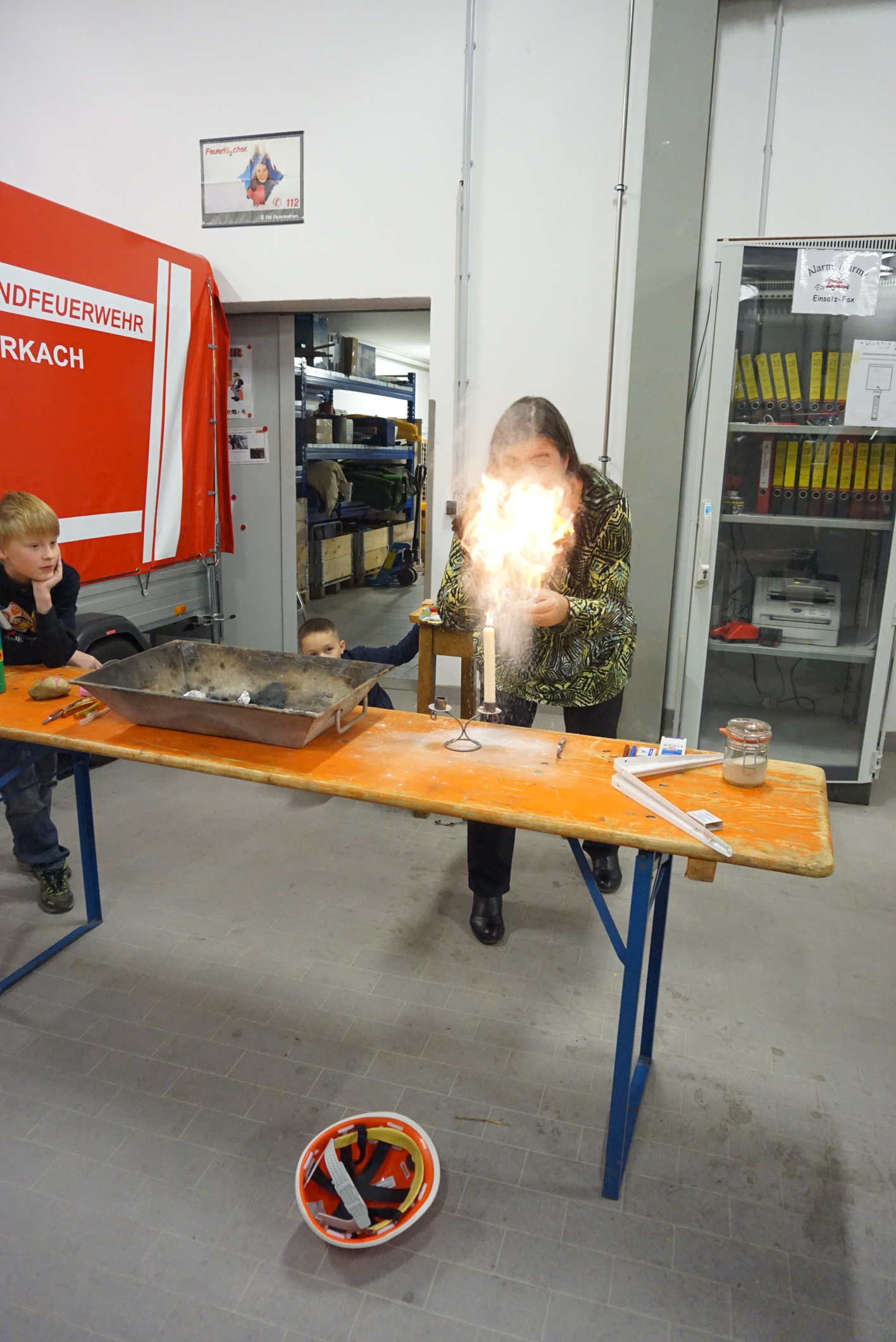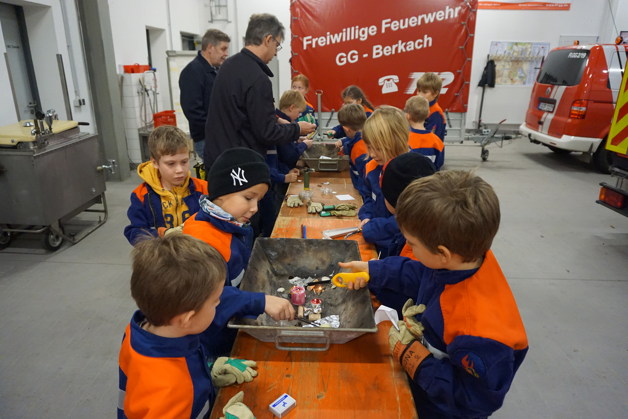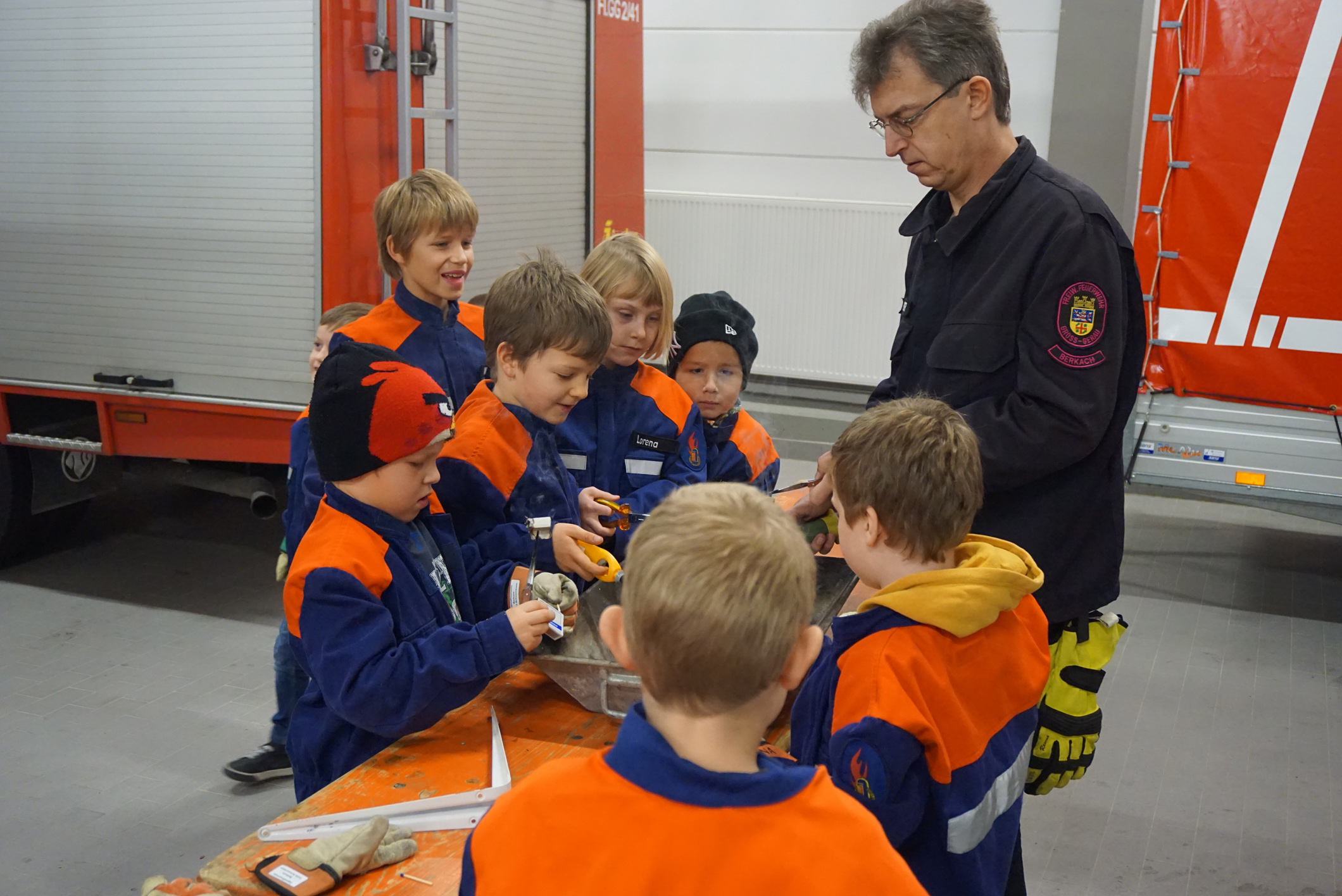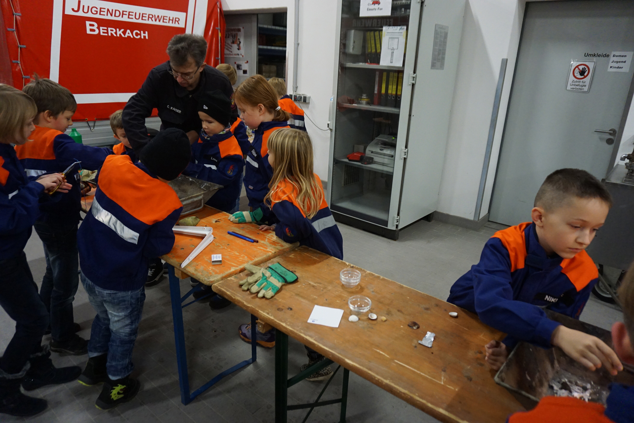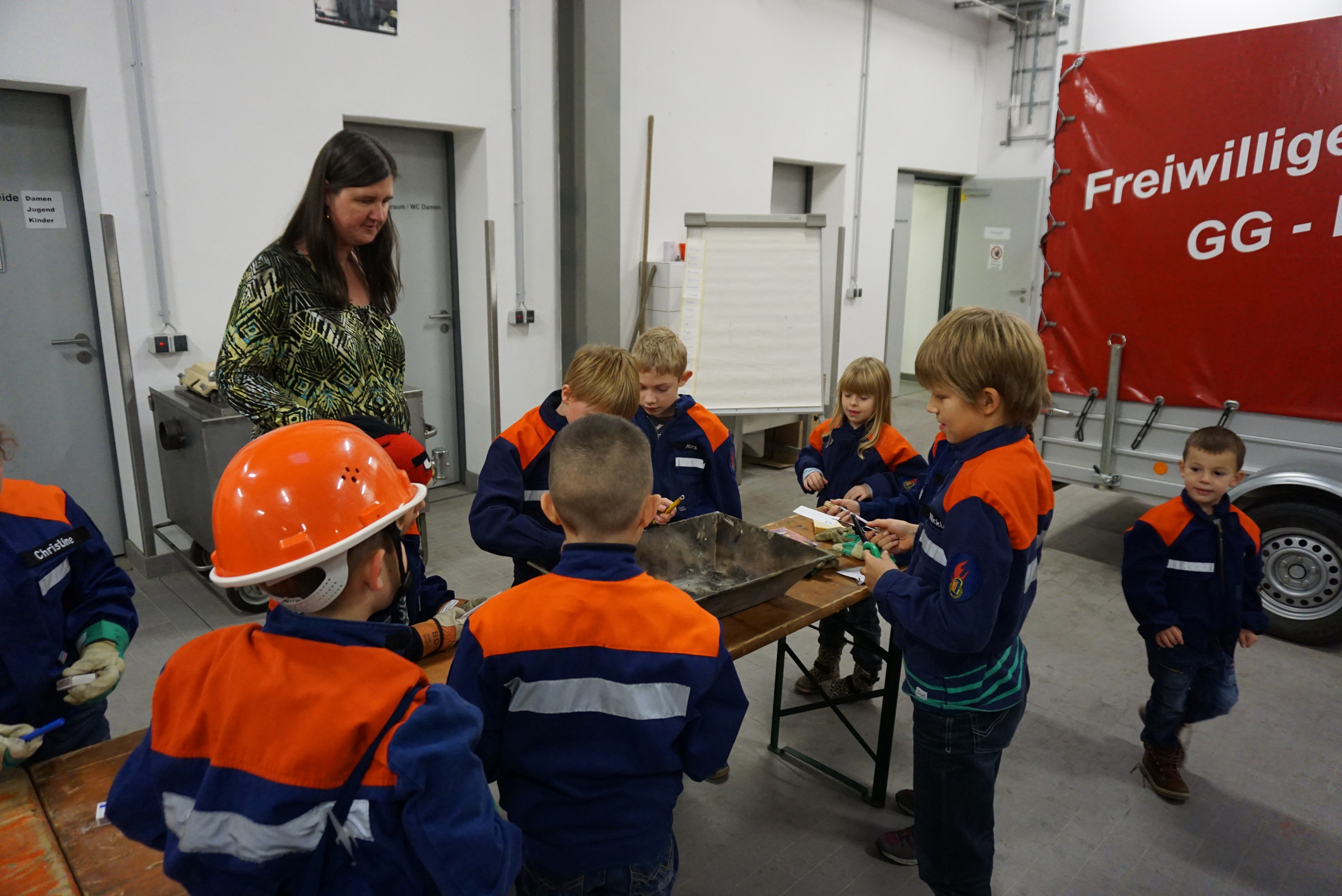 Heute wollten es die Feuervögel genau wissen: Welche Materialien brennen und welche nicht? Das mussten wir natürlich in der Praxis ausprobieren, und so roch es in der Fahrzeughalle recht schnell etwas angekokelt. Aber die Feuervögel können natürlich gut mit Feuer umgehen und zeigten sich mit Pinzette und Handschuhen sehr umsichtig.