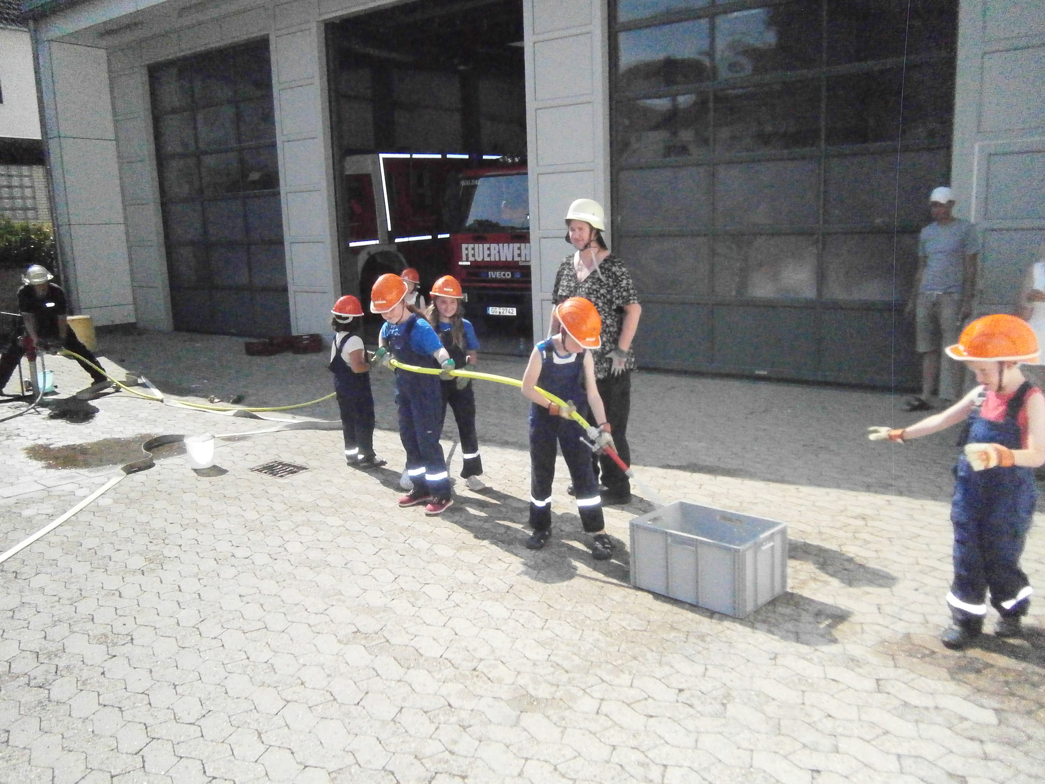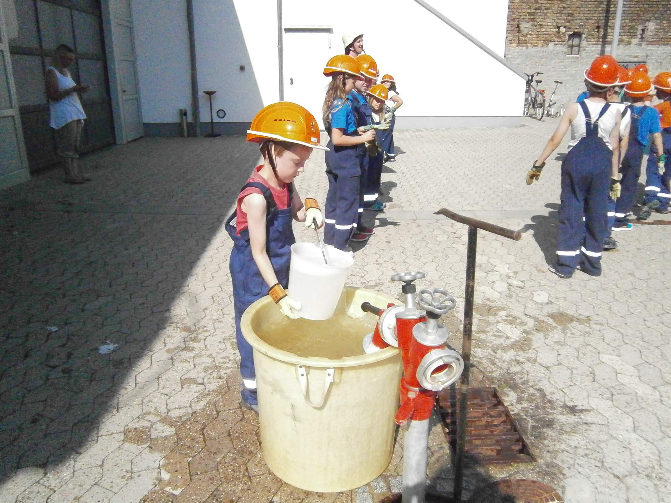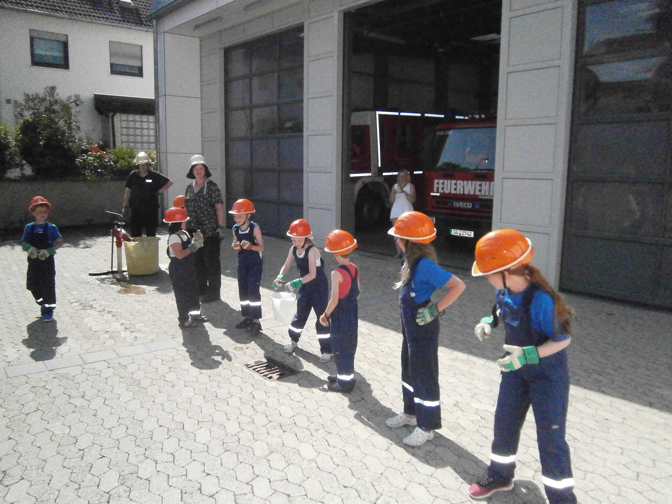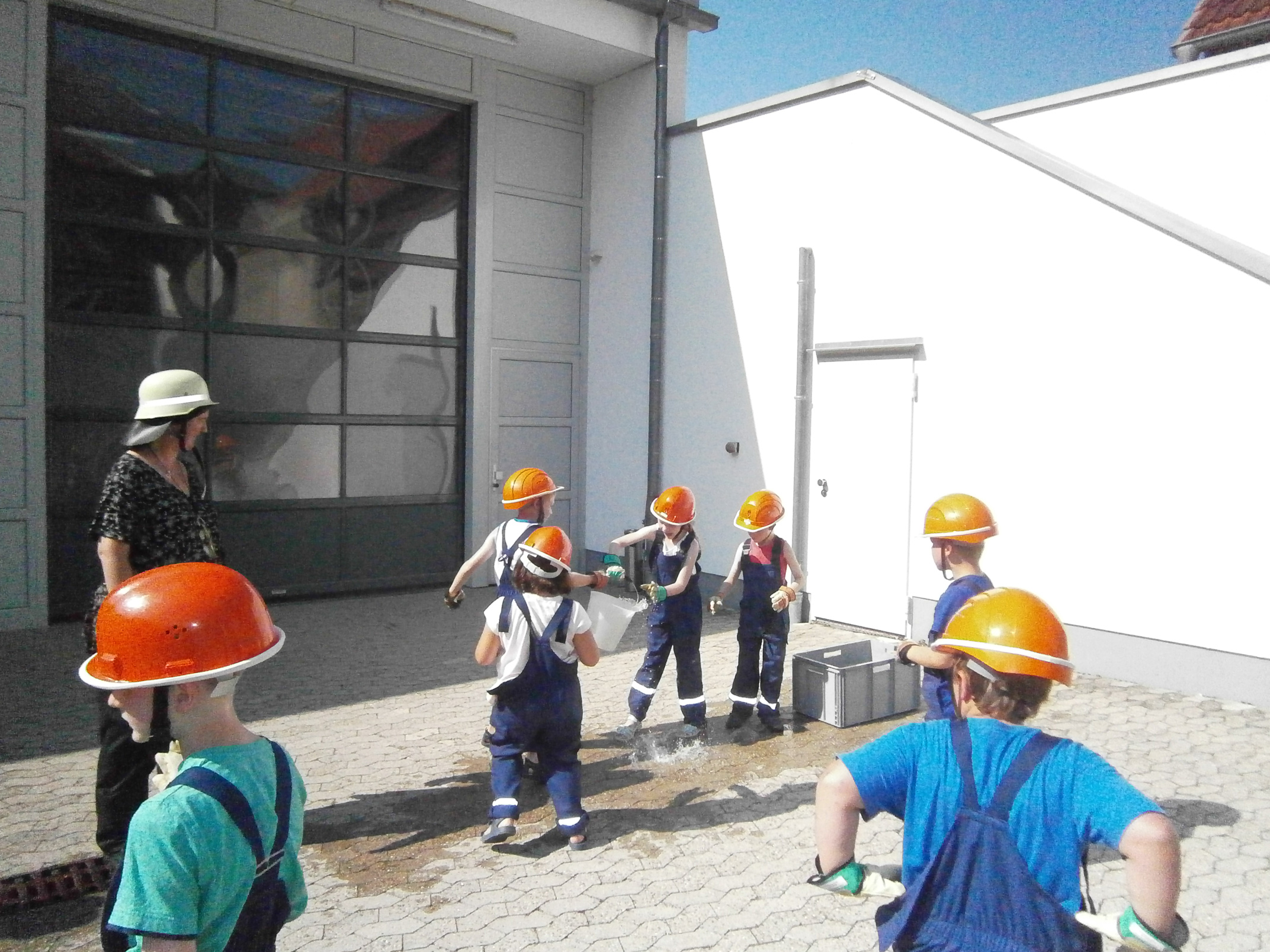 Zunächst überlegten die Feuervögel, wo es überall Wasser gibt und wie man es zu einem Feuer befördern kann. Dann sollte das natürlich auch in der Praxis ausprobiert werden. Zunächst probierten wir es mit einer Eimerkette und dann mit Schläuchen. Beide Male gelangte das Wasser wirklich fix vom einen Eimer in den anderen, wenn auch der eine oder andere Tropfen auch mal daneben ging.