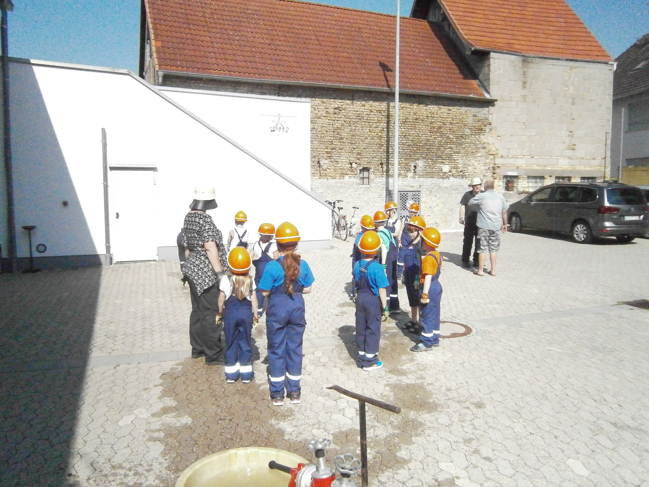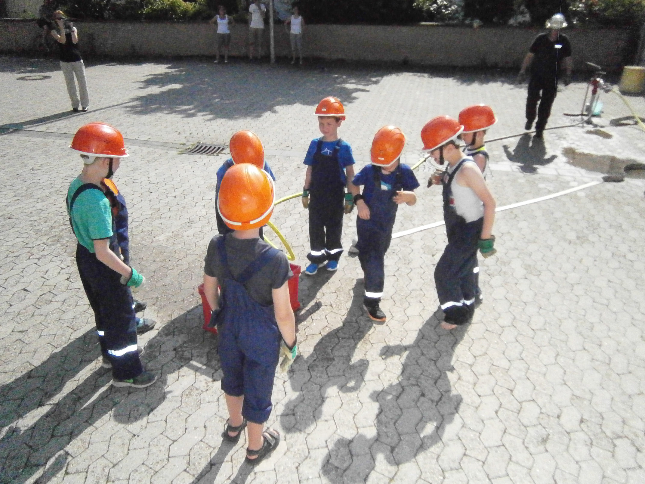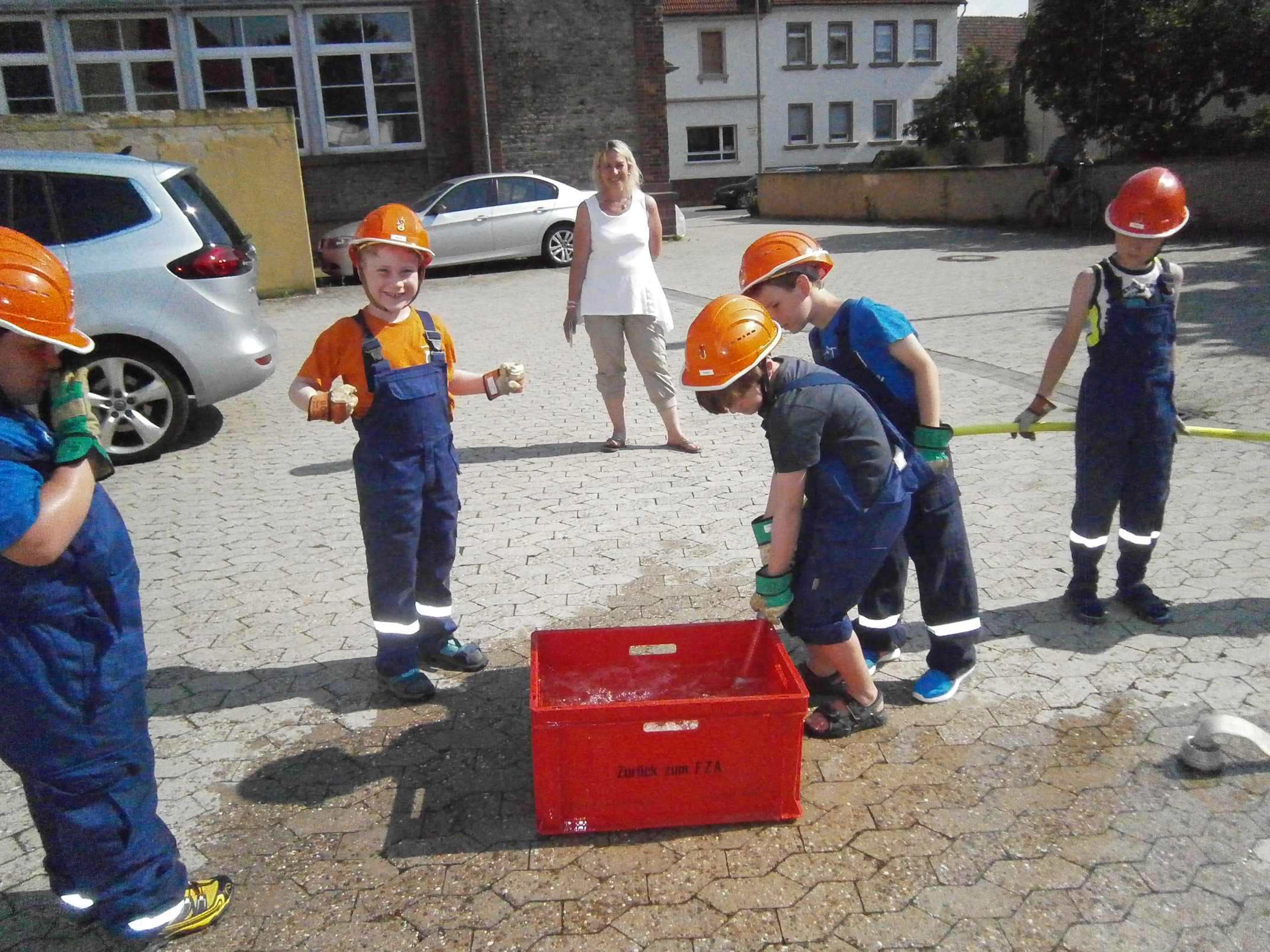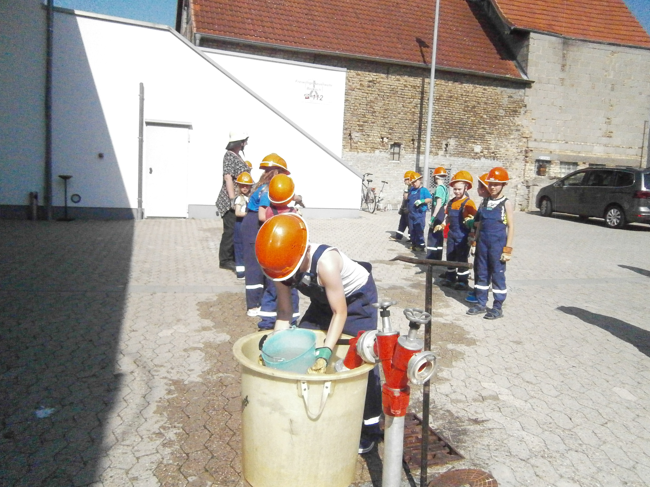 Zunächst überlegten die Feuervögel, wo es überall Wasser gibt und wie man es zu einem Feuer befördern kann. Dann sollte das natürlich auch in der Praxis ausprobiert werden. Zunächst probierten wir es mit einer Eimerkette und dann mit Schläuchen. Beide Male gelangte das Wasser wirklich fix vom einen Eimer in den anderen, wenn auch der eine oder andere Tropfen auch mal daneben ging.