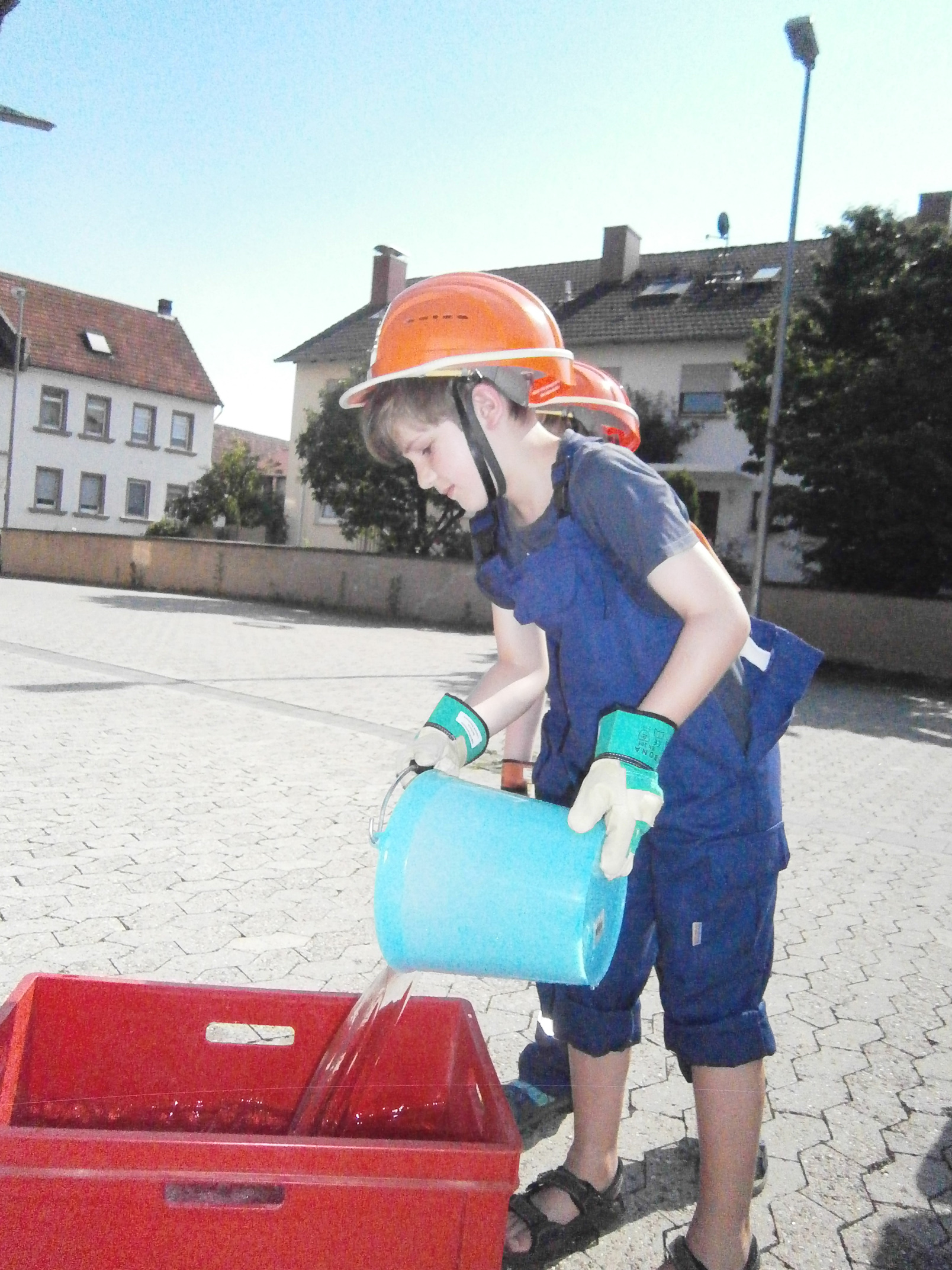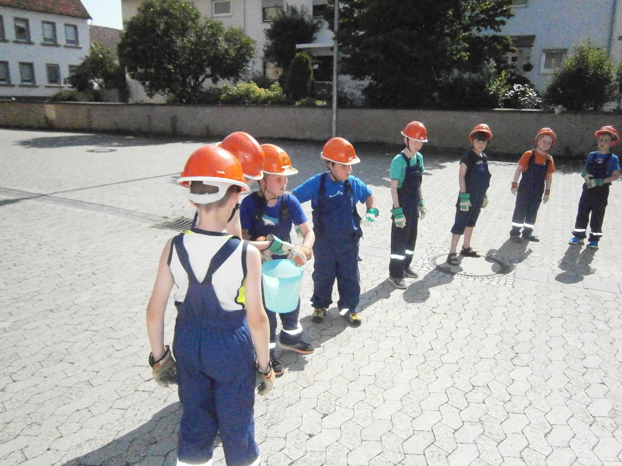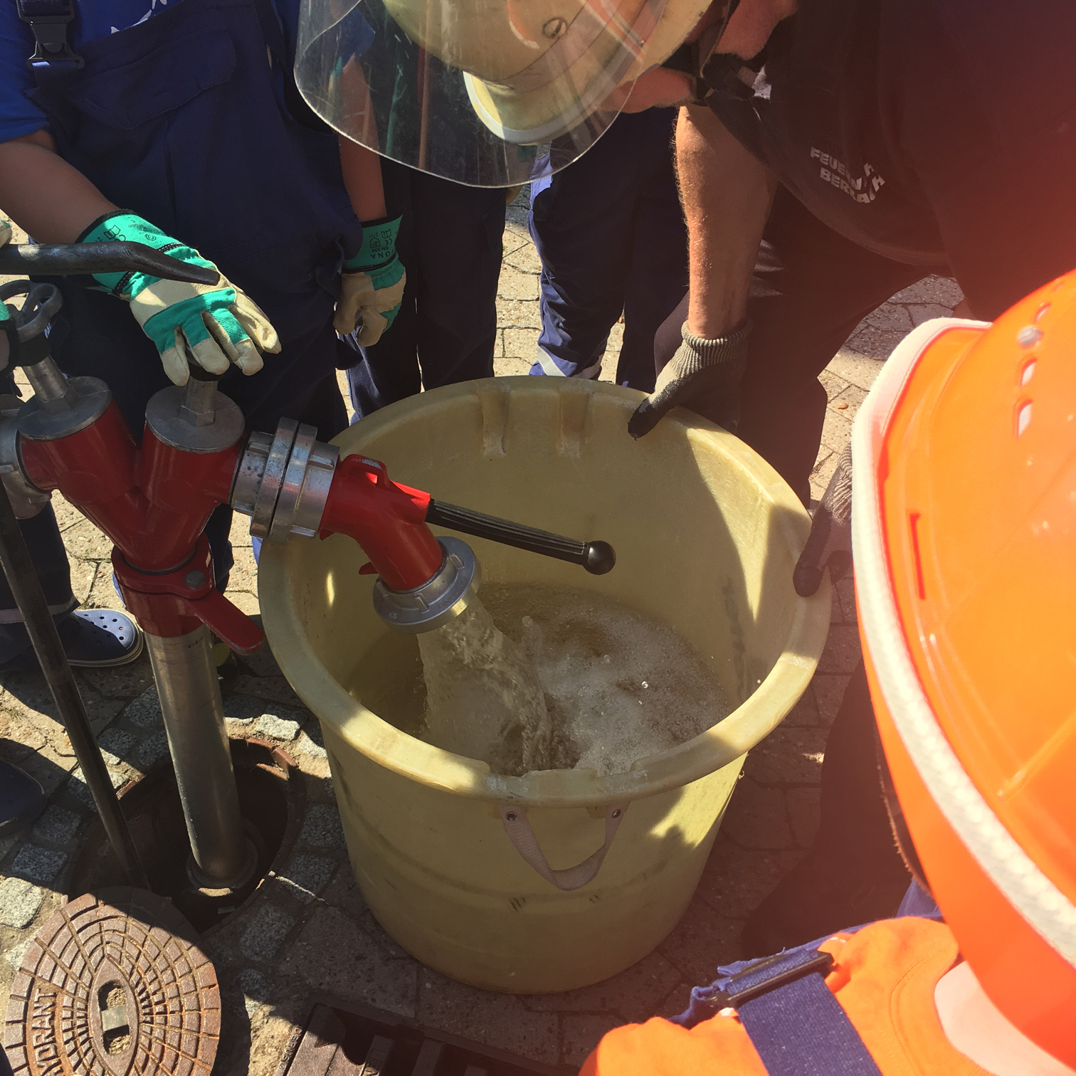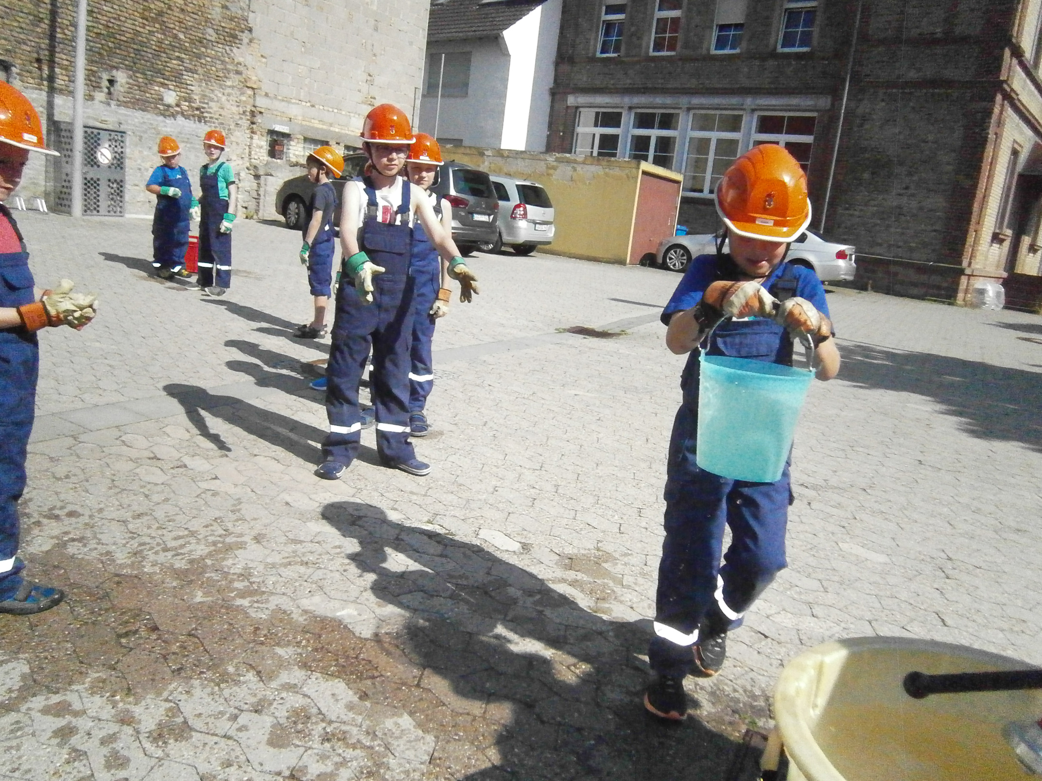 Zunächst überlegten die Feuervögel, wo es überall Wasser gibt und wie man es zu einem Feuer befördern kann. Dann sollte das natürlich auch in der Praxis ausprobiert werden. Zunächst probierten wir es mit einer Eimerkette und dann mit Schläuchen. Beide Male gelangte das Wasser wirklich fix vom einen Eimer in den anderen, wenn auch der eine oder andere Tropfen auch mal daneben ging.