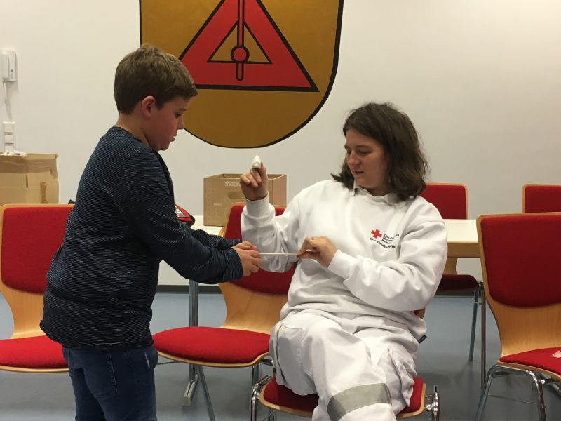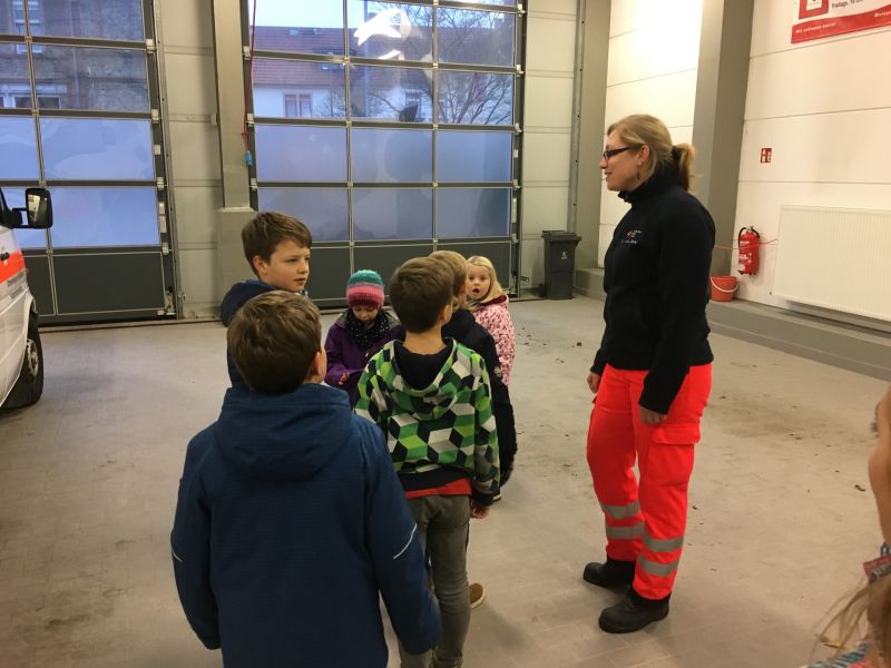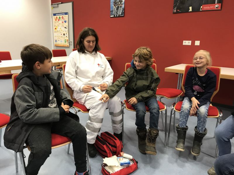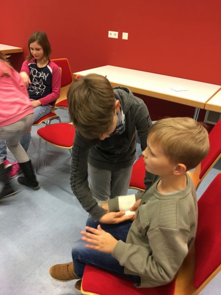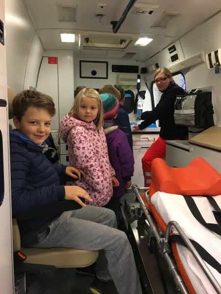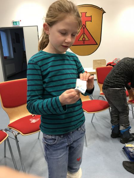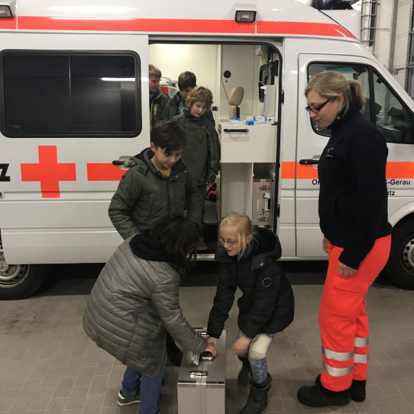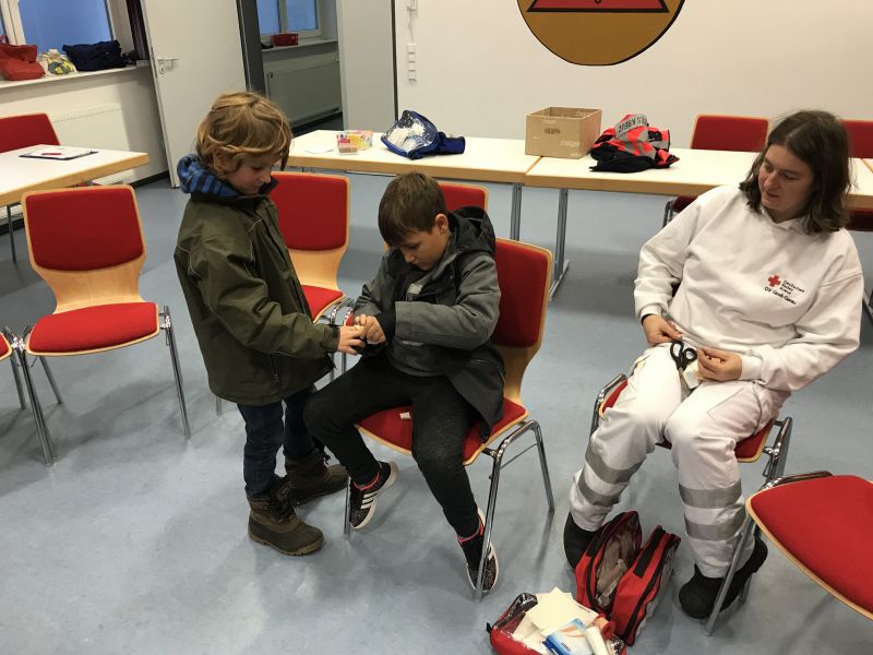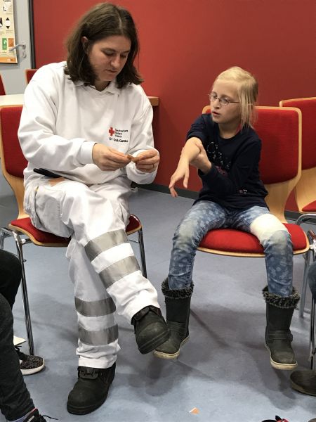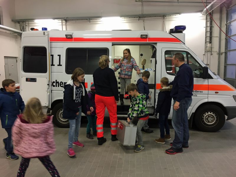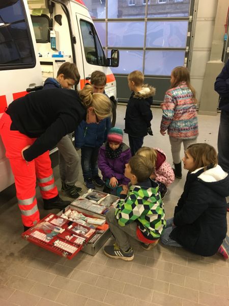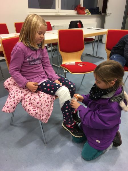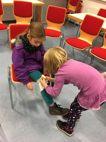 Nanu?! Diesmal stand in der Fahrzeughalle ein anderes Fahrzeug als normalerweise. Es war kein Feuerwehrauto, sondern ein Rettungswagen, wie sich schnell herausstellte. Mit dem Fahrzeug waren Annika und Anne gekommen. Die beiden kannten sich nicht nur hervorragend mit dem Rettungswagen aus, sondern konnten den Kindern auch genau zeigen, wie man einen Fingerkuppenverband anlegt oder mit einem Verbandspäckchen umgeht.
