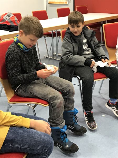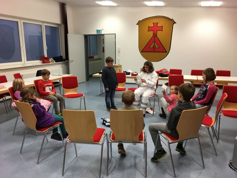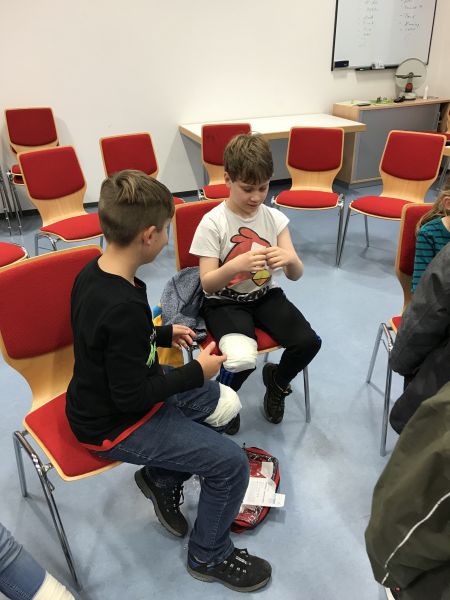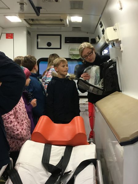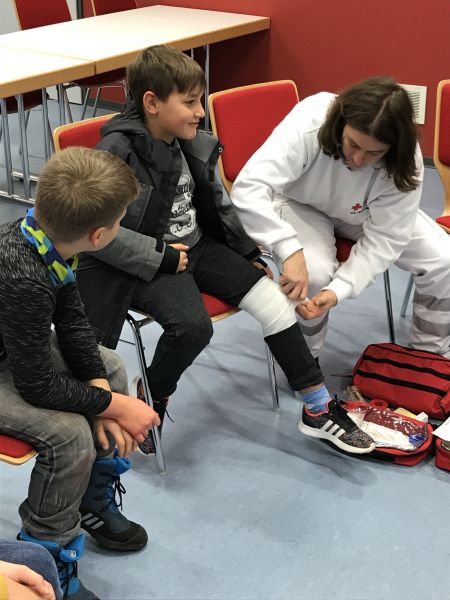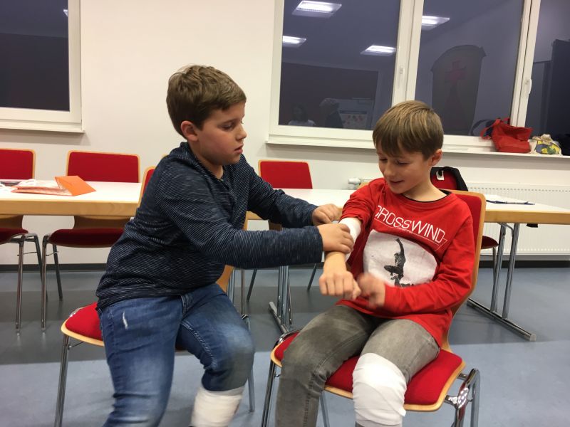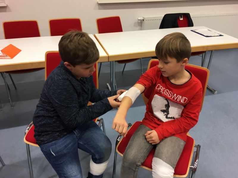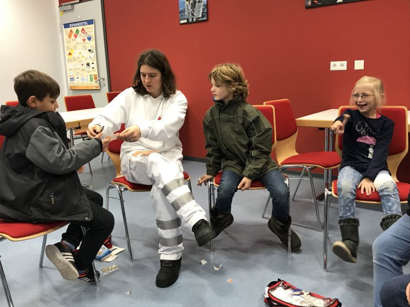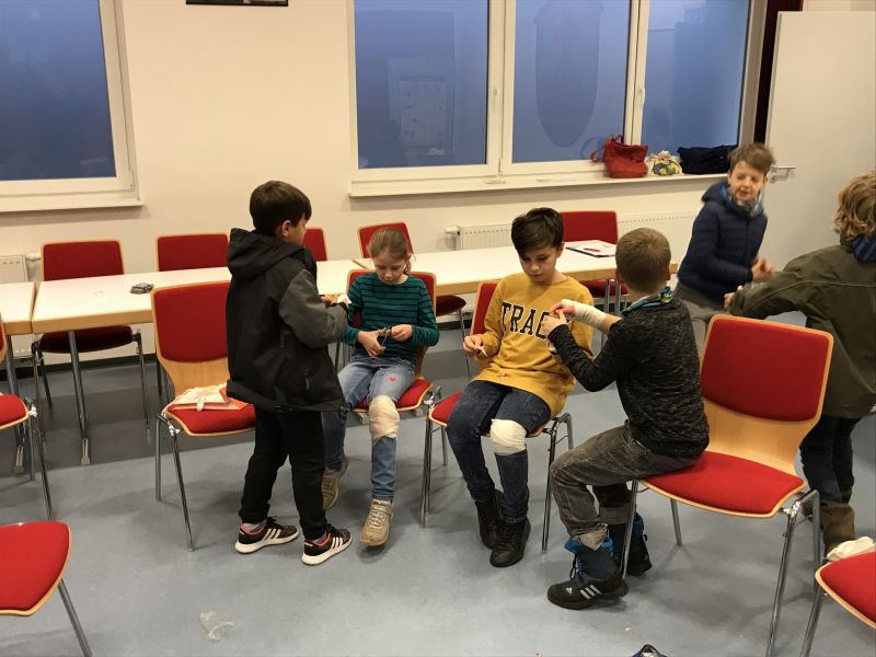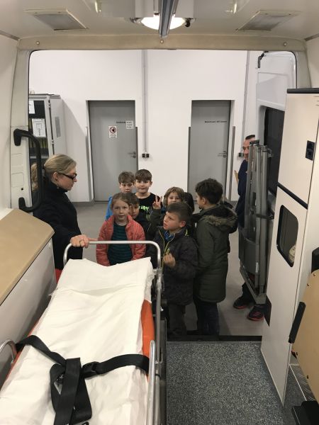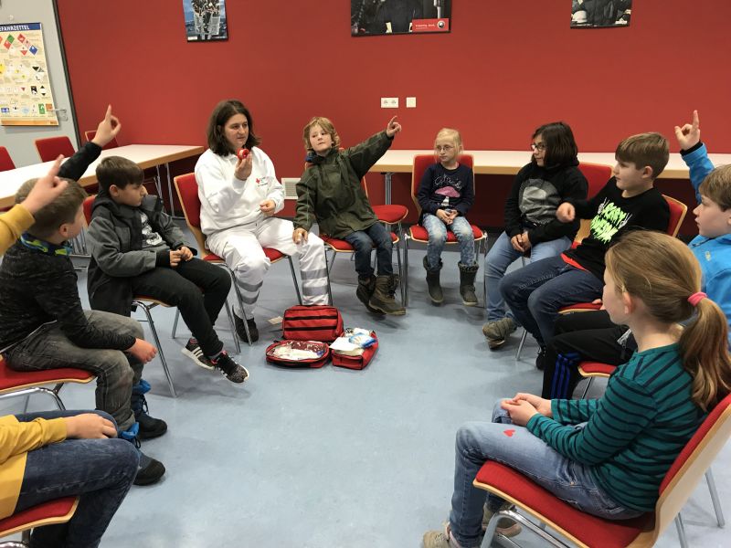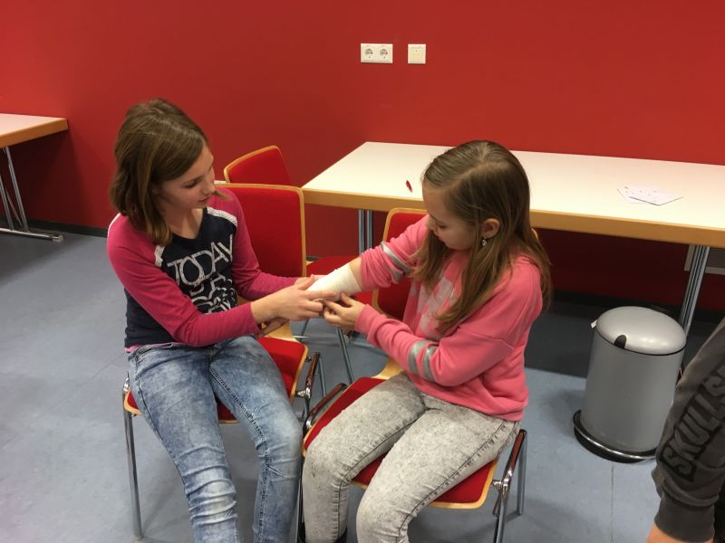 Nanu?! Diesmal stand in der Fahrzeughalle ein anderes Fahrzeug als normalerweise. Es war kein Feuerwehrauto, sondern ein Rettungswagen, wie sich schnell herausstellte. Mit dem Fahrzeug waren Annika und Anne gekommen. Die beiden kannten sich nicht nur hervorragend mit dem Rettungswagen aus, sondern konnten den Kindern auch genau zeigen, wie man einen Fingerkuppenverband anlegt oder mit einem Verbandspäckchen umgeht.