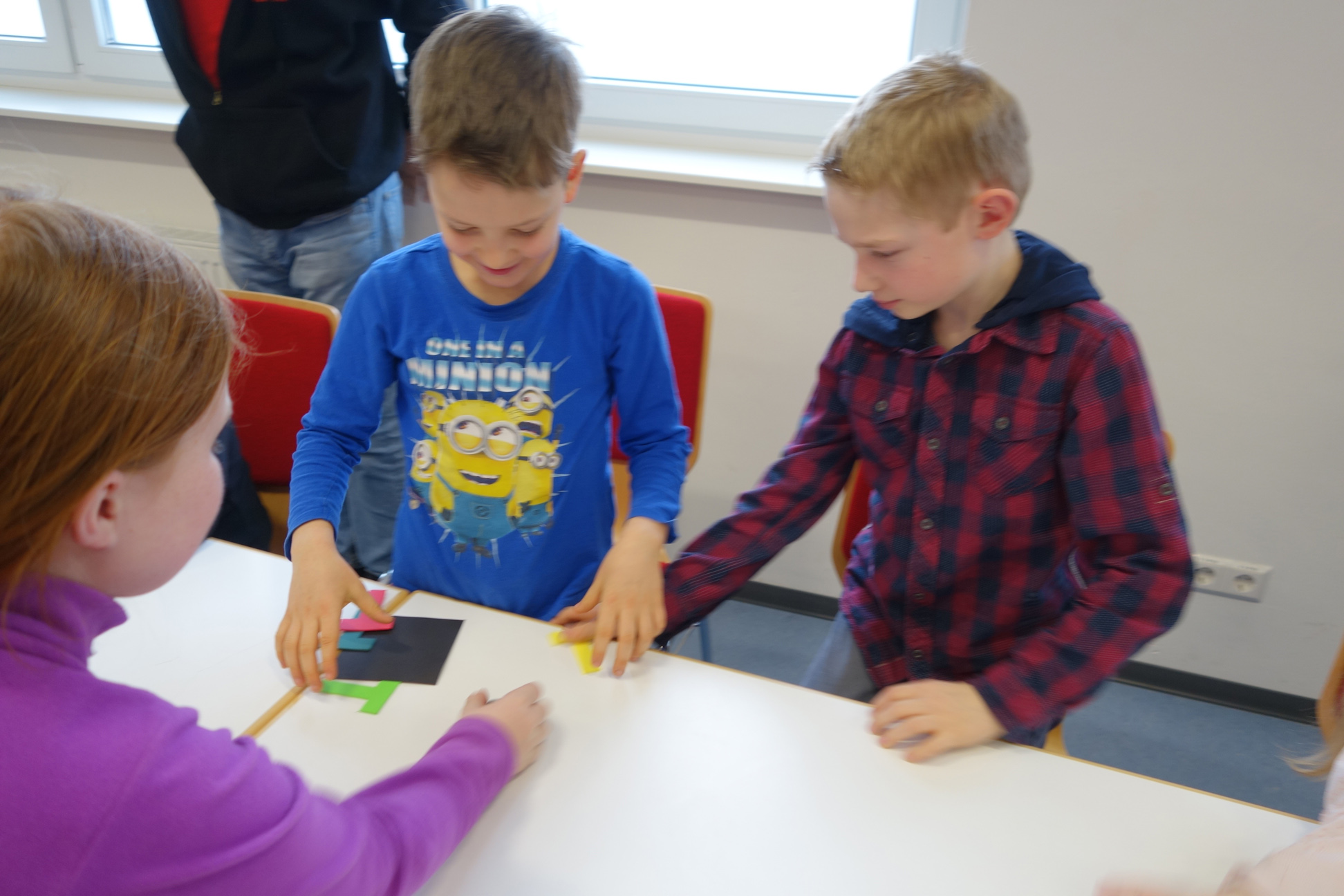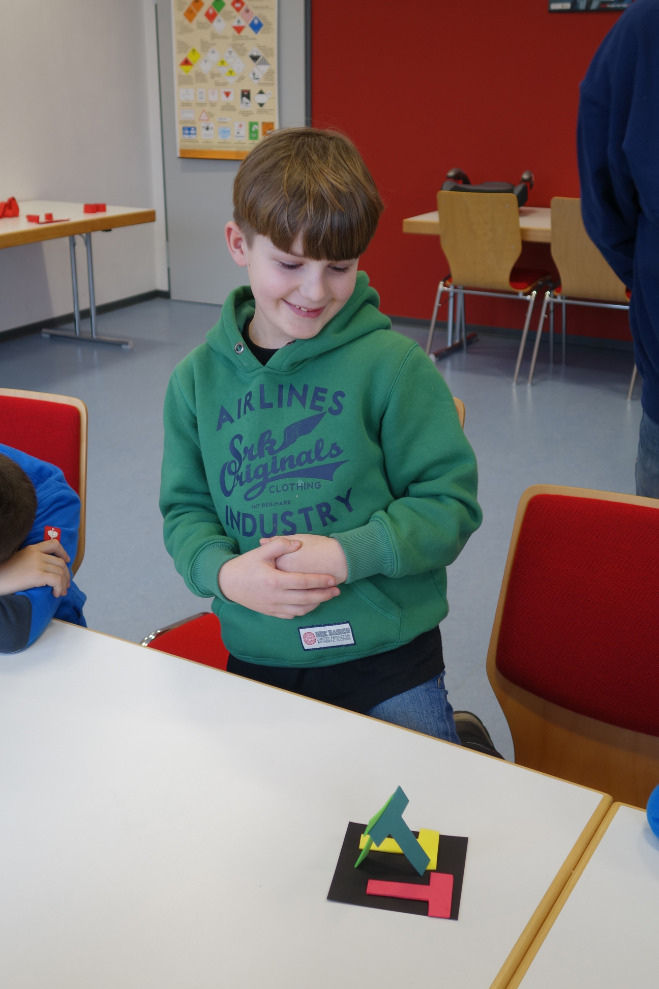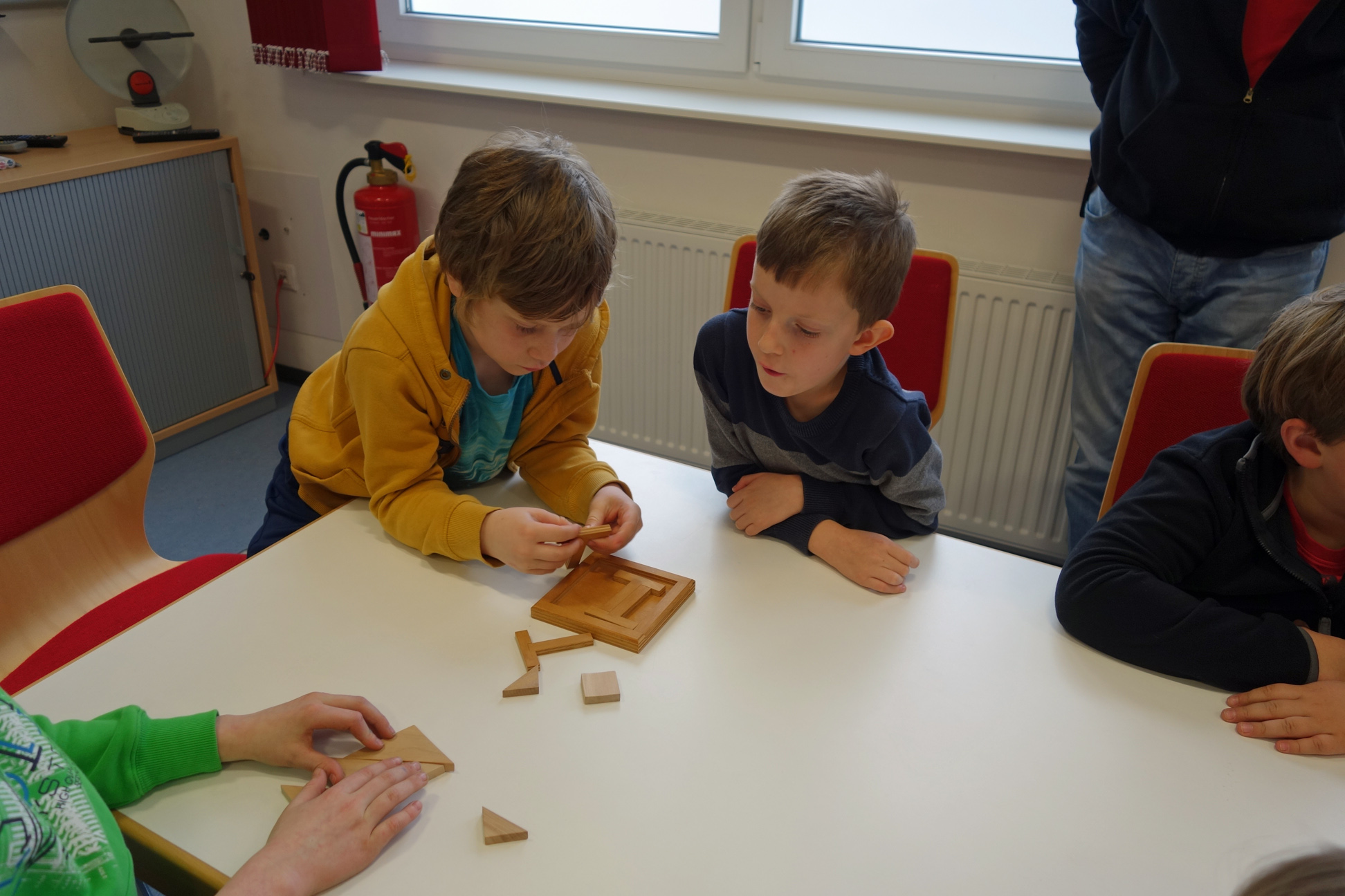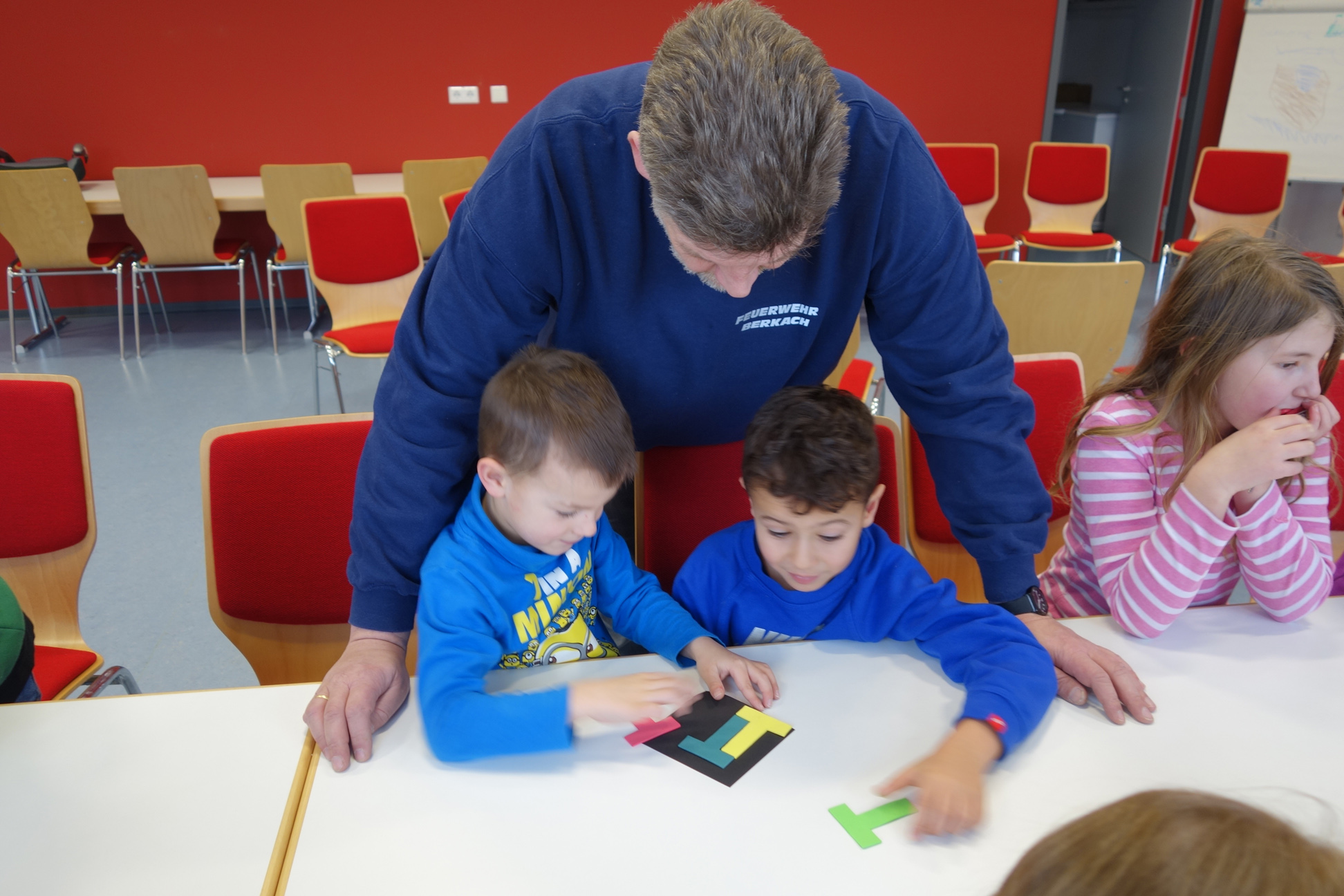 Der Feuerlöscher wäre gleich griffbereit gewesen, falls die Köpfe zu arg geraucht hätten. Aber die Kinder lösten alle Aufgaben dann doch ohne Feueralarm. So wurden Elemente in Kästchen eingepasst, lange Bänder geteilt und Holzteile fast mit Zauberkraft bewegt. Am Schluss waren alle Geheimnisse gelüftet, die Kinder mit Papier bunt geschmückt, und Simone konnte sogar noch zwei Herzen zum Abschluss zaubern.