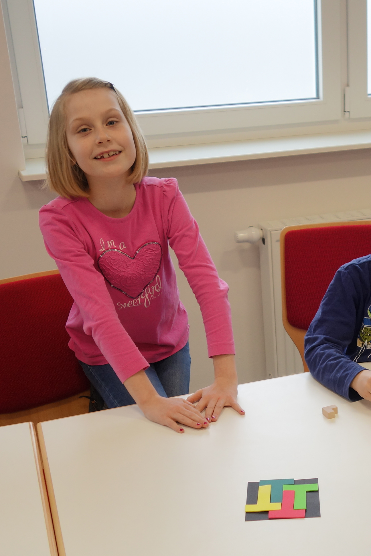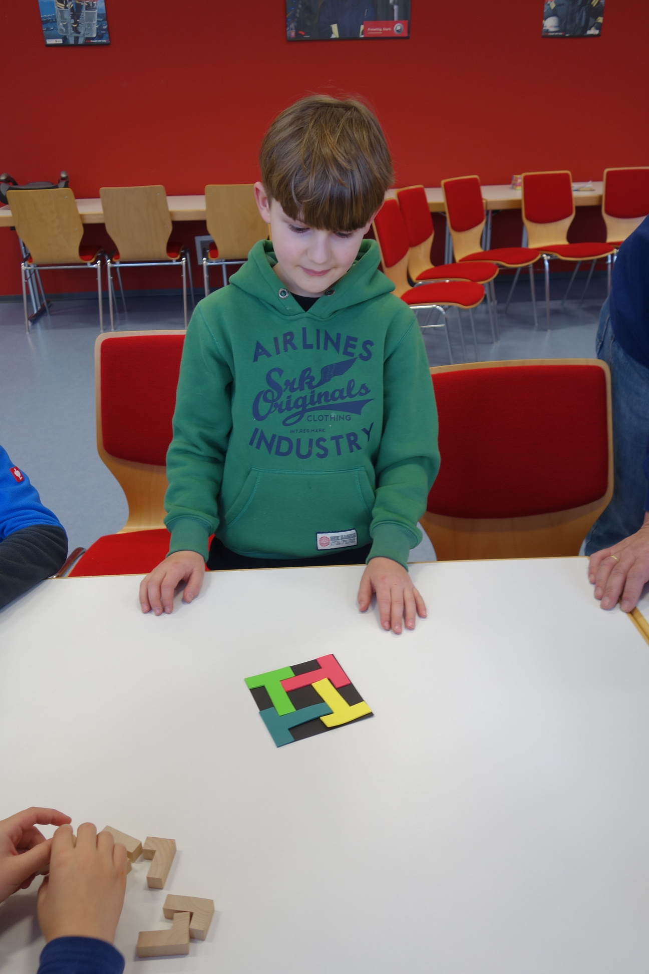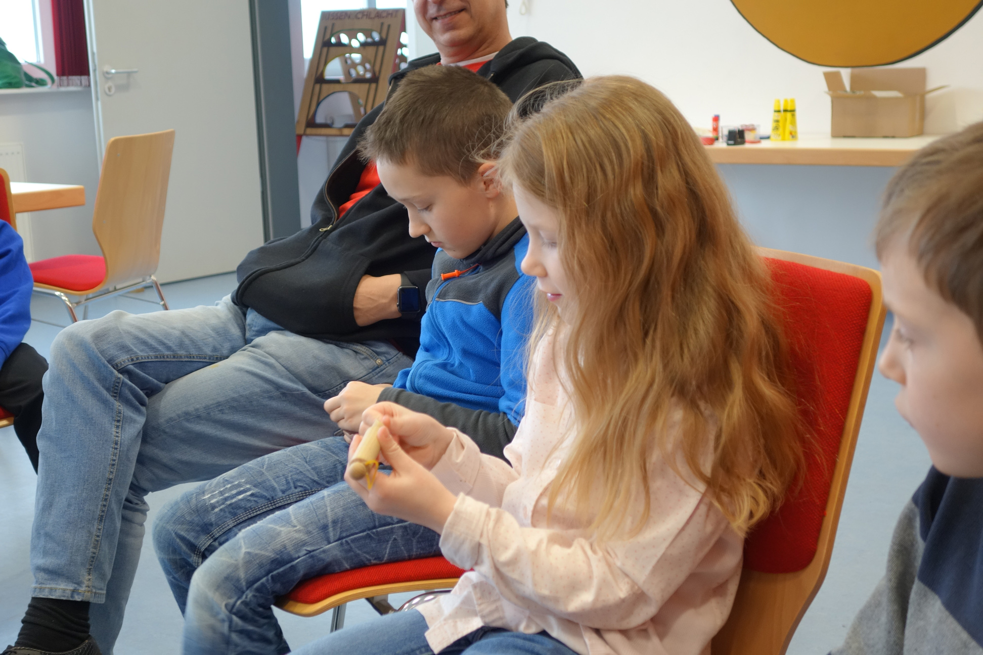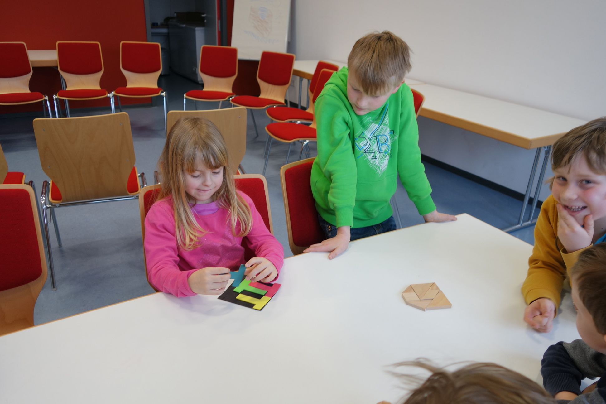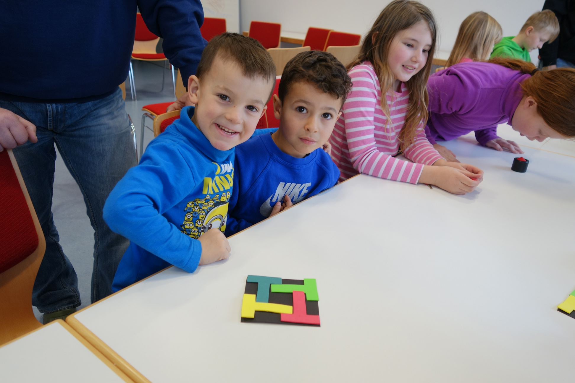 Der Feuerlöscher wäre gleich griffbereit gewesen, falls die Köpfe zu arg geraucht hätten. Aber die Kinder lösten alle Aufgaben dann doch ohne Feueralarm. So wurden Elemente in Kästchen eingepasst, lange Bänder geteilt und Holzteile fast mit Zauberkraft bewegt. Am Schluss waren alle Geheimnisse gelüftet, die Kinder mit Papier bunt geschmückt, und Simone konnte sogar noch zwei Herzen zum Abschluss zaubern.