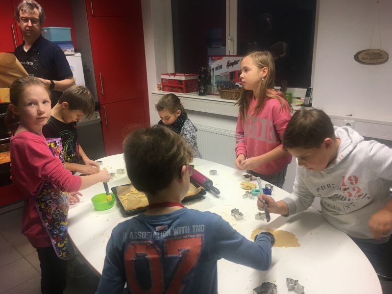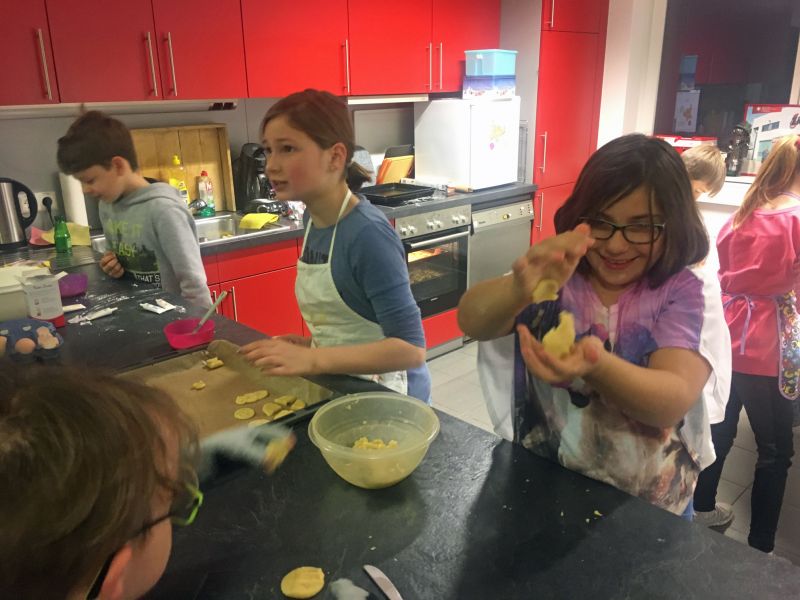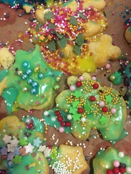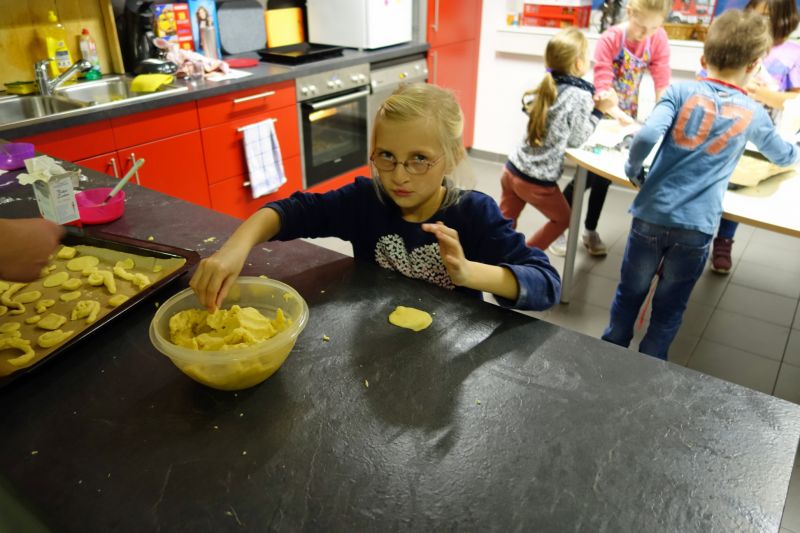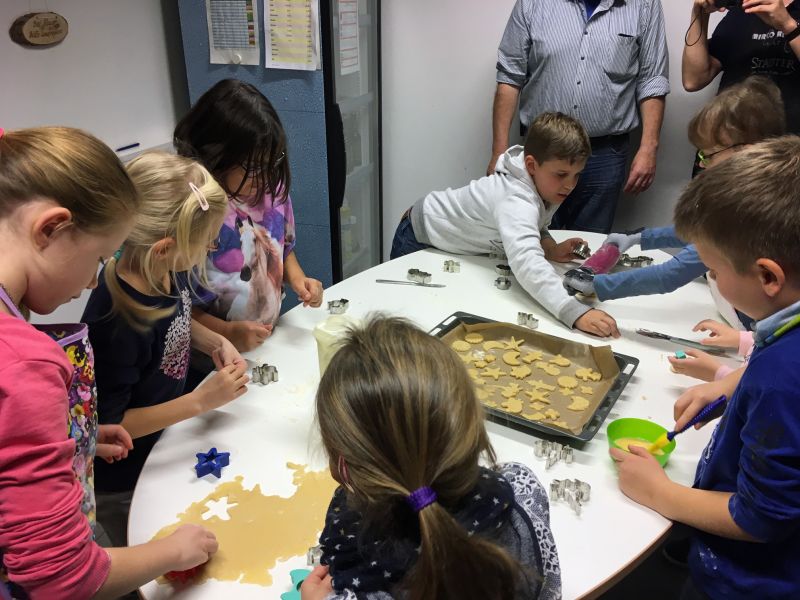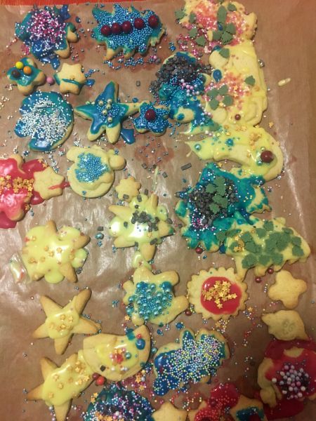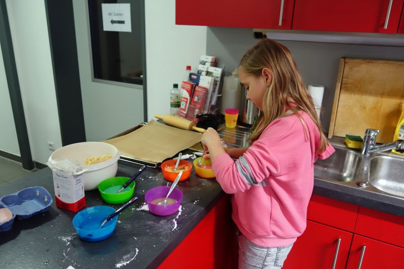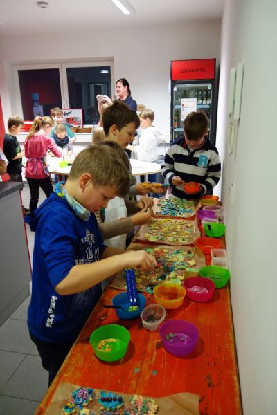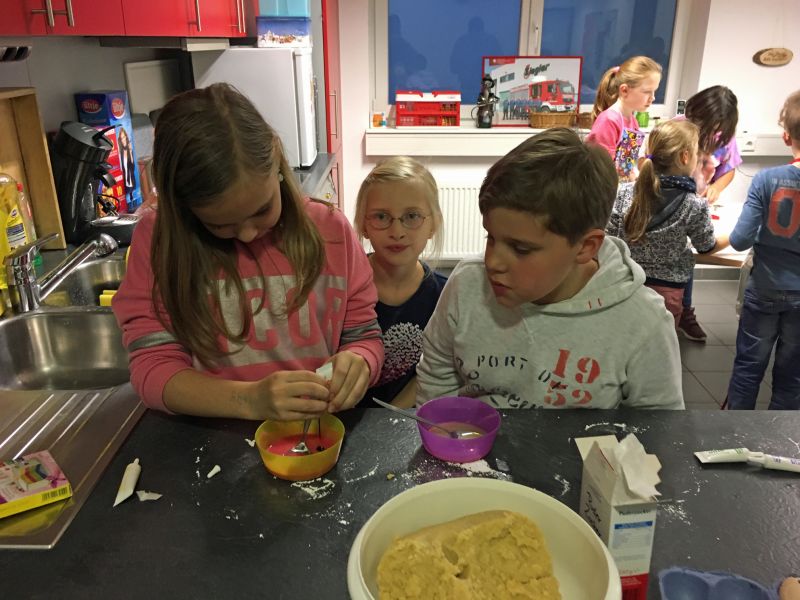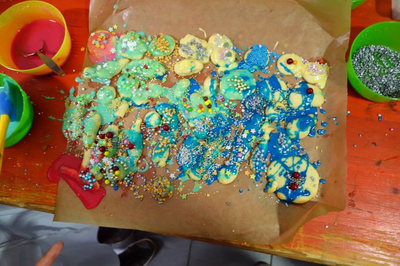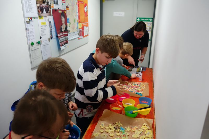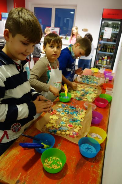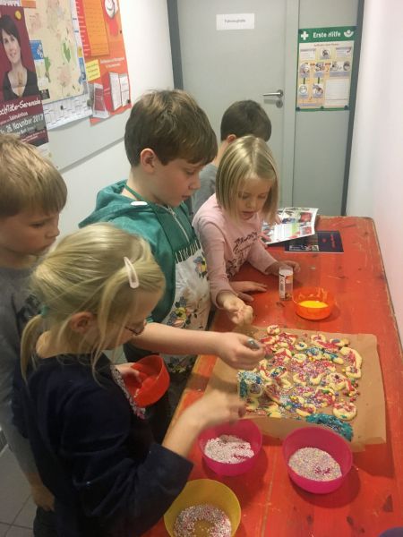 Drei Teigklumpen, achtzehn Kinder, eine mittelgroße Küche und ca. 20 Schüsselchen mit Verziermaterial - konnte das gutgehen? Es ging gut, und die Resultate waren zahlreich, süß, bunt und unter einen dicken Zuckergussschicht vergraben.