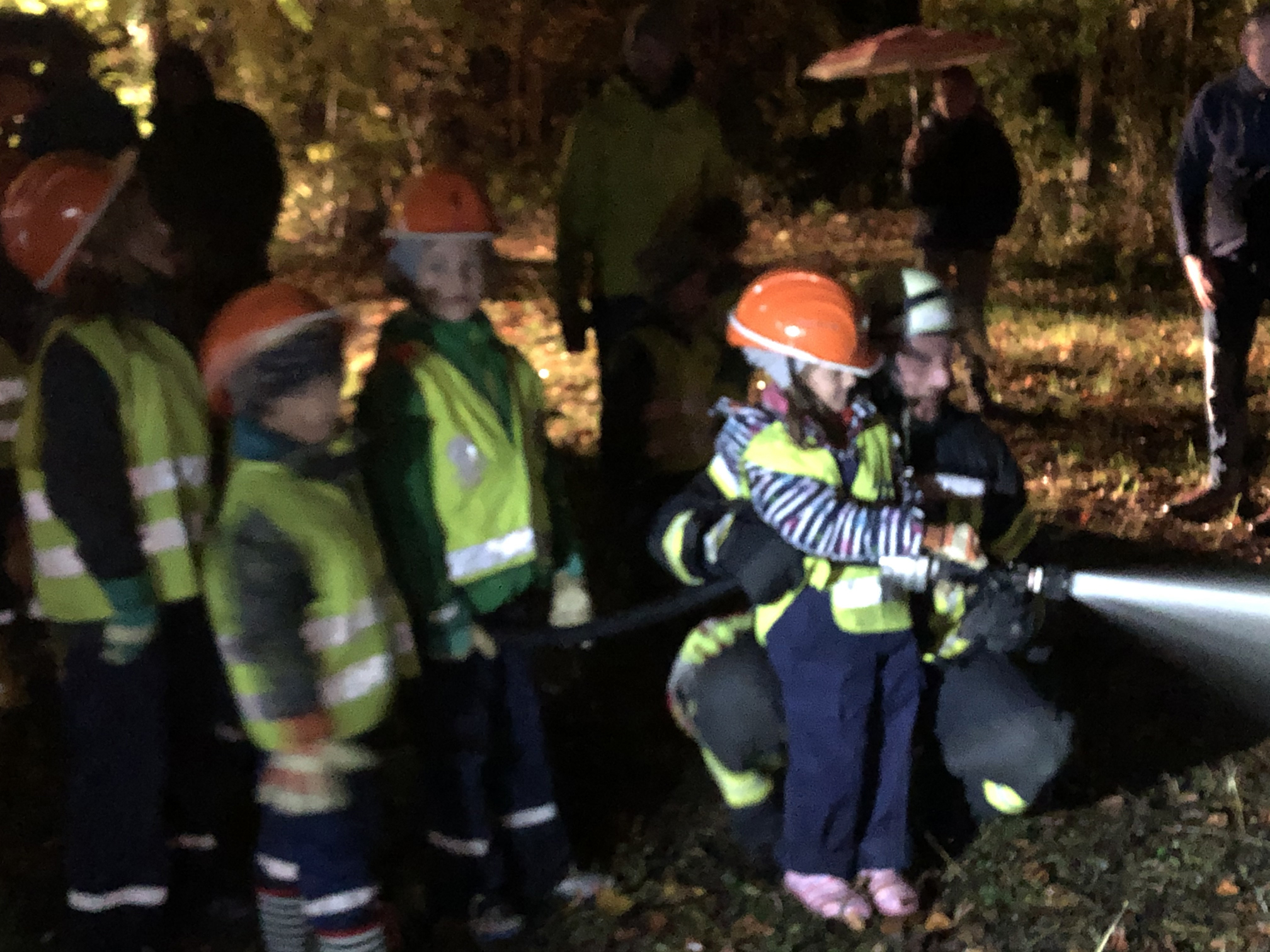 Das mit dem Wetter hat dieses Jahr leider nicht so gut geklappt. Aber echte Feuerwehrleute trotzen jedem Wetter, so dass auch die Feuervögel sich vom Regen nicht davon abhalten ließen, ihr Martinsfeuer am Rodelberg zu entzünden. Eifrig verkauften sie an Eltern, Geschwister und weitere Gäste zunächst Brezeln und Kinderpunsch, bevor sie das Feuer mit dem Feuerwehrschlauch gründlich löschten und fröhlich mit dem Bollerwagen wieder zurück zur Feuerwehr zogen.