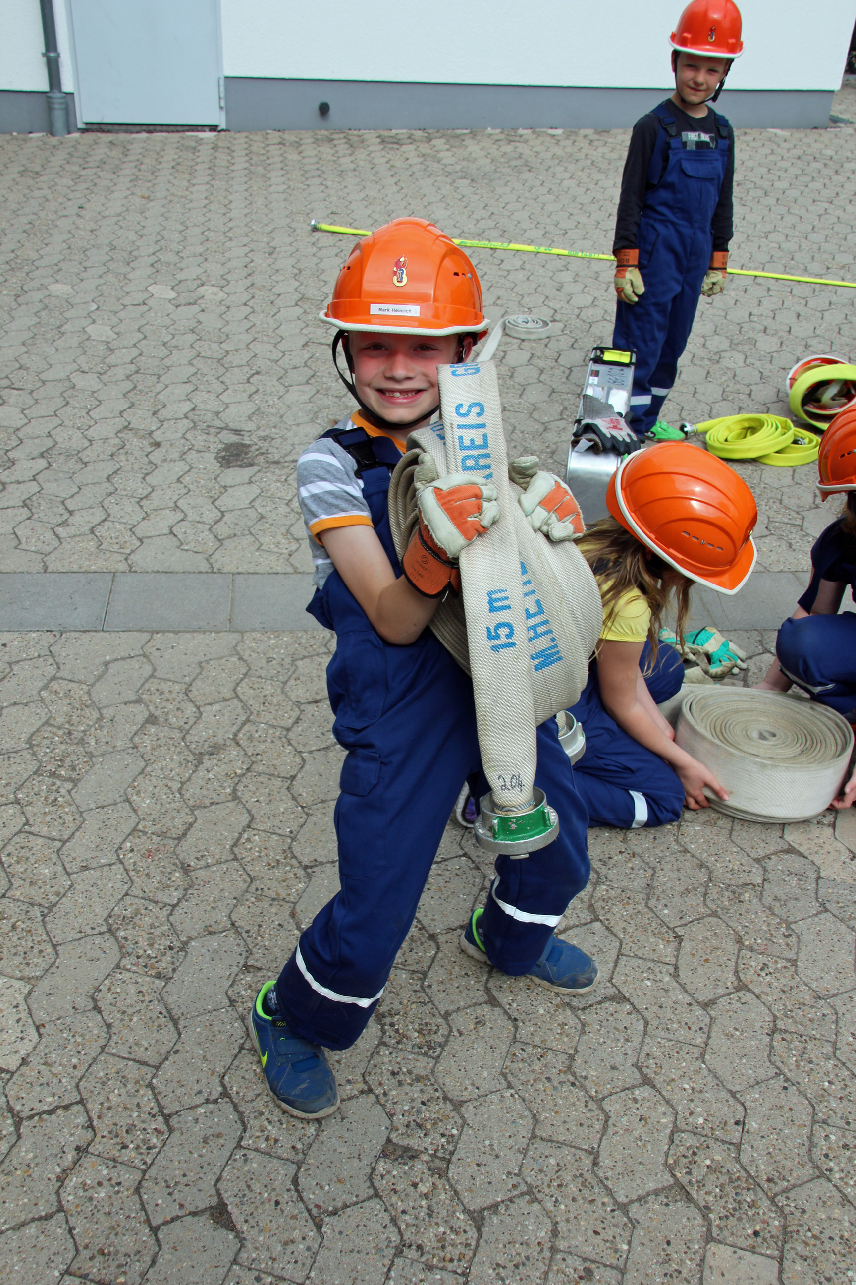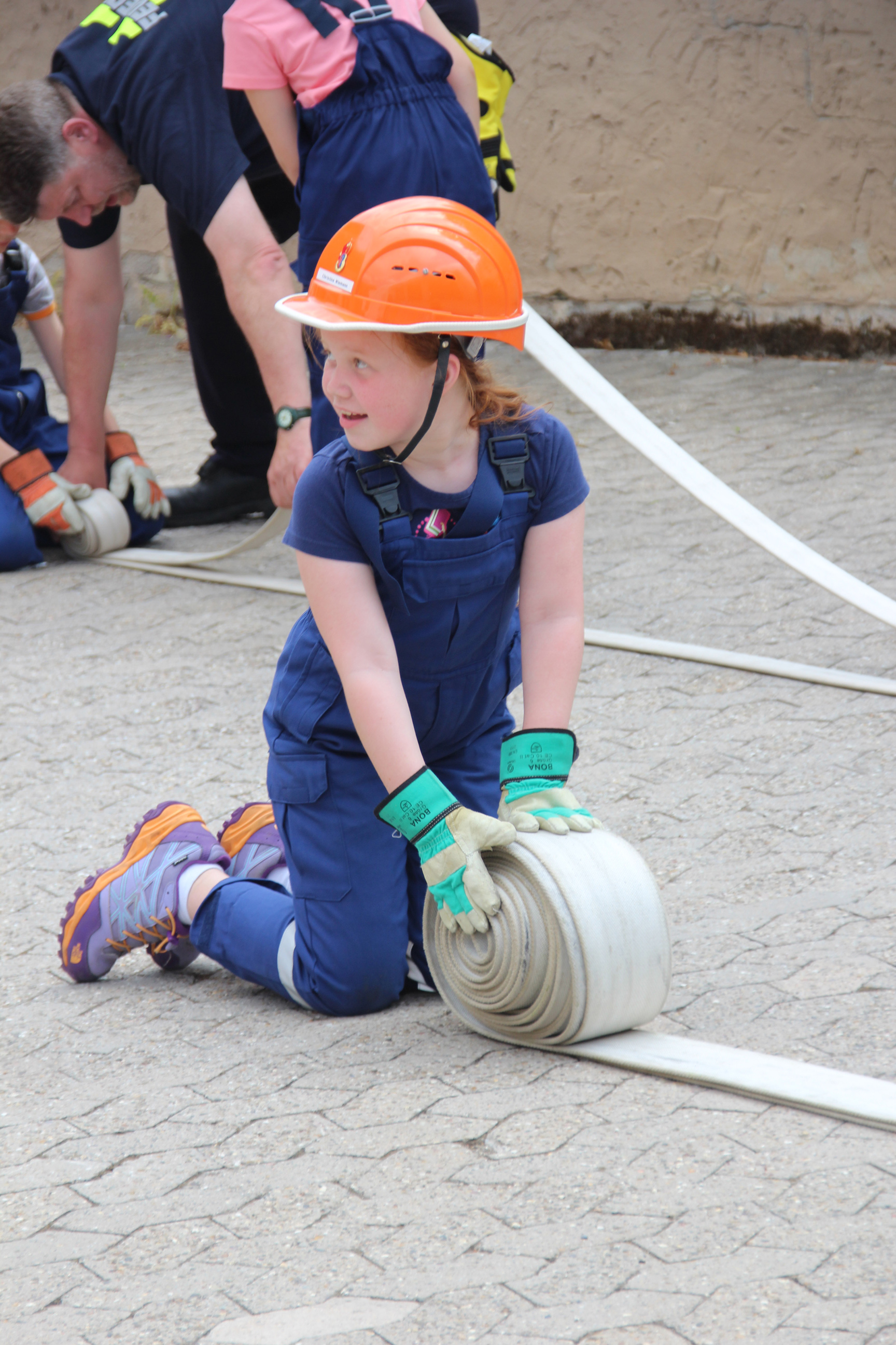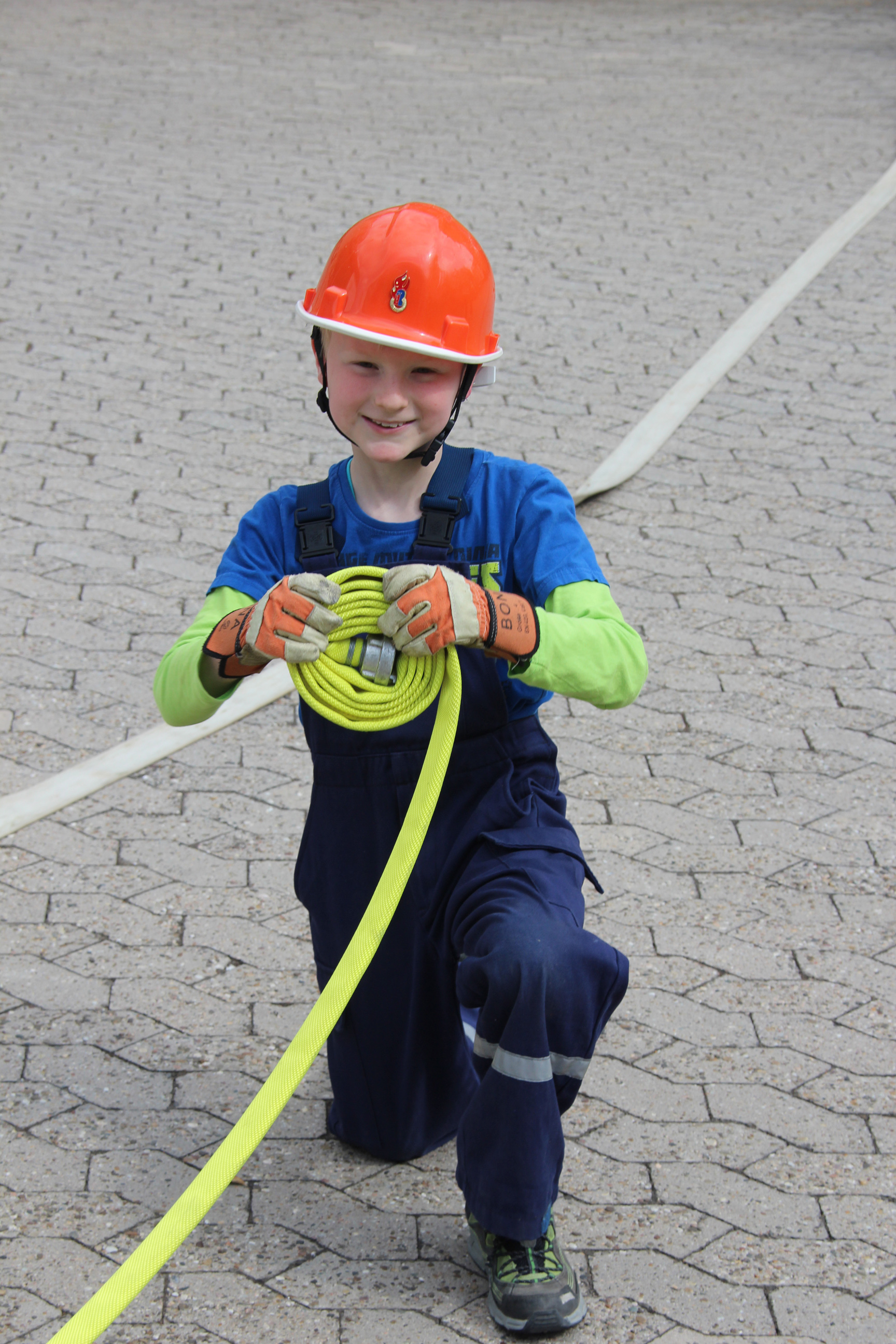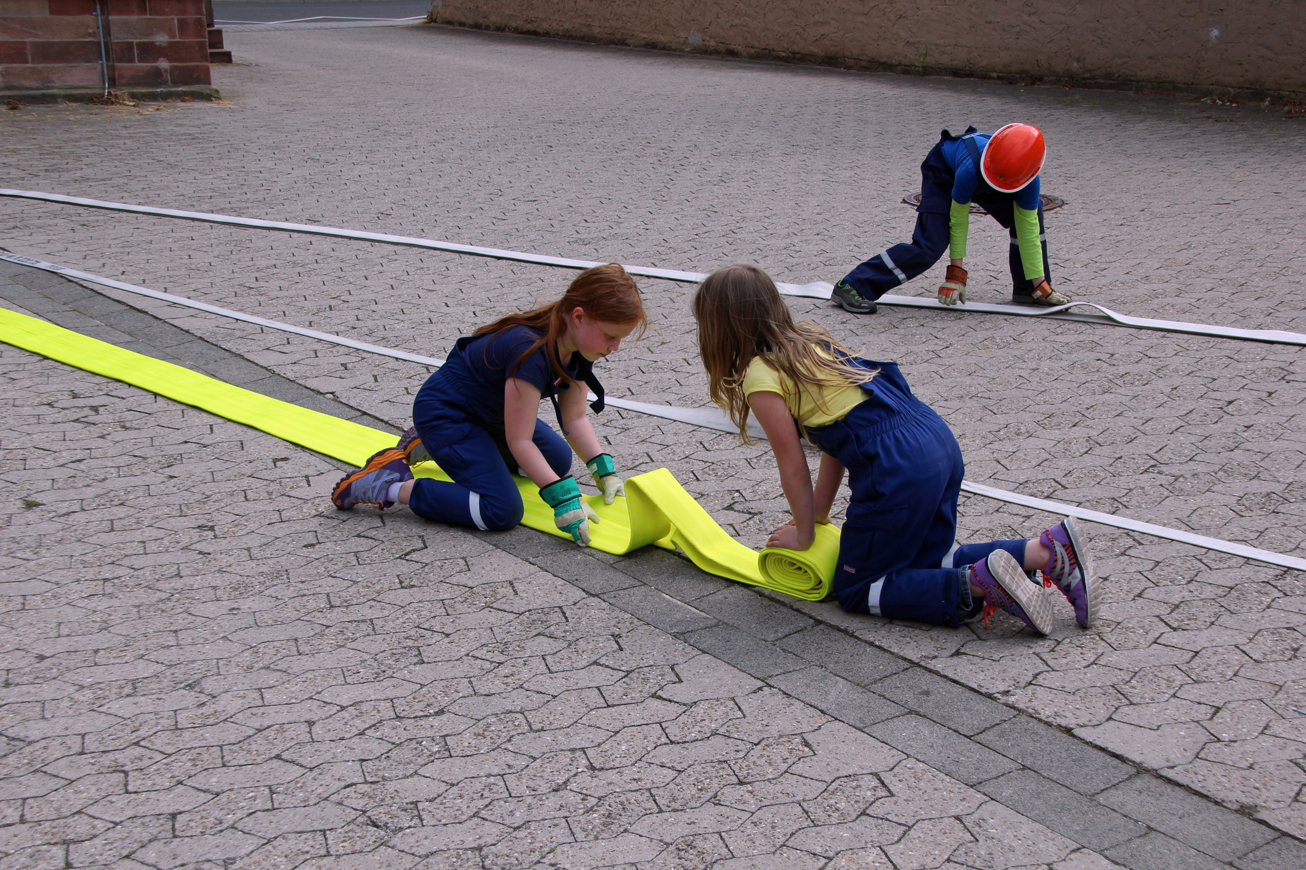 Bei der Feuerwehr müssen Schläuche hurtig ausgerollt und ausgeworfen werden, damit ein Feuer schnell gelöscht werden kann. Aber wie rollt man die hinterher eigentlich alle wieder auf? Das probierten die Feuervögel mit dicken, dünnen, langen und kurzen Schläuchen aus.