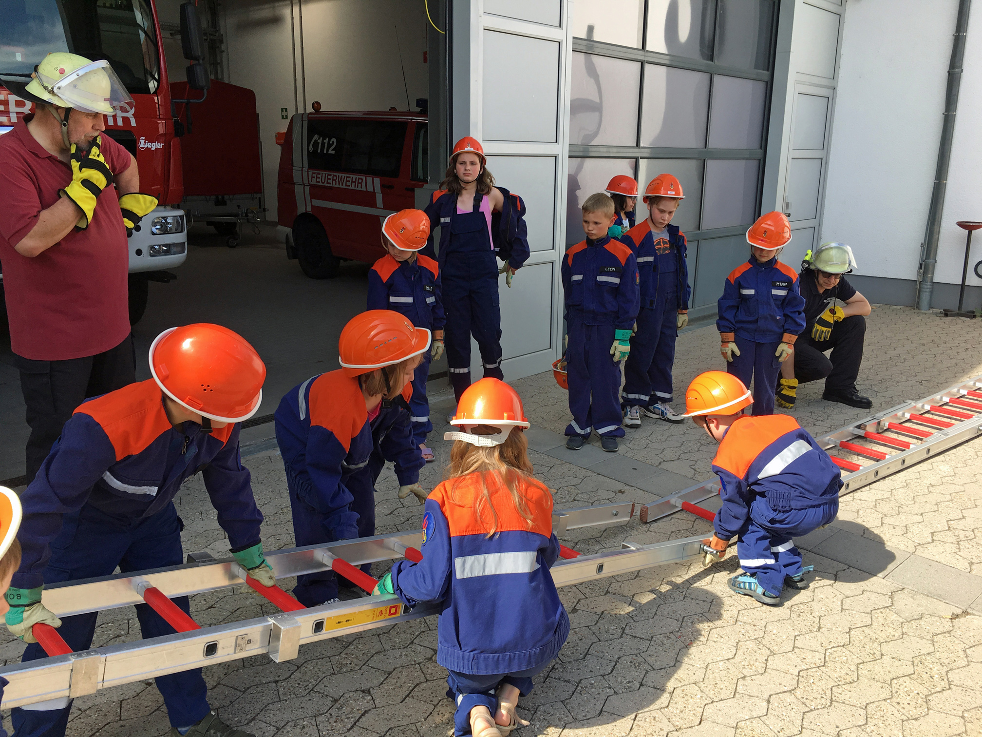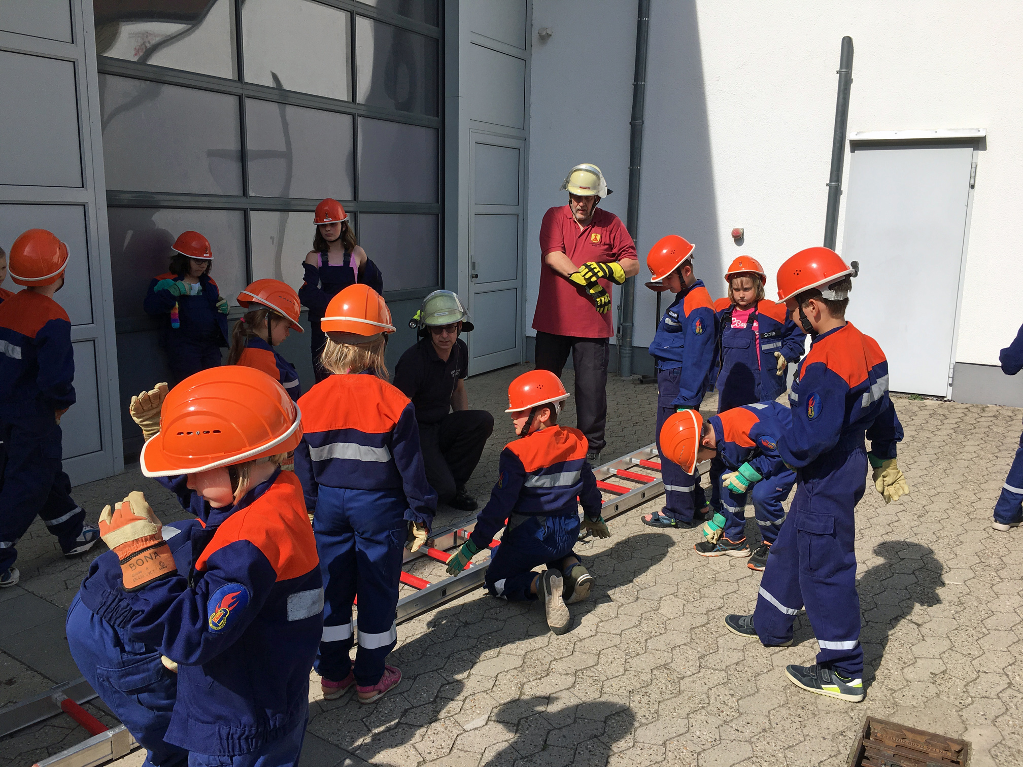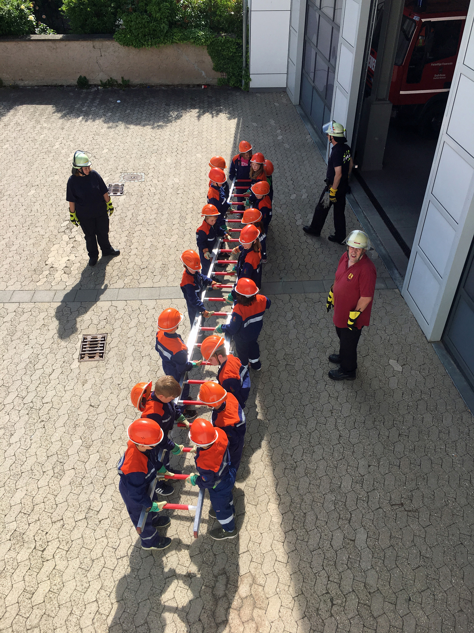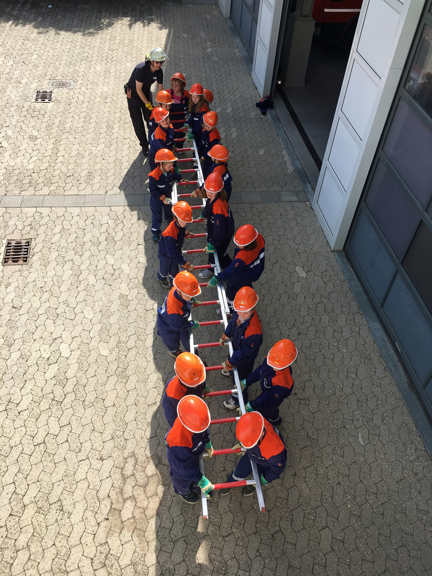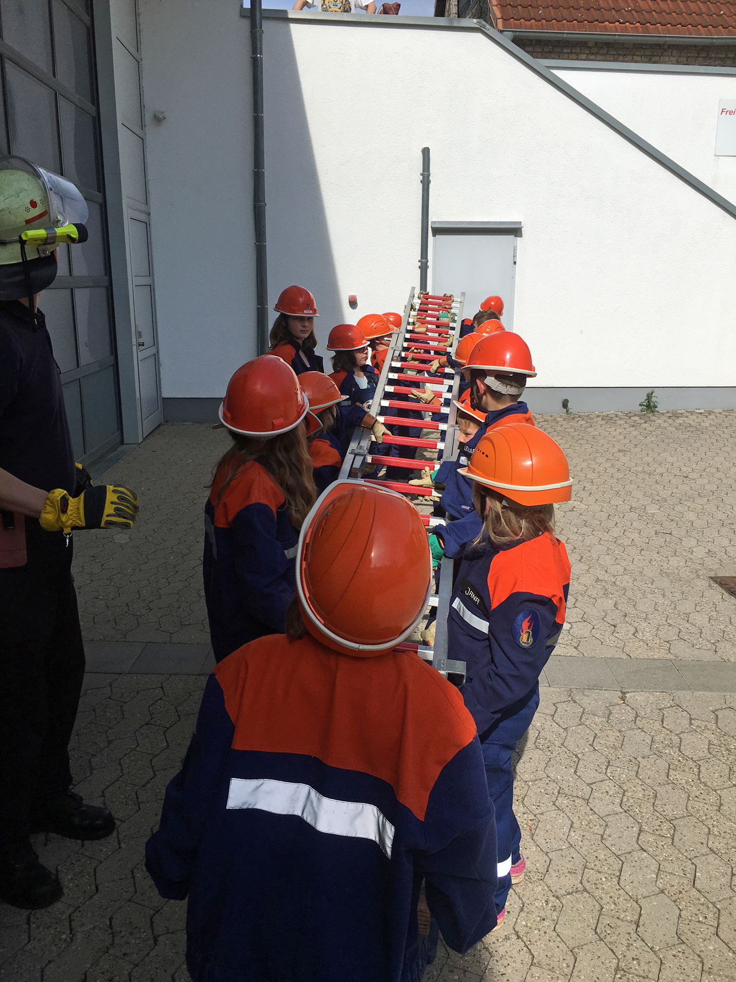 Nachdem die Feuervögel über die verschiedenen Leiterarten gesprochen hatten, steckten sie selbst einige Steckleiterteile zusammen und bauten daraus eine lange Feuerwehrleiter.