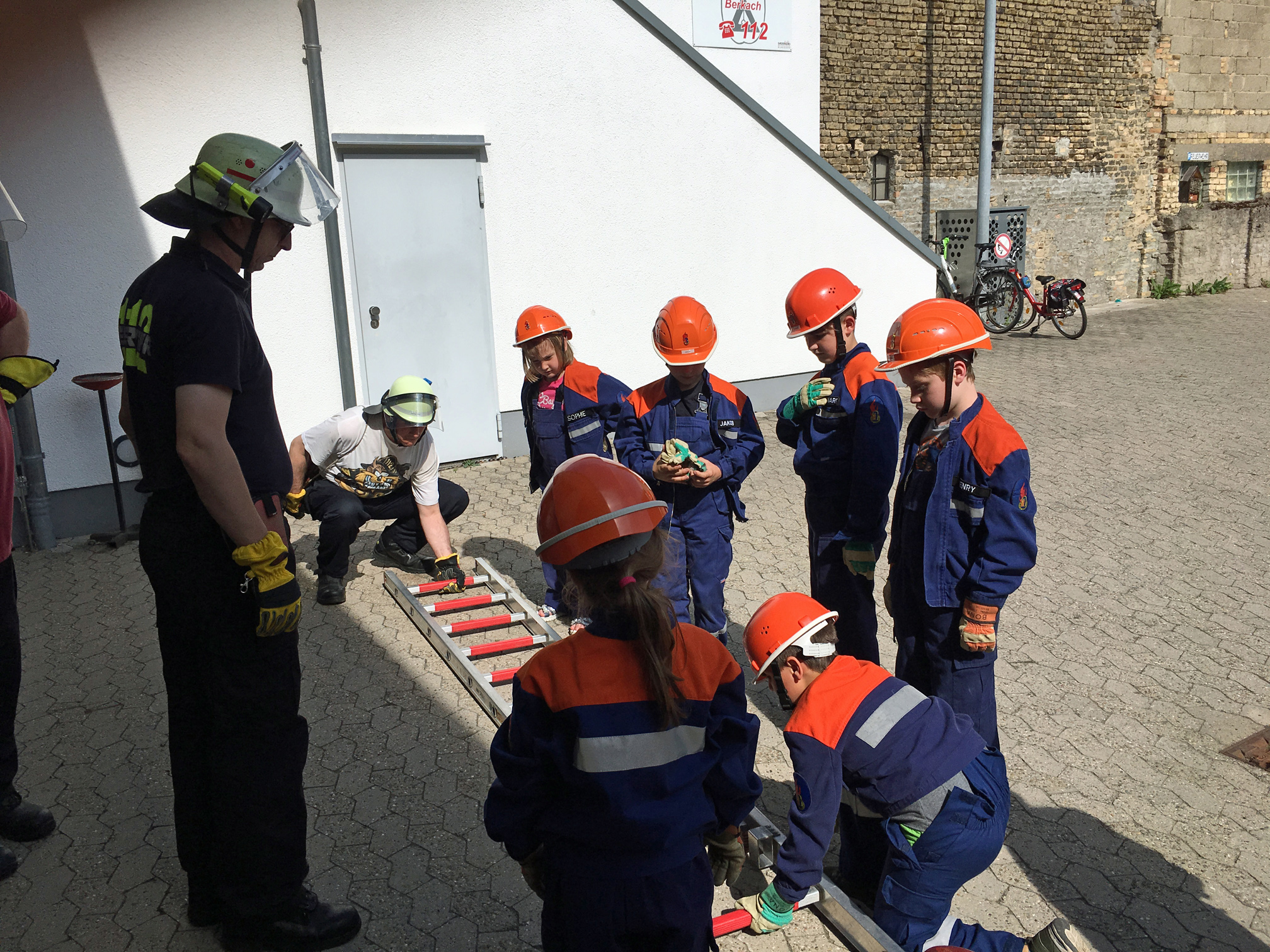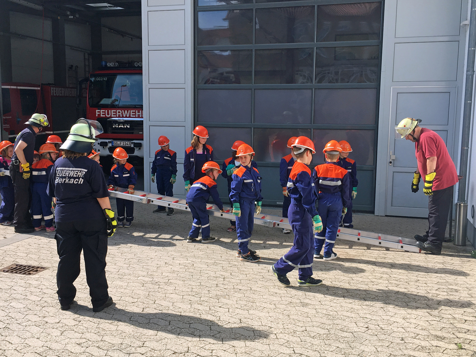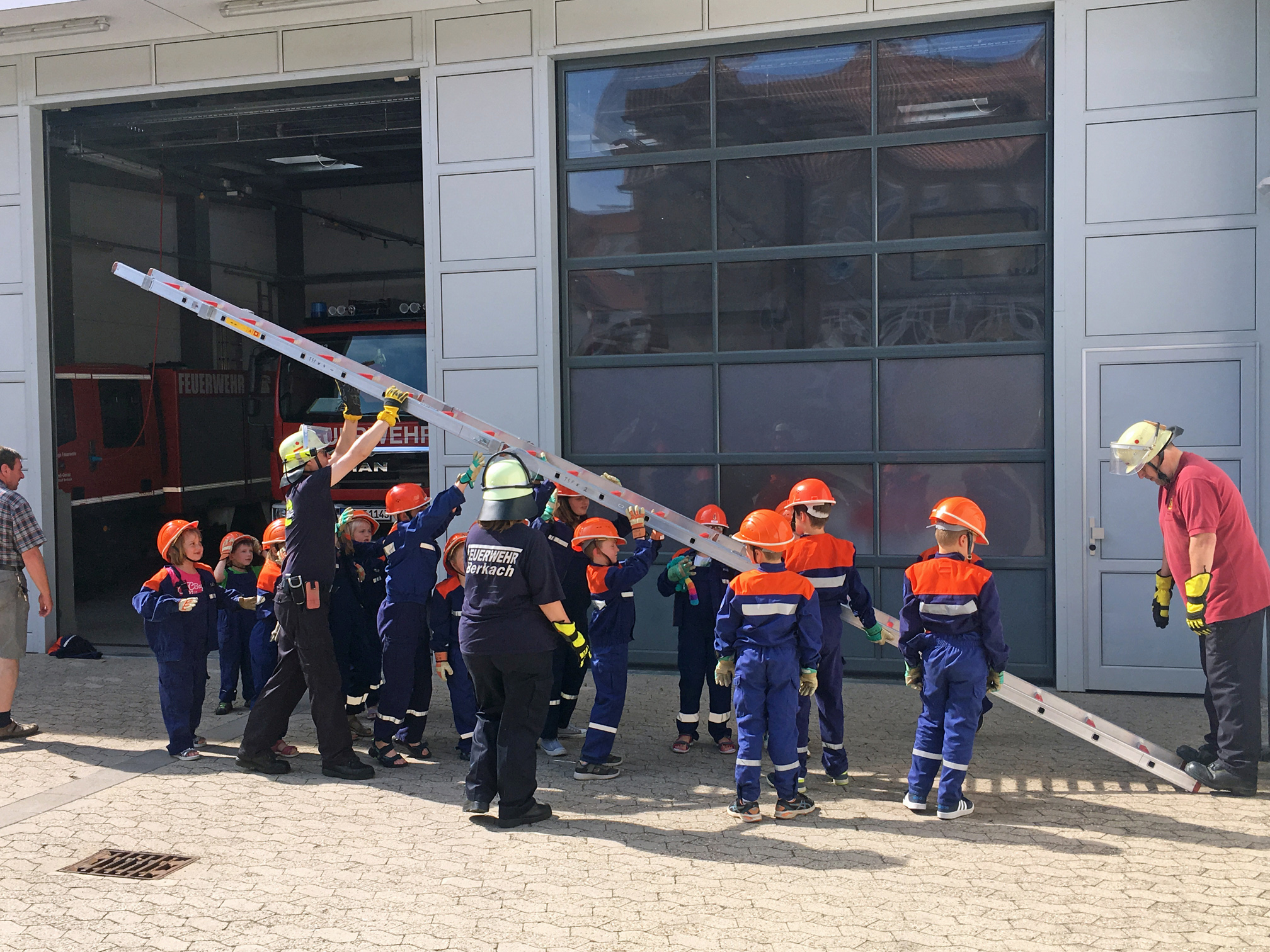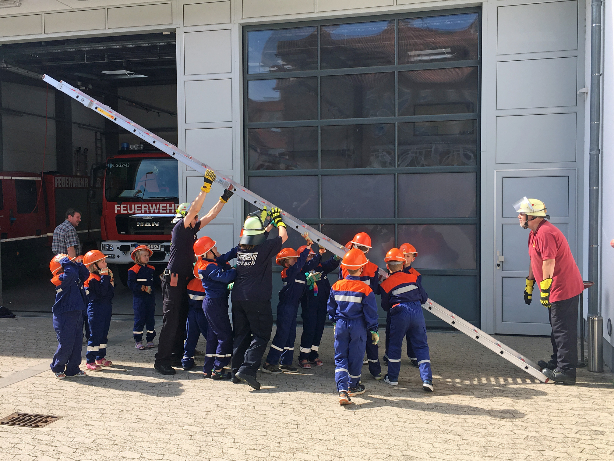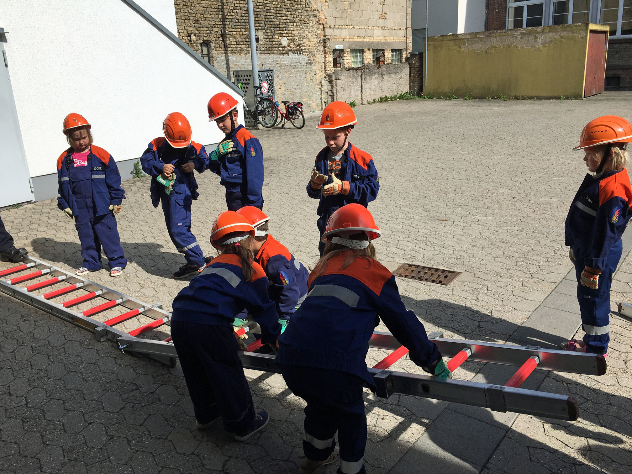 Nachdem die Feuervögel über die verschiedenen Leiterarten gesprochen hatten, steckten sie selbst einige Steckleiterteile zusammen und bauten daraus eine lange Feuerwehrleiter.