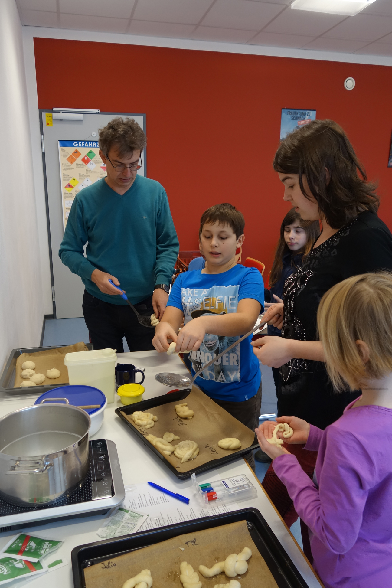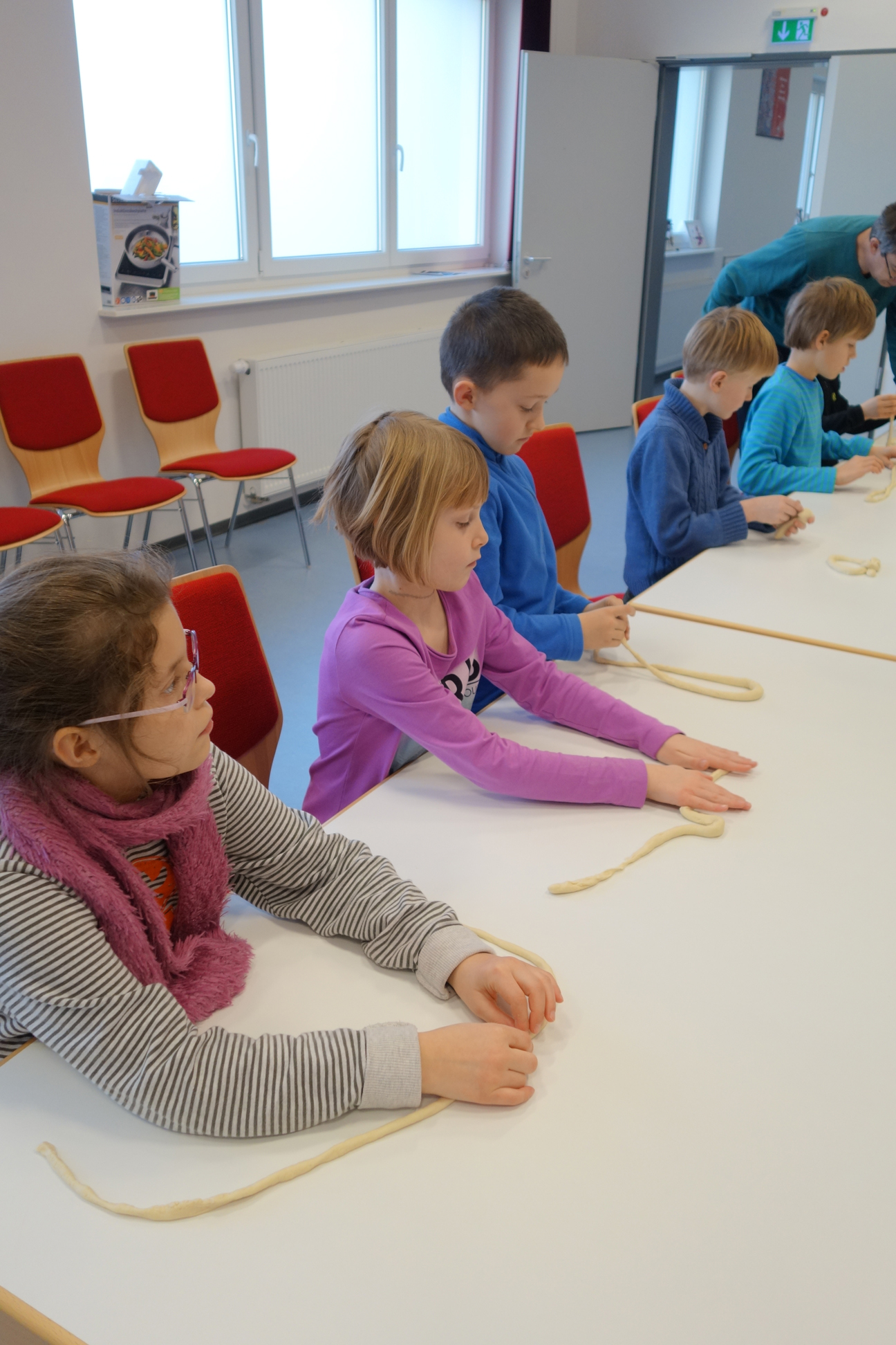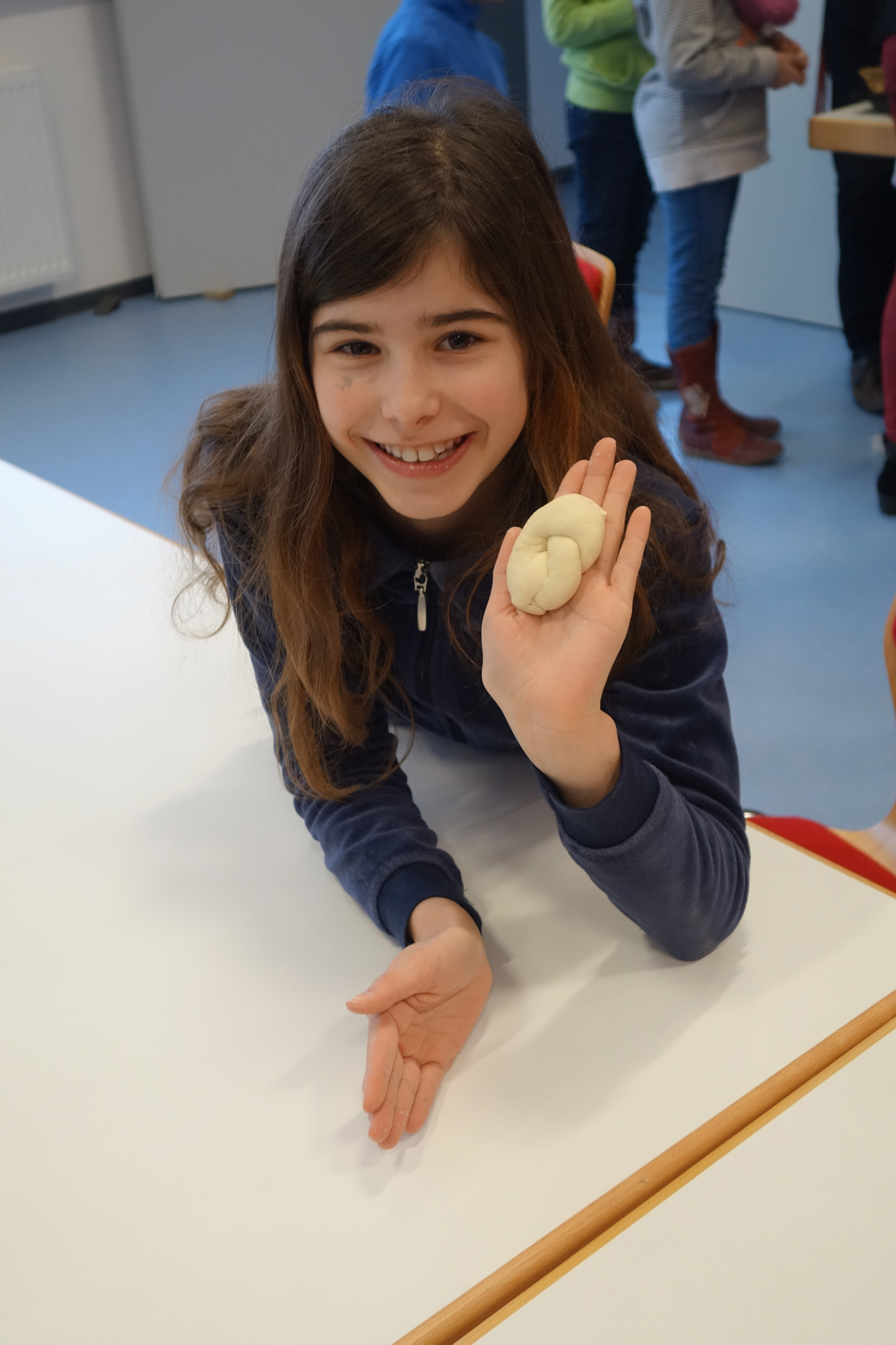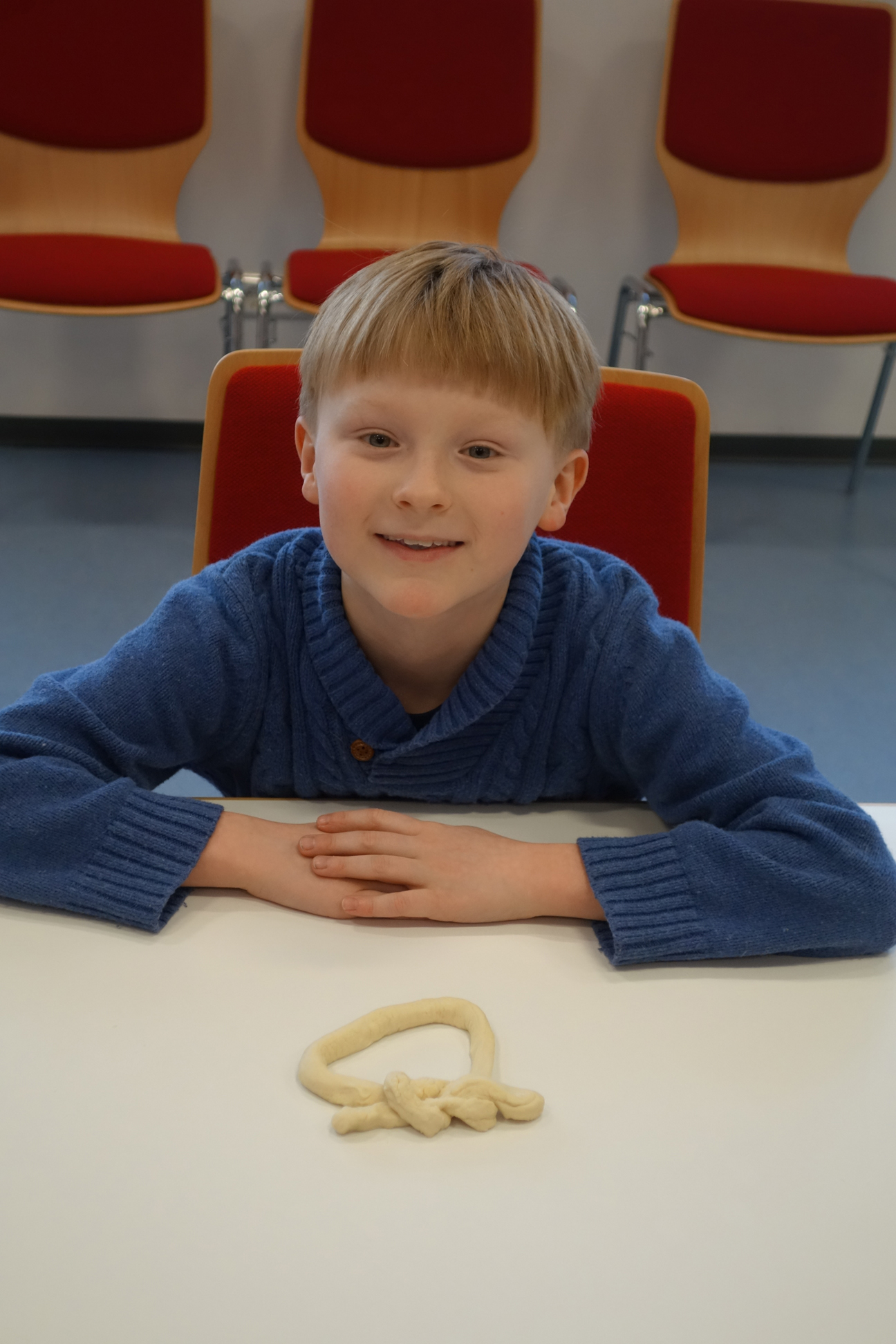Es macht Spaß, Knoten zu üben. Aber es macht noch mehr Spaß, die Knoten hinterher zu essen. Daher legten und stachen wir aus Hefeteig Achterknoten, doppelte Ankerstiche und Kreuzknoten, die hinterher in Lauge getunkt und gebacken wurden. Nicht alle Ergebnisse waren offizielle Feuerwehrknoten, aber sehen lassen konnten sich alle Backwerke.
