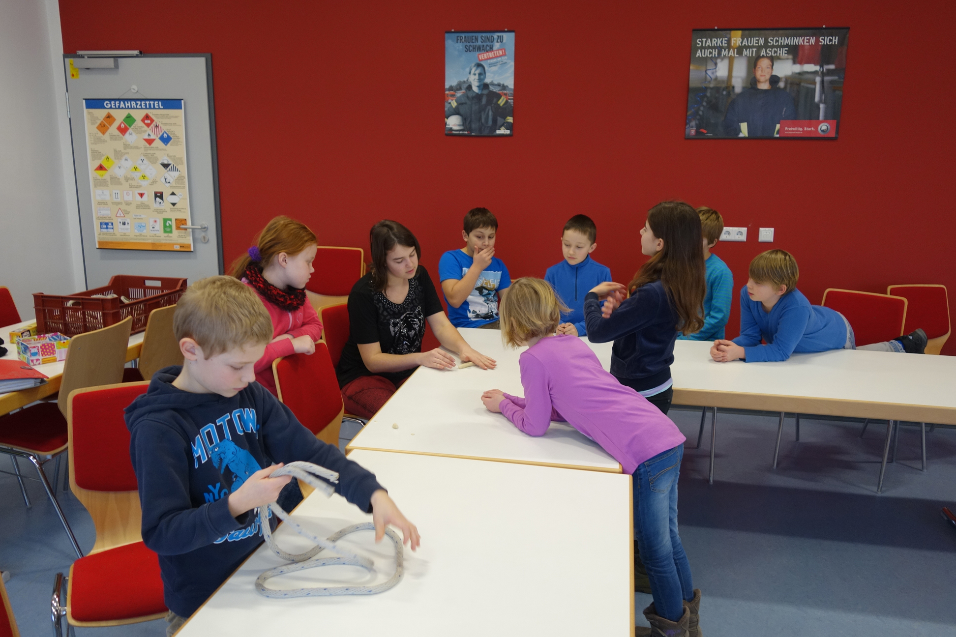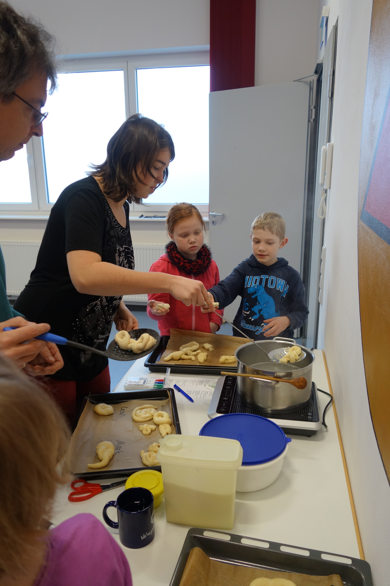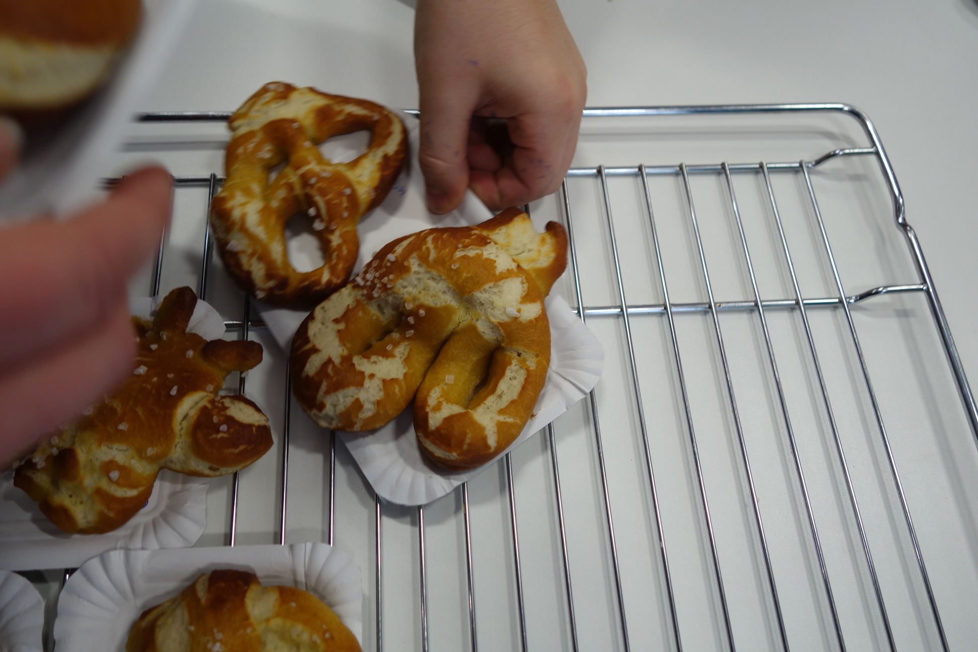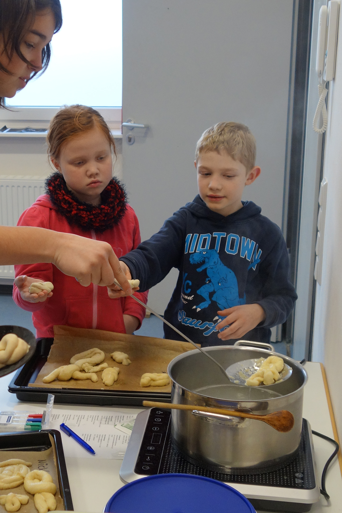 Es macht Spaß, Knoten zu üben. Aber es macht noch mehr Spaß, die Knoten hinterher zu essen. Daher legten und stachen wir aus Hefeteig Achterknoten, doppelte Ankerstiche und Kreuzknoten, die hinterher in Lauge getunkt und gebacken wurden. Nicht alle Ergebnisse waren offizielle Feuerwehrknoten, aber sehen lassen konnten sich alle Backwerke.