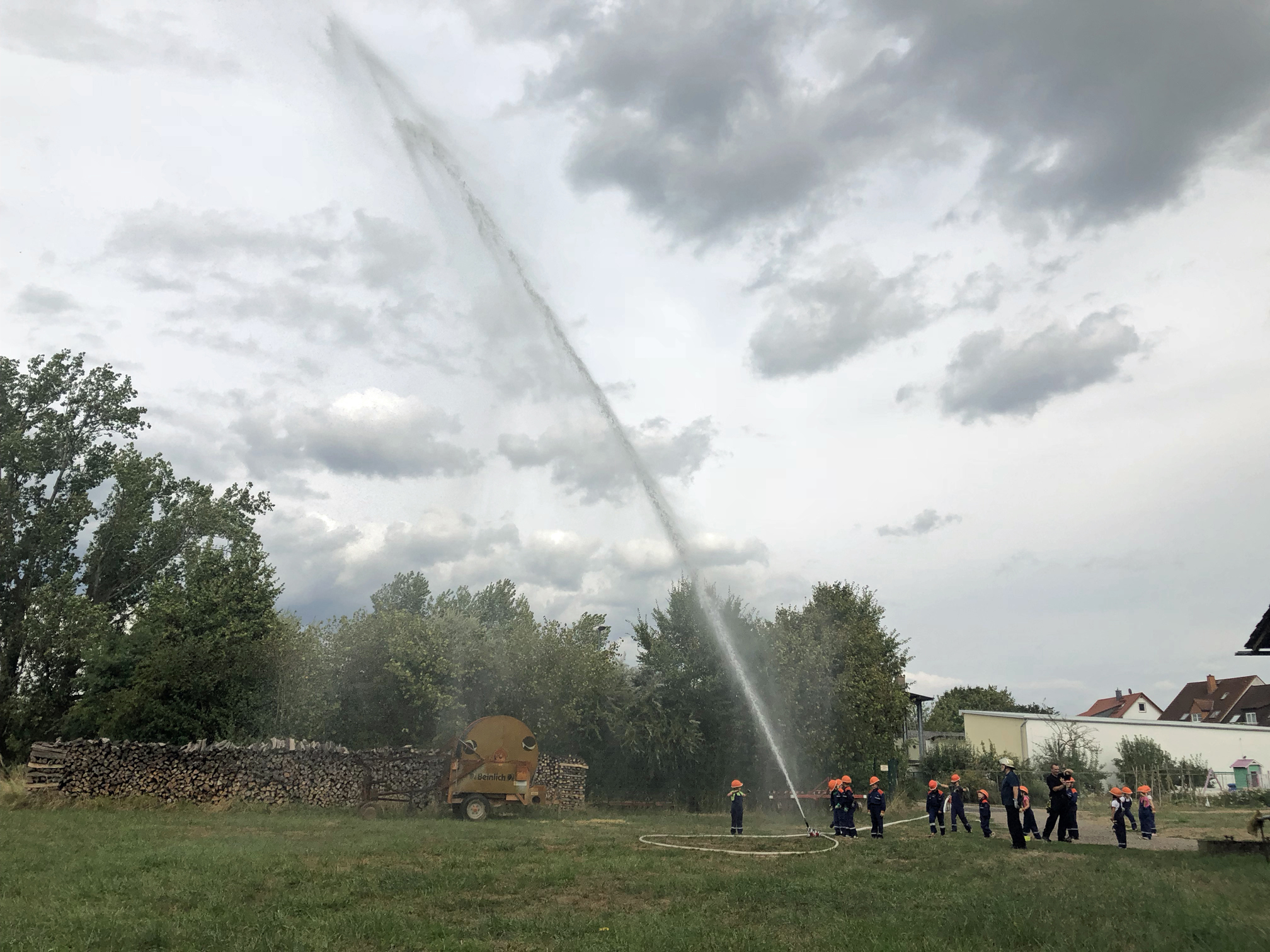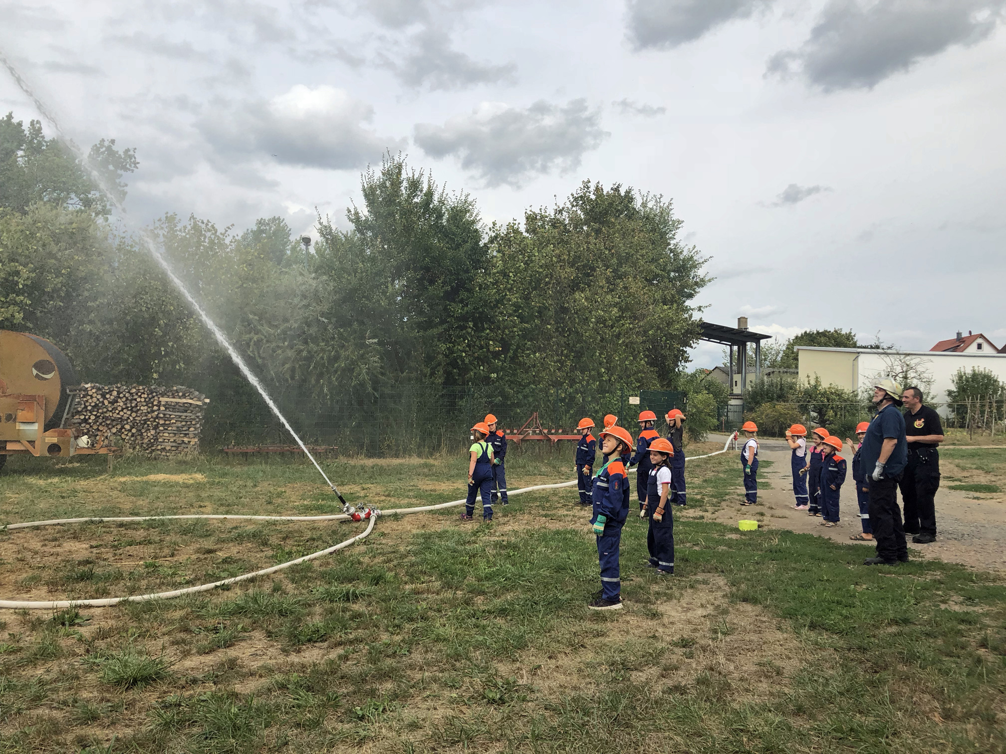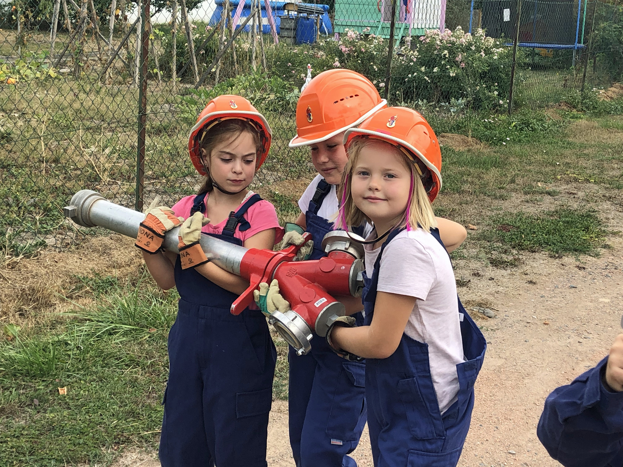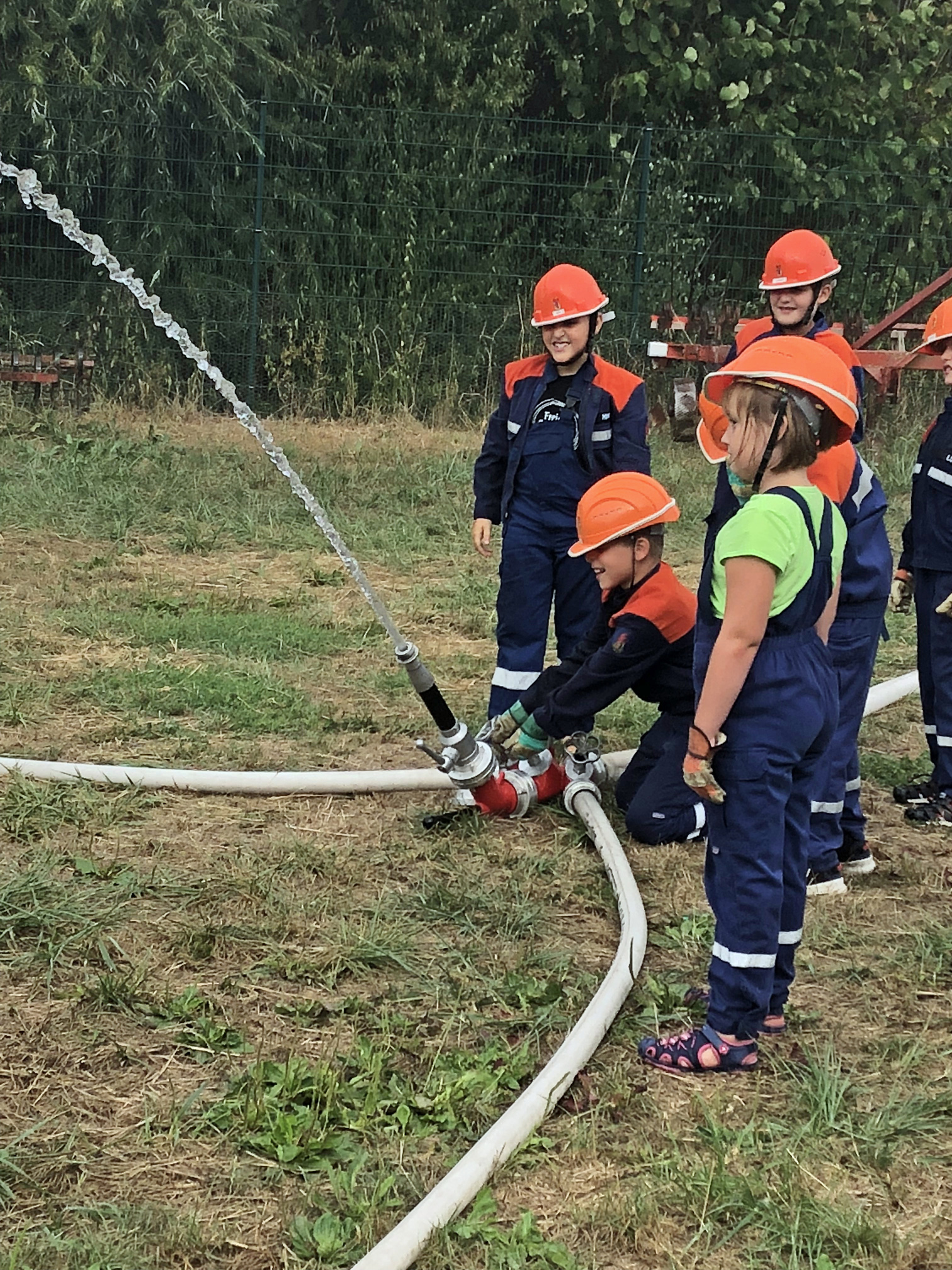 Zum Abschluss des Sommers wollen die Feuervögel noch einmal so richtig kräftig mit Wasser spritzen. Daher zapften sie einen Hydranten an und bauten einen Wasserwerfer. Als der Ruf "Wasser marsch!" ertönte, war der Wasserstrahl tatsächlich sehr beeindruckend und die Wiese freute sich über das zuletzt so seltene Nass von oben.