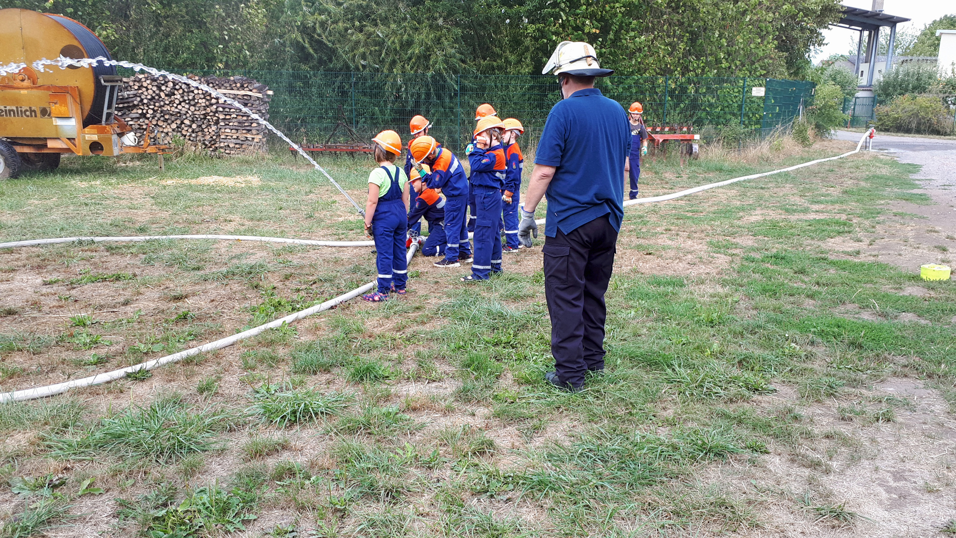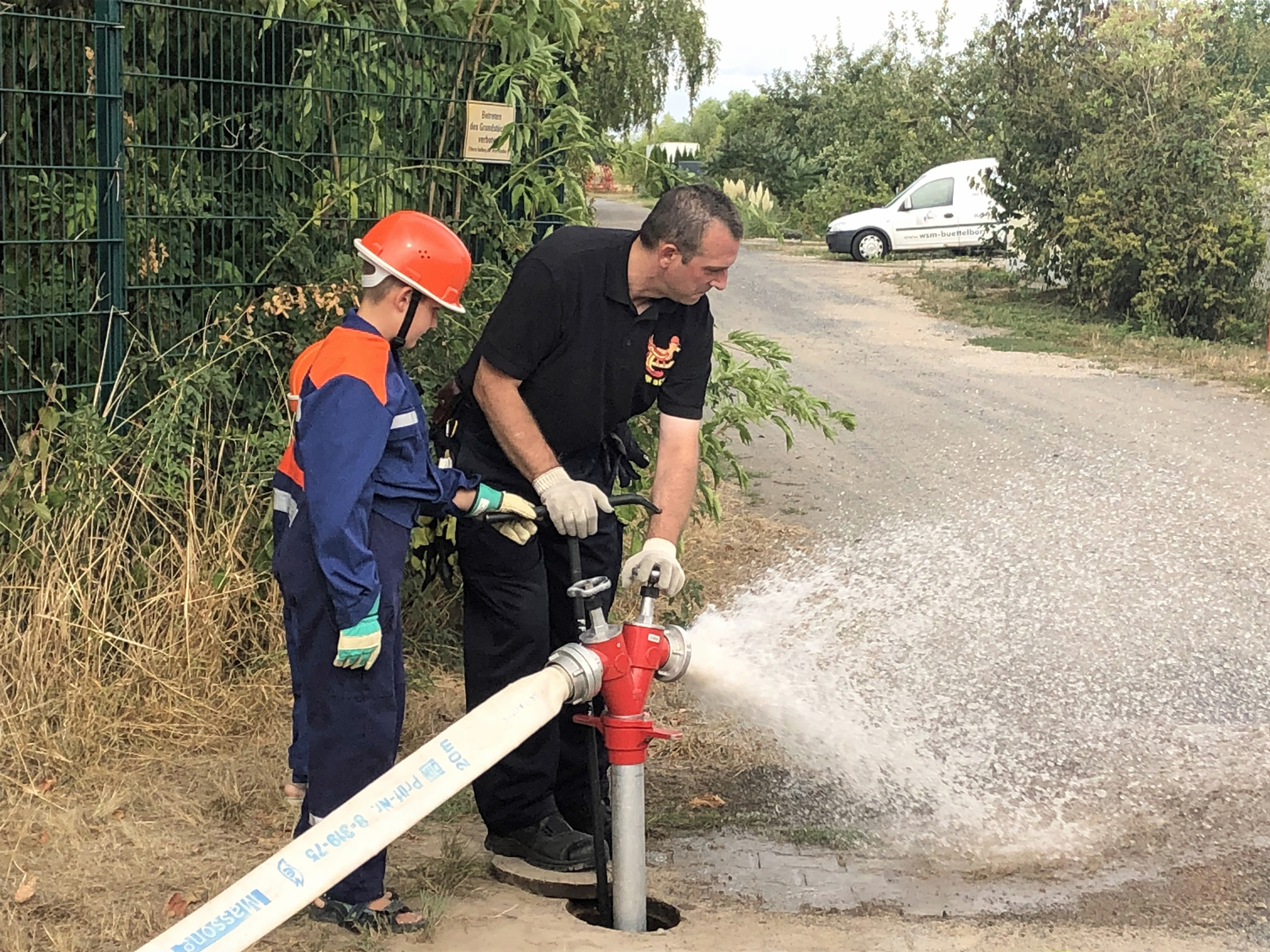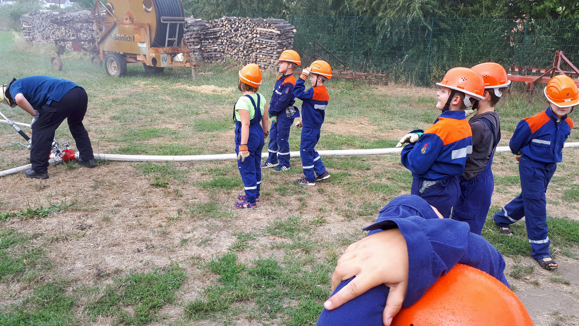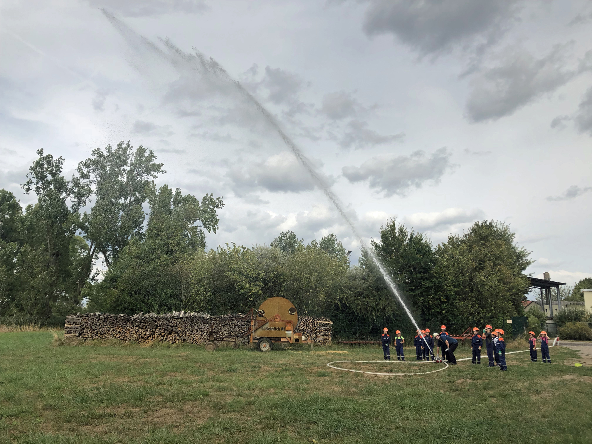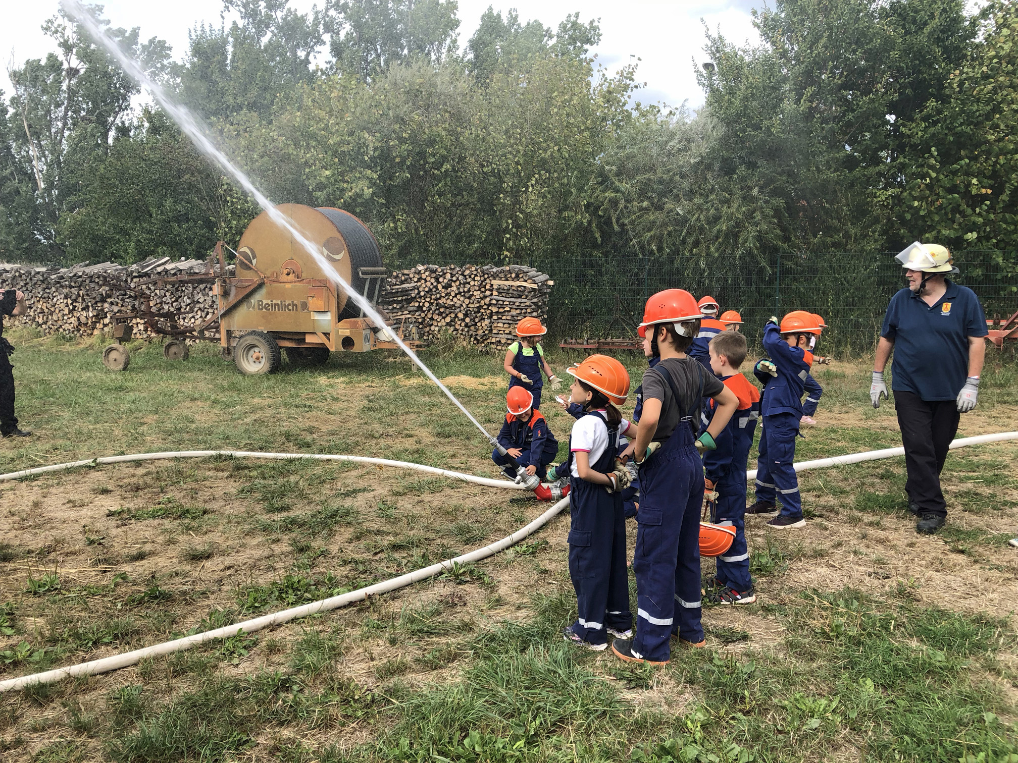 Zum Abschluss des Sommers wollen die Feuervögel noch einmal so richtig kräftig mit Wasser spritzen. Daher zapften sie einen Hydranten an und bauten einen Wasserwerfer. Als der Ruf "Wasser marsch!" ertönte, war der Wasserstrahl tatsächlich sehr beeindruckend und die Wiese freute sich über das zuletzt so seltene Nass von oben.