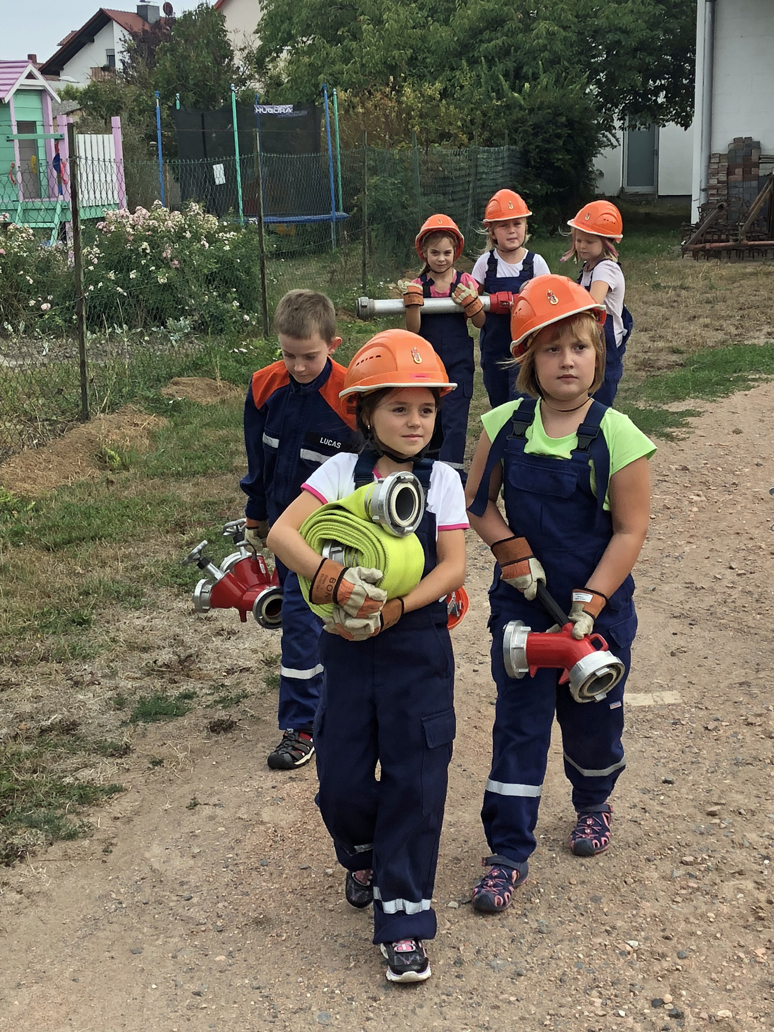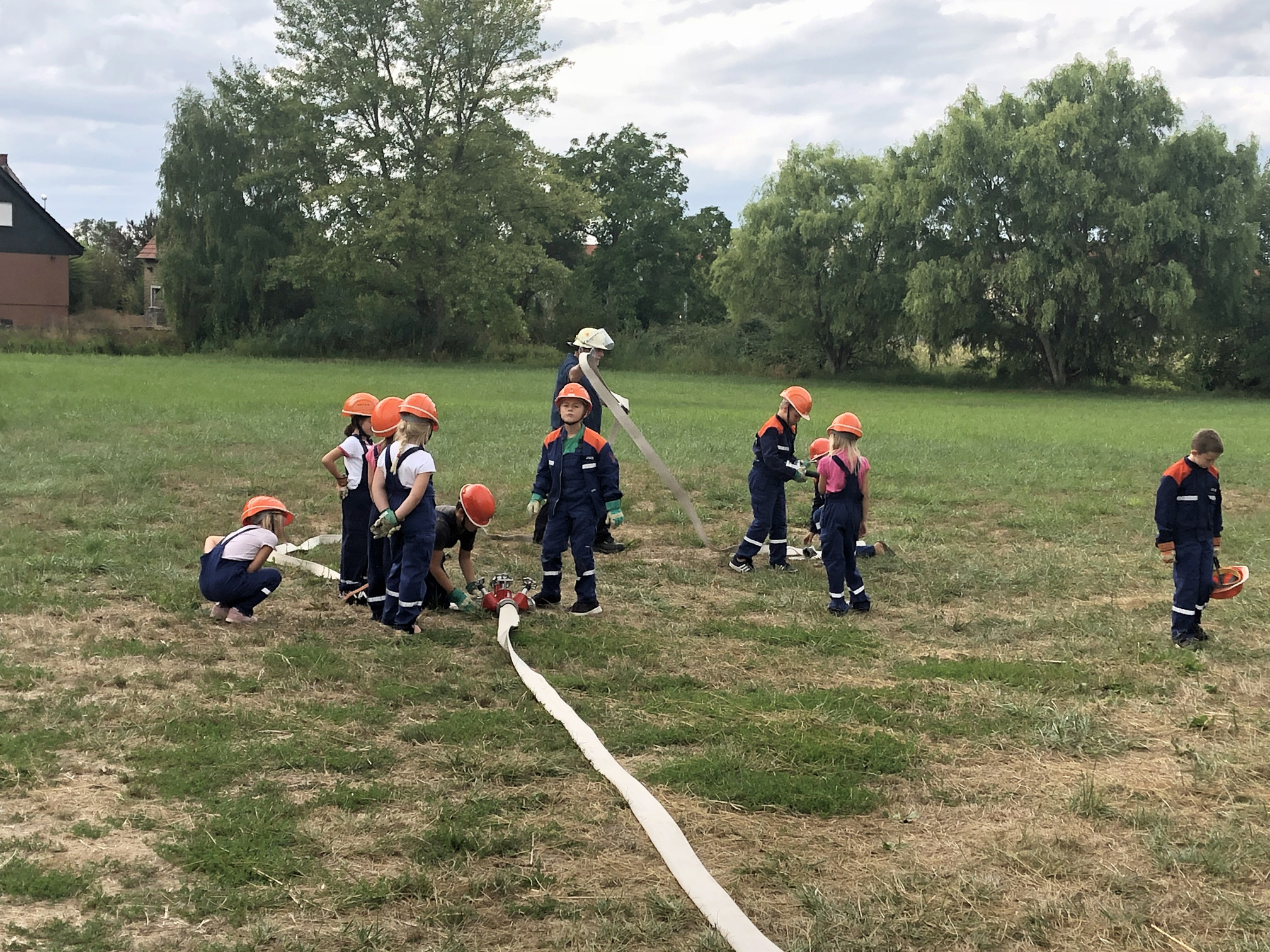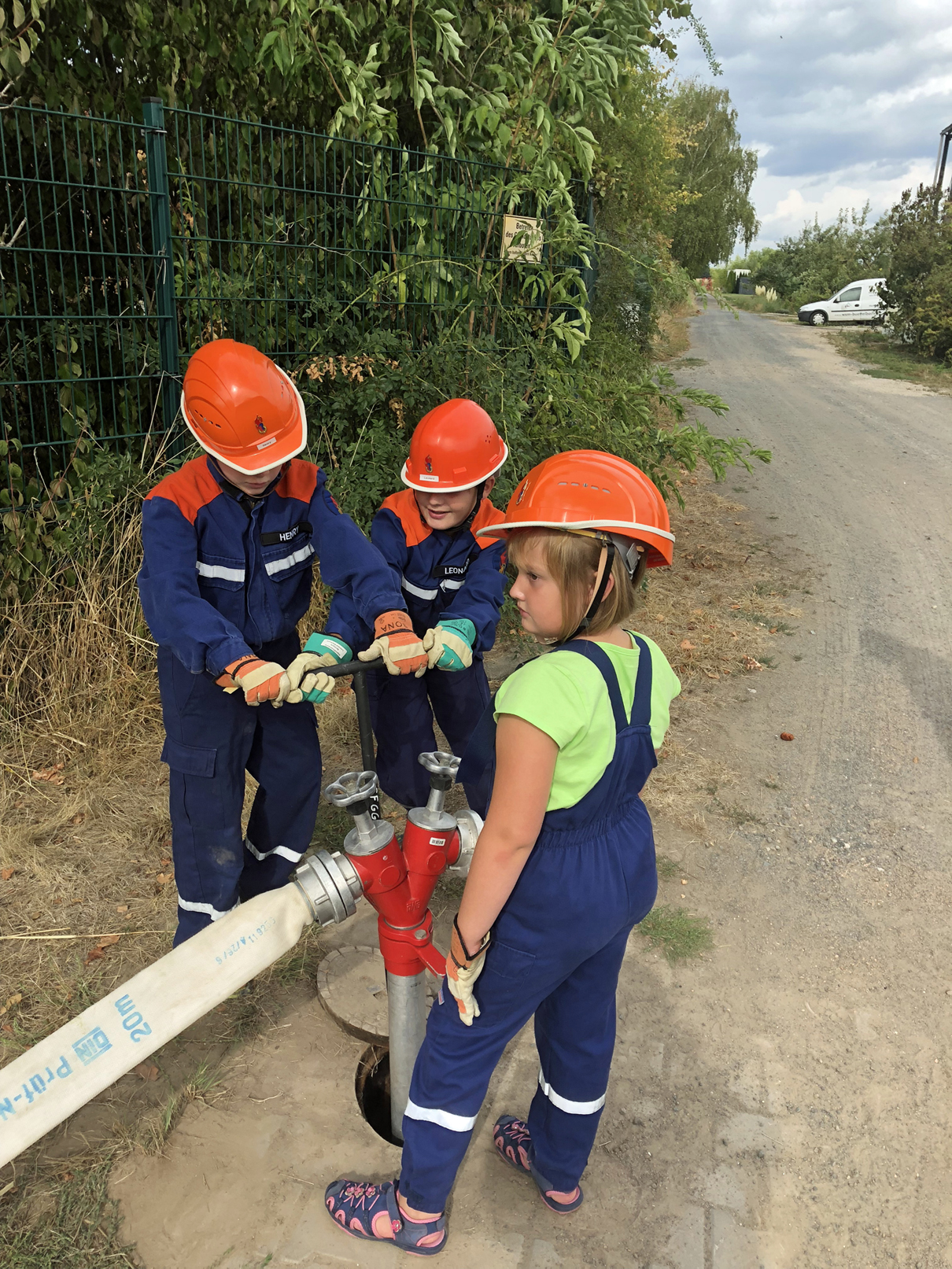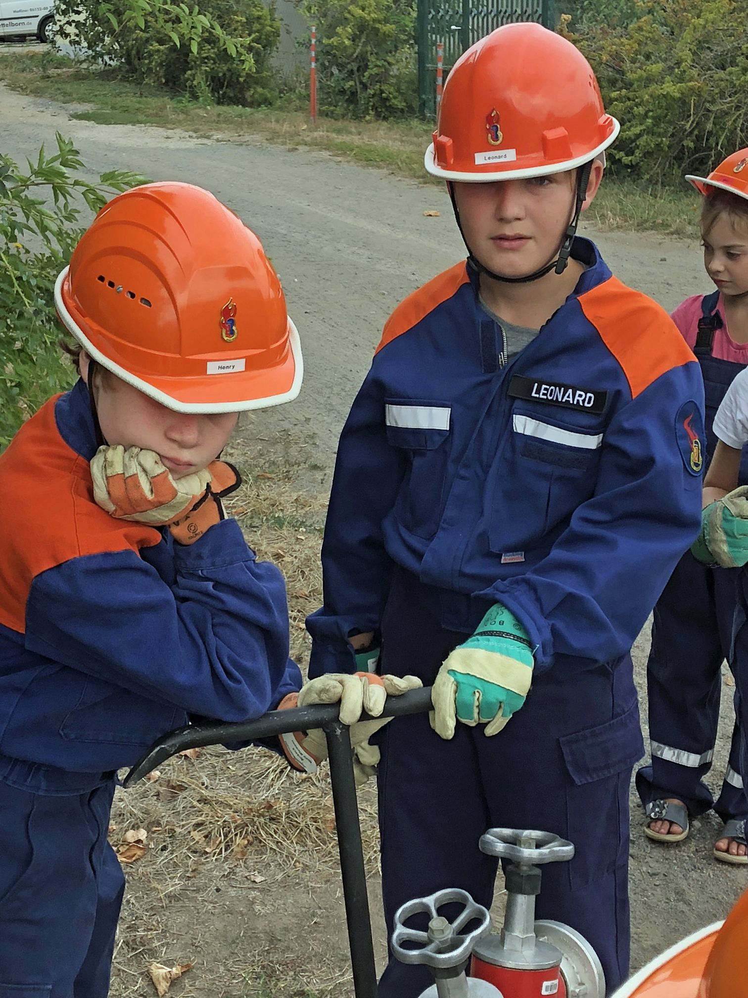 Zum Abschluss des Sommers wollen die Feuervögel noch einmal so richtig kräftig mit Wasser spritzen. Daher zapften sie einen Hydranten an und bauten einen Wasserwerfer. Als der Ruf "Wasser marsch!" ertönte, war der Wasserstrahl tatsächlich sehr beeindruckend und die Wiese freute sich über das zuletzt so seltene Nass von oben.