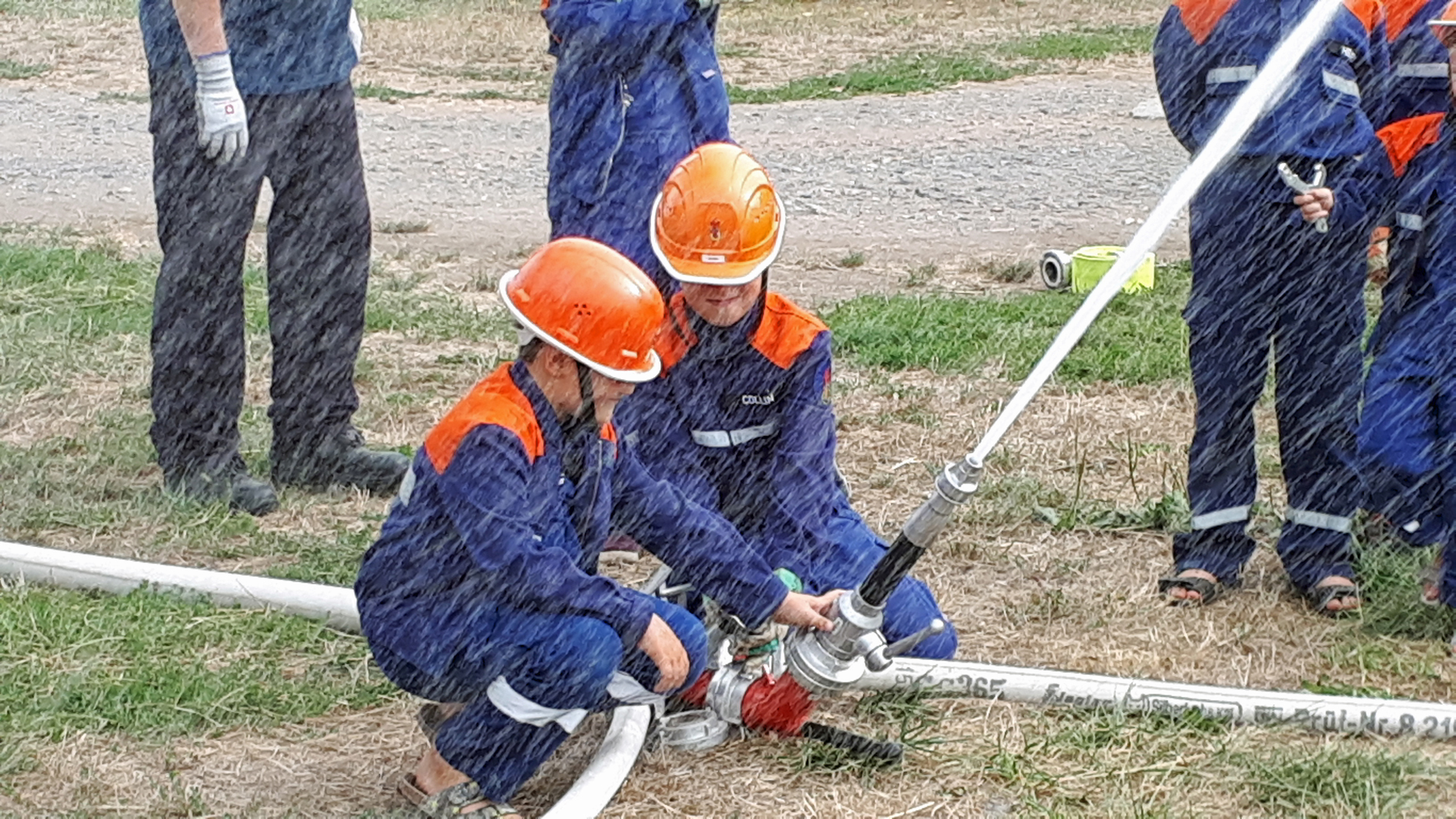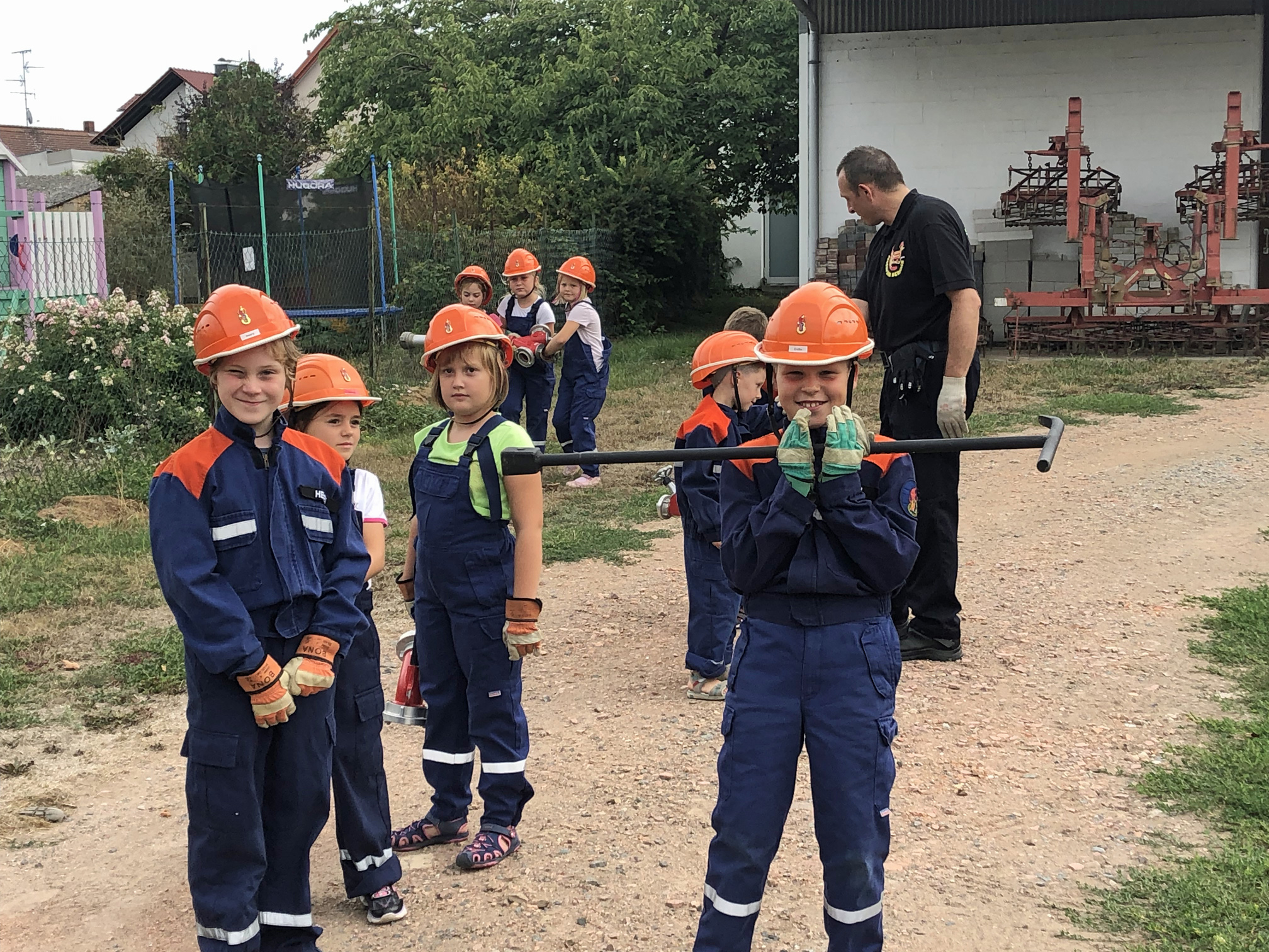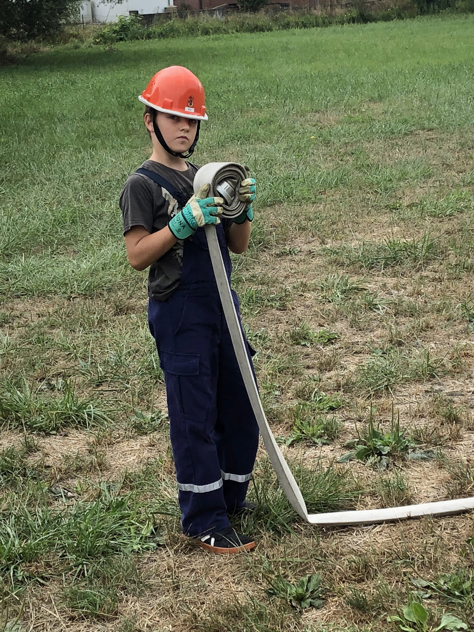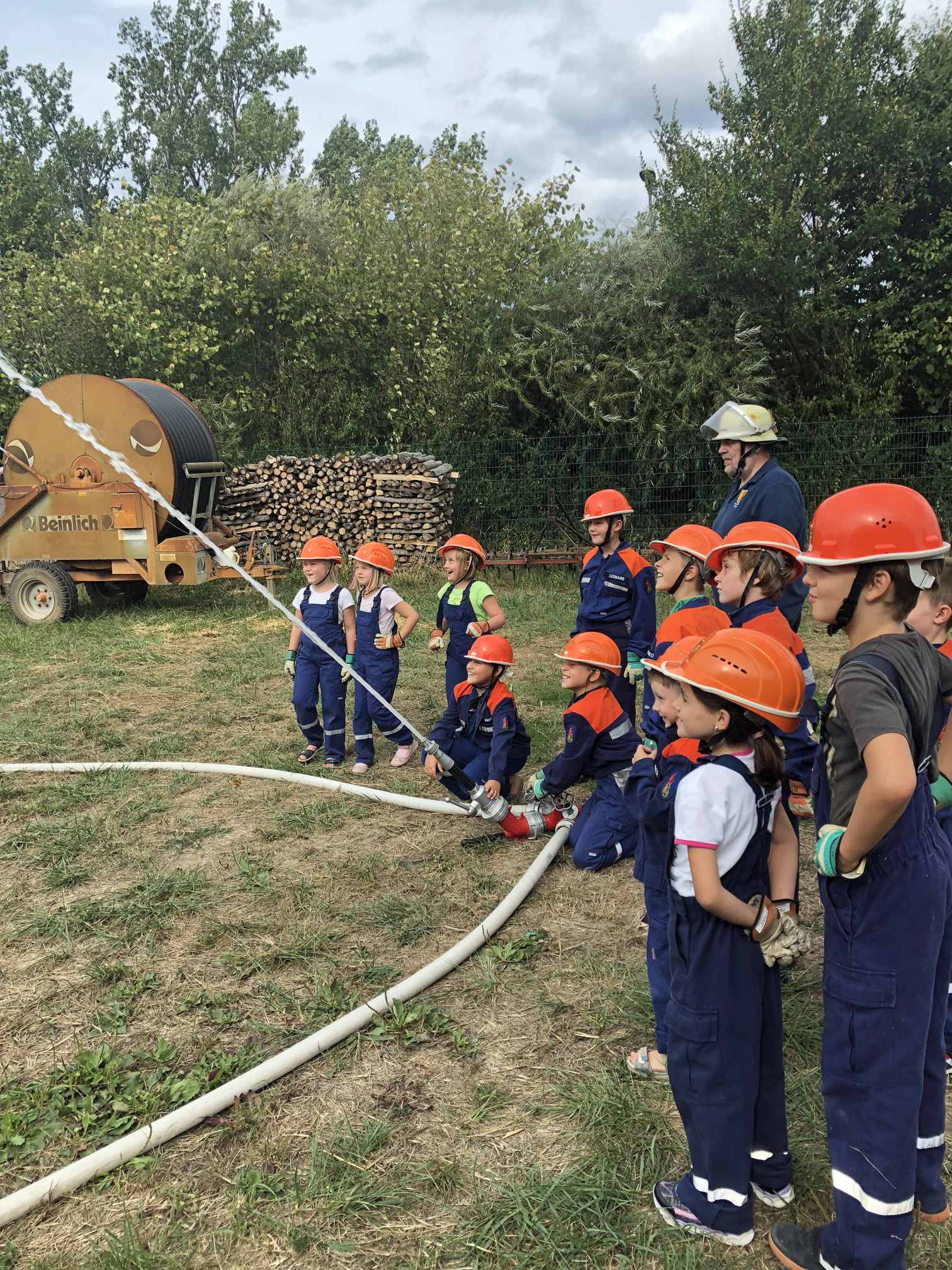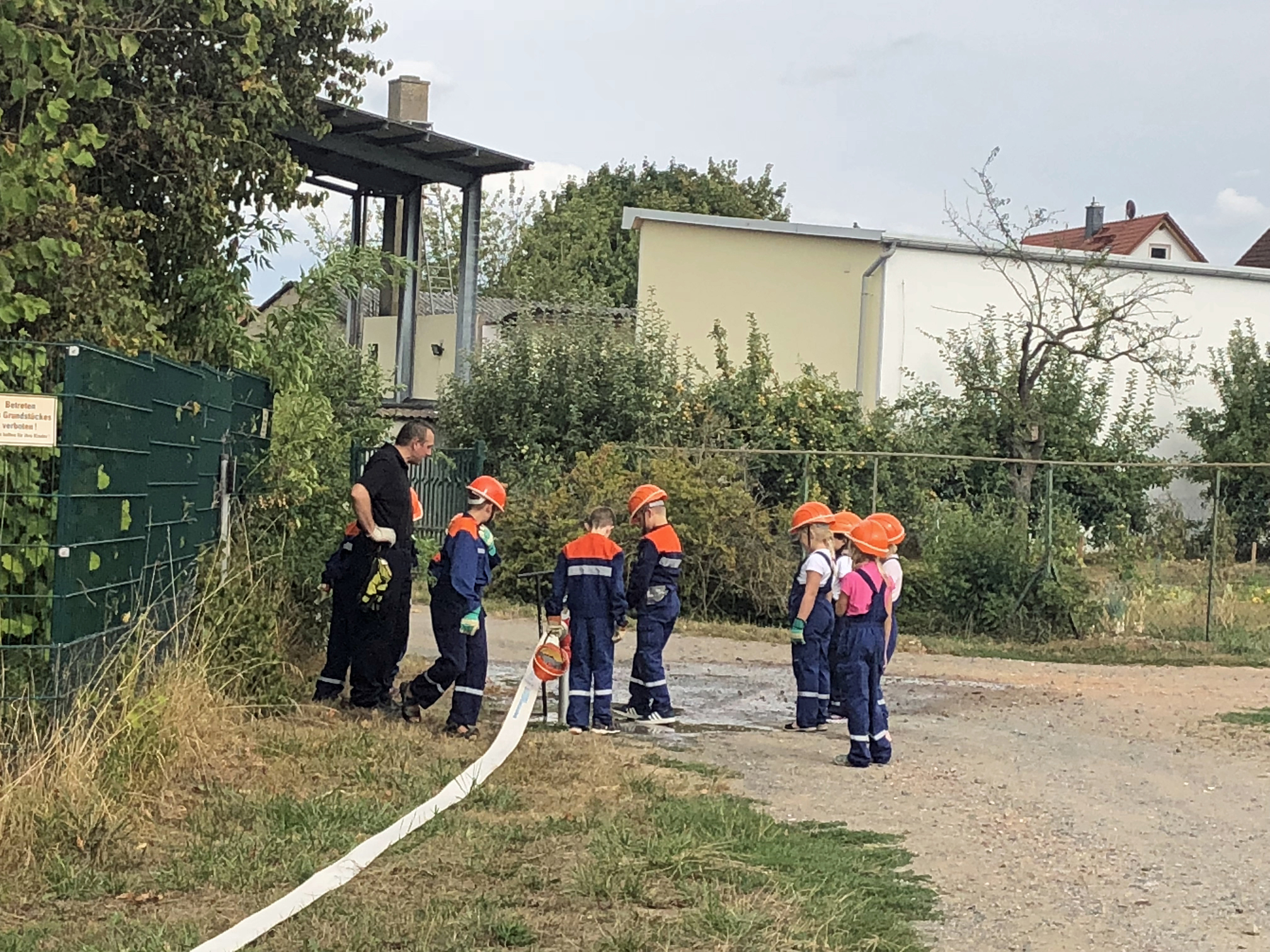Zum Abschluss des Sommers wollen die Feuervögel noch einmal so richtig kräftig mit Wasser spritzen. Daher zapften sie einen Hydranten an und bauten einen Wasserwerfer. Als der Ruf "Wasser marsch!" ertönte, war der Wasserstrahl tatsächlich sehr beeindruckend und die Wiese freute sich über das zuletzt so seltene Nass von oben.